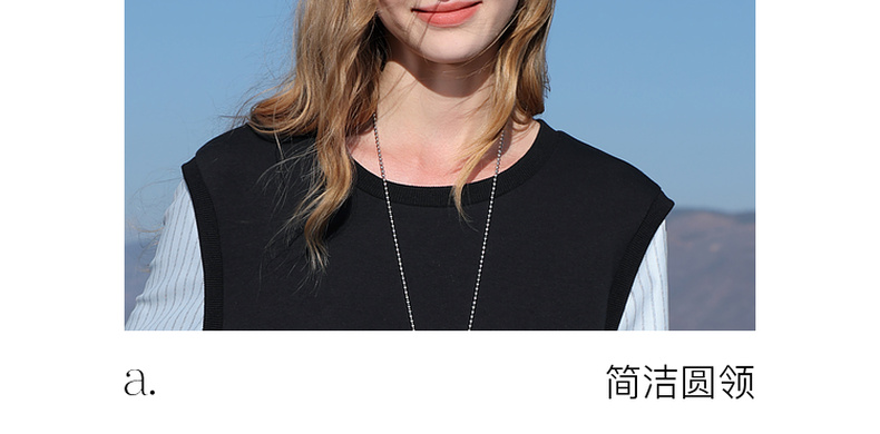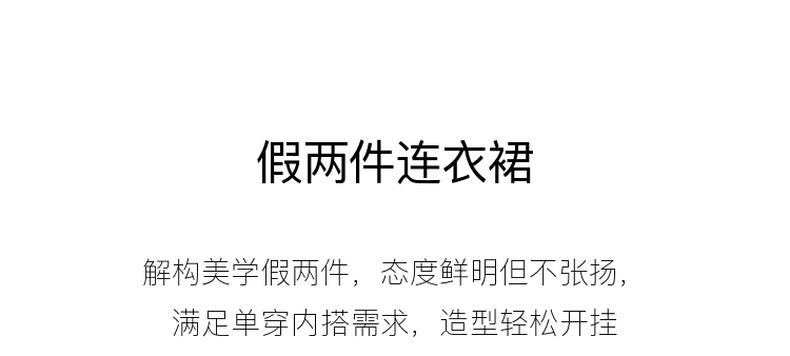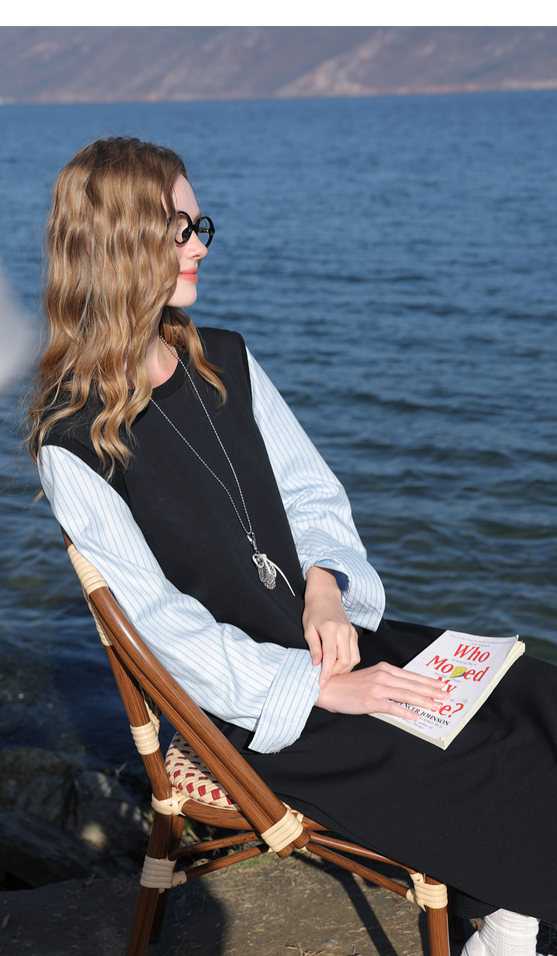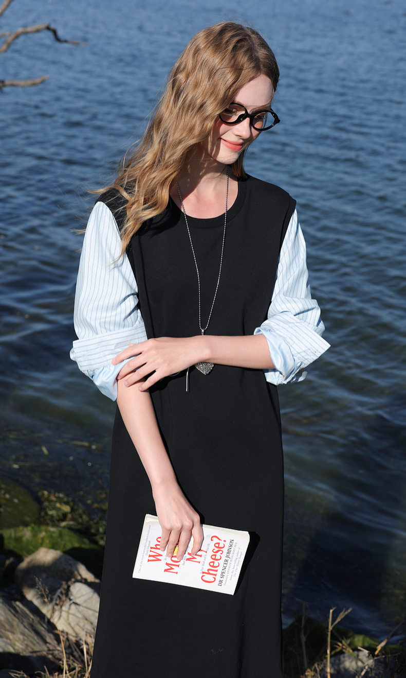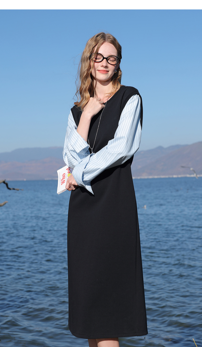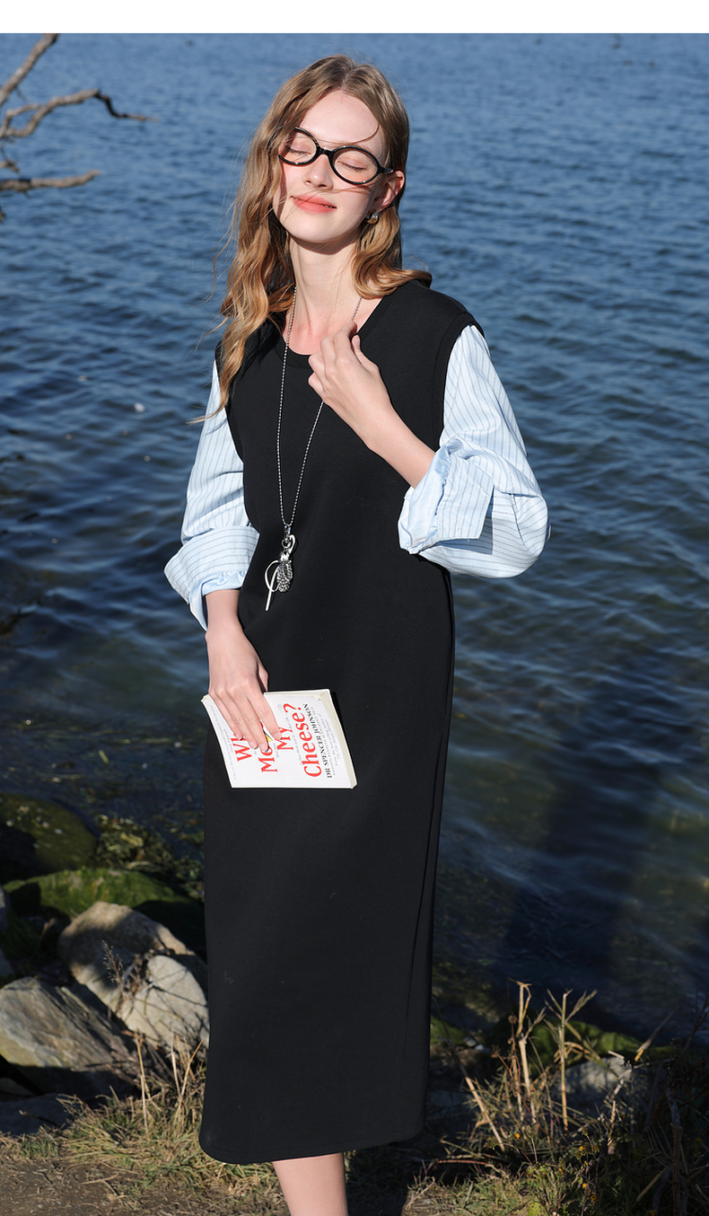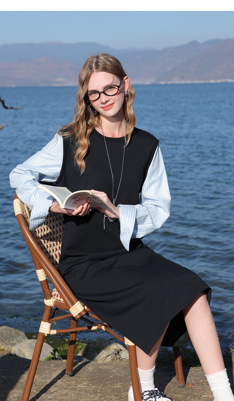 三彩2026春季新款条纹长袖假两件连衣裙宽松圆领直筒裙长裙M