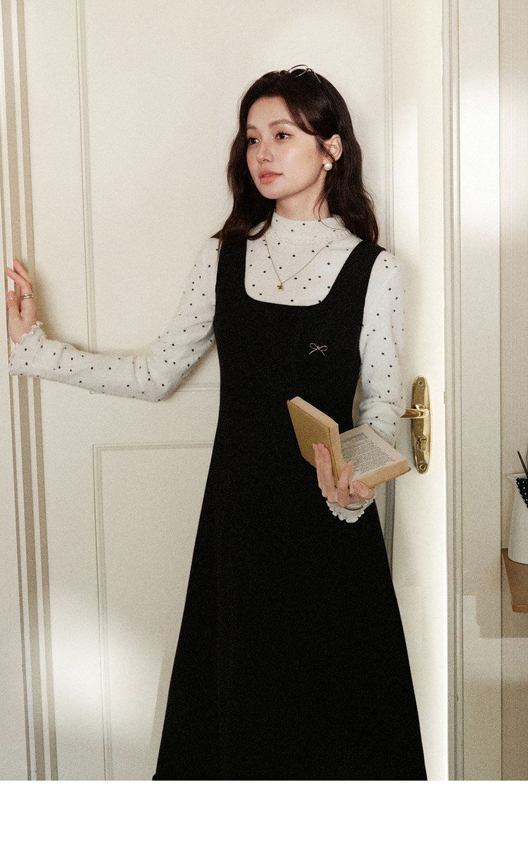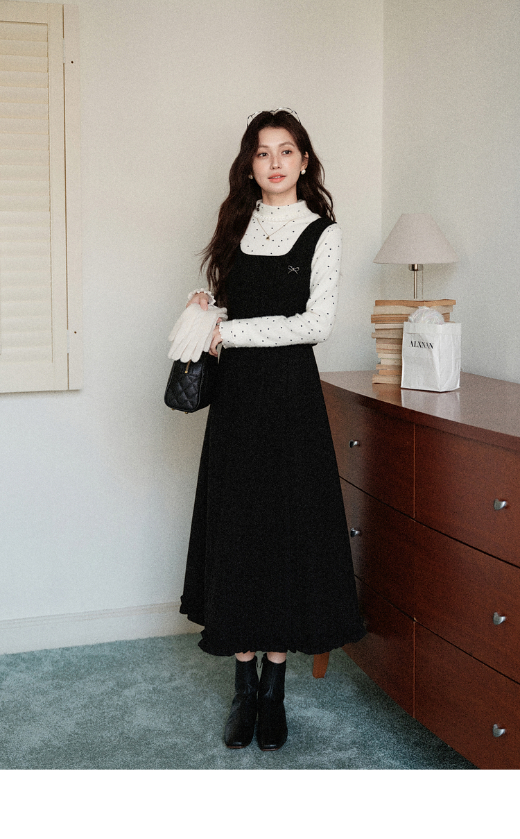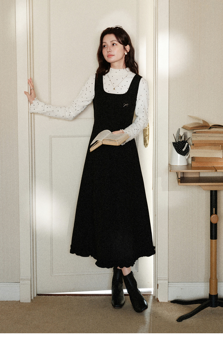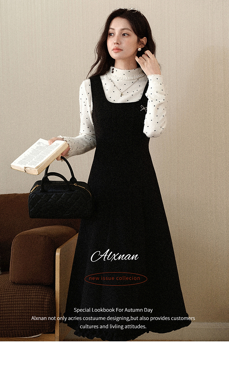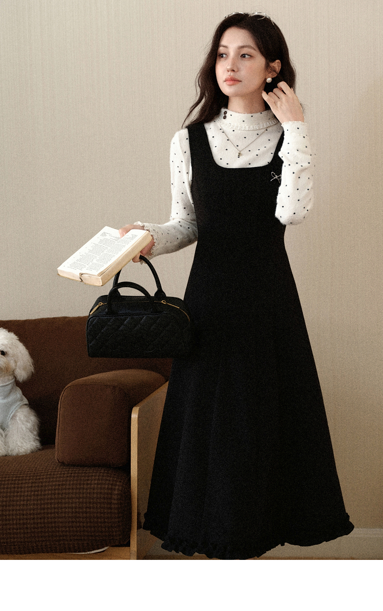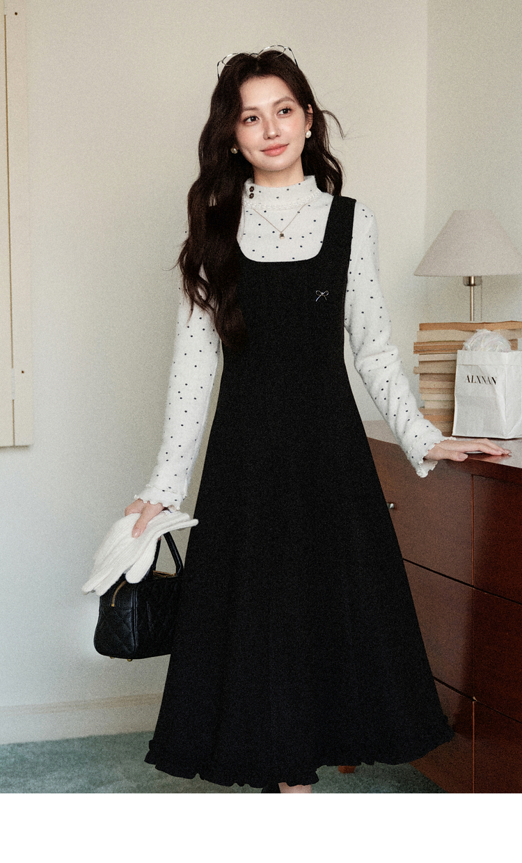 鹿向南「墨色絮章」黑色吊带连衣裙女方领秋冬季温柔风长款连衣裙