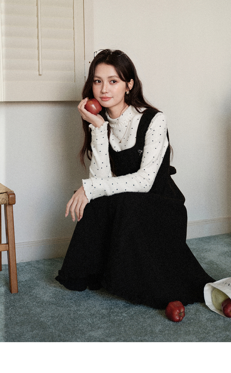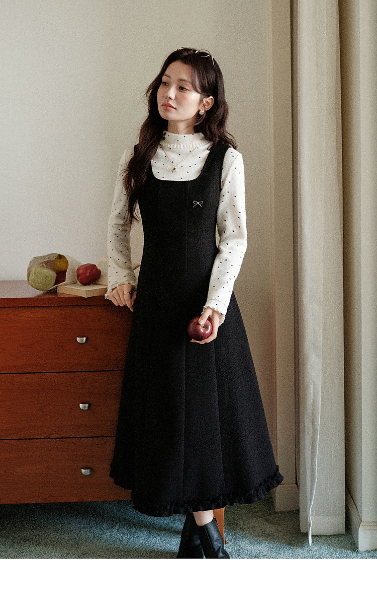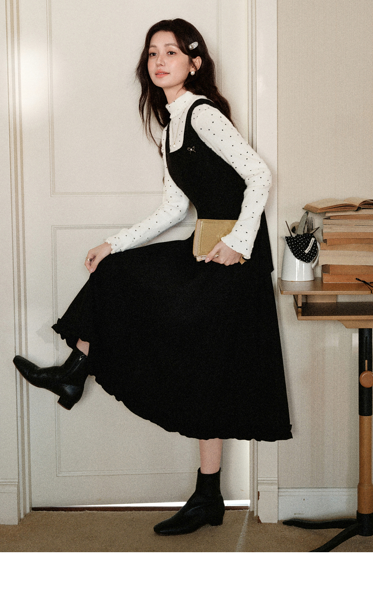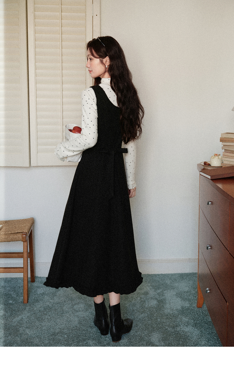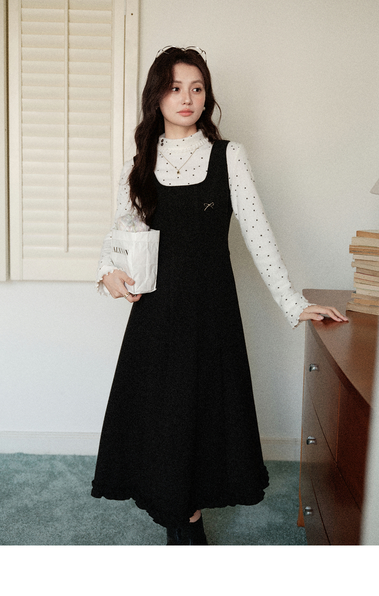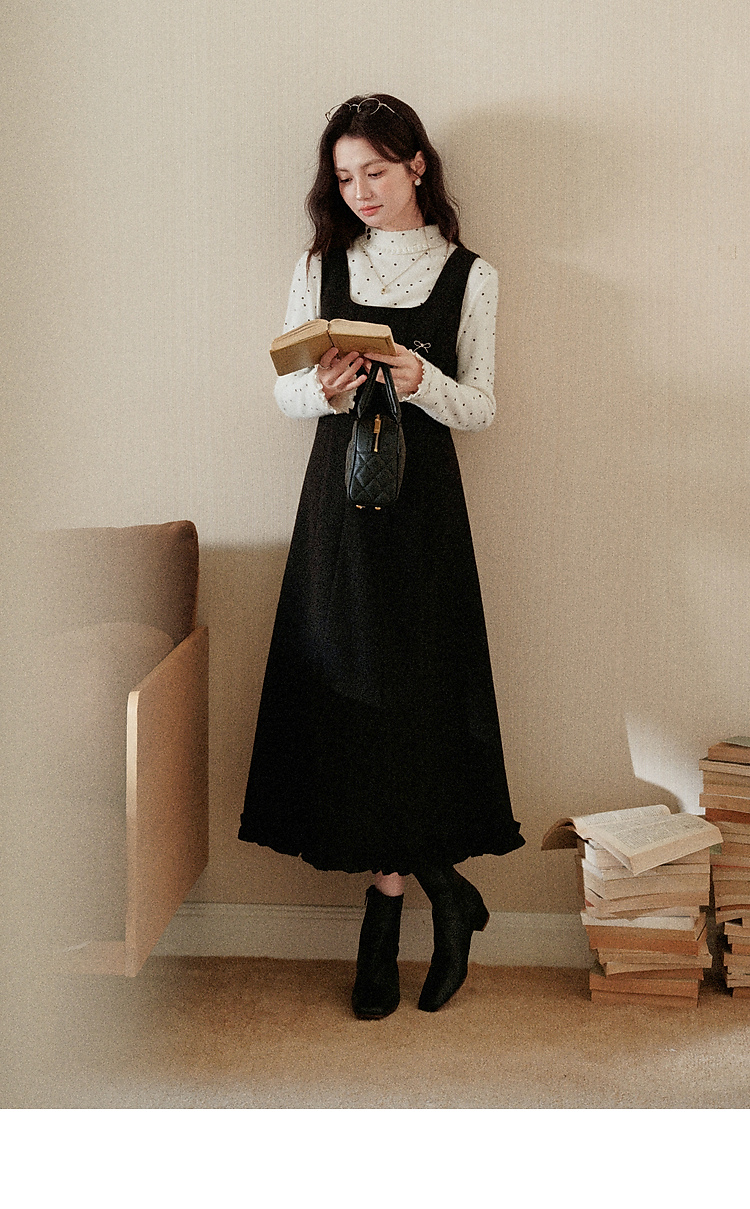 鹿向南「墨色絮章」黑色吊带连衣裙女方领秋冬季温柔风长款连衣裙