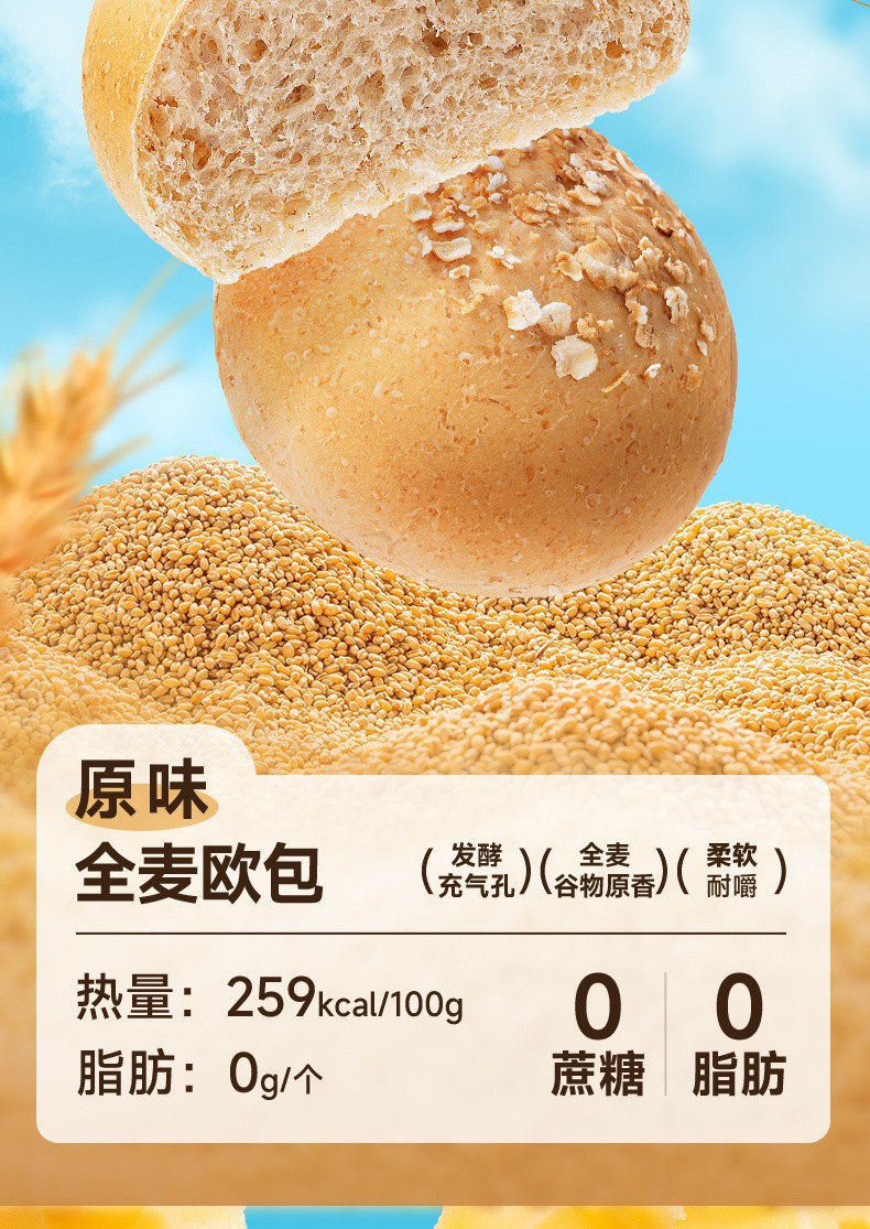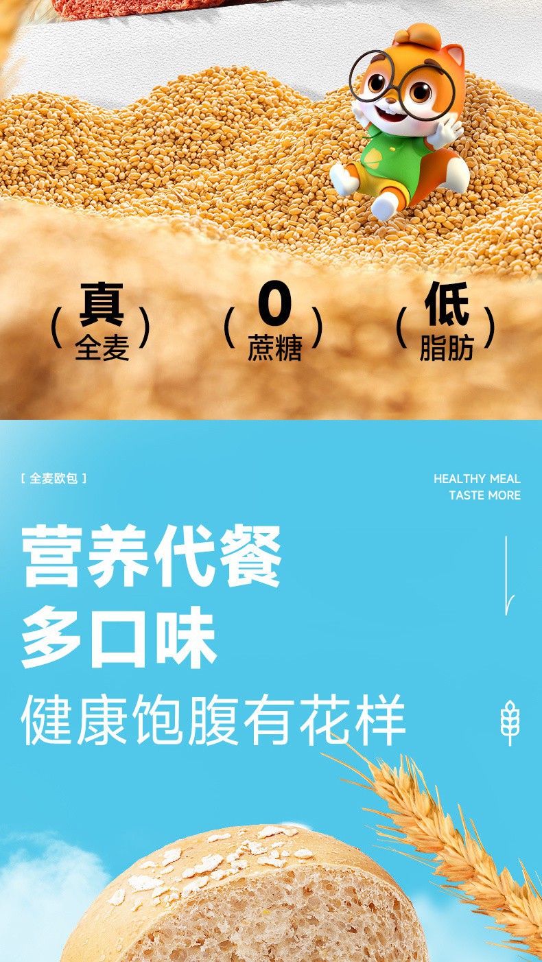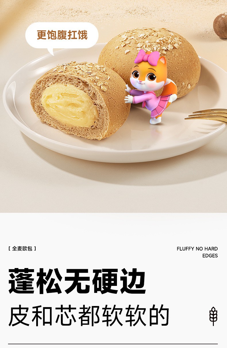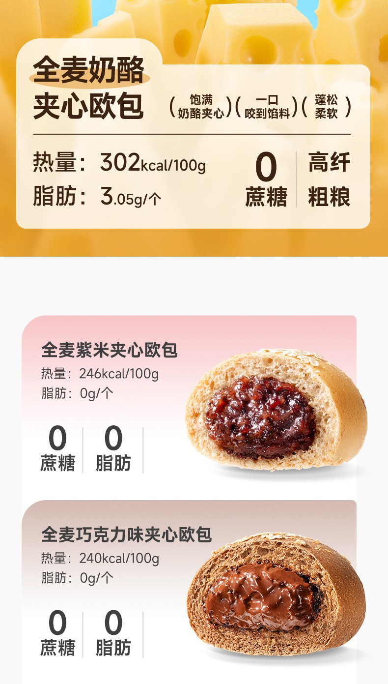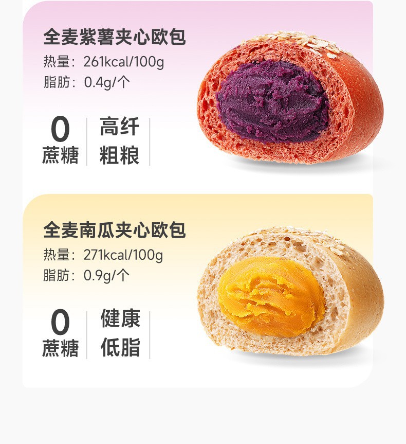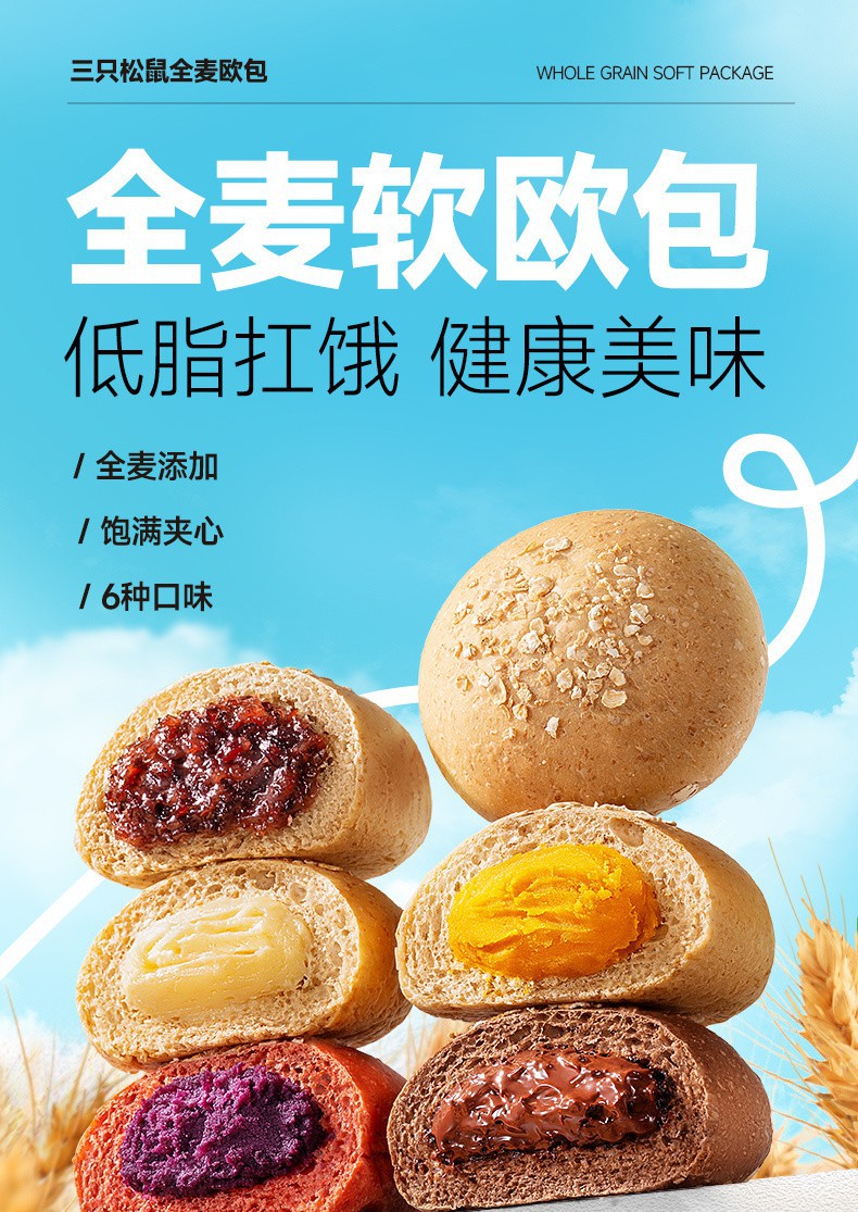 三只松鼠 全麦欧包 500g 紫薯南瓜巧克力低脂 0脂肪超软夹心早餐面包 全麦软欧包 低脂扛饿 健康美味