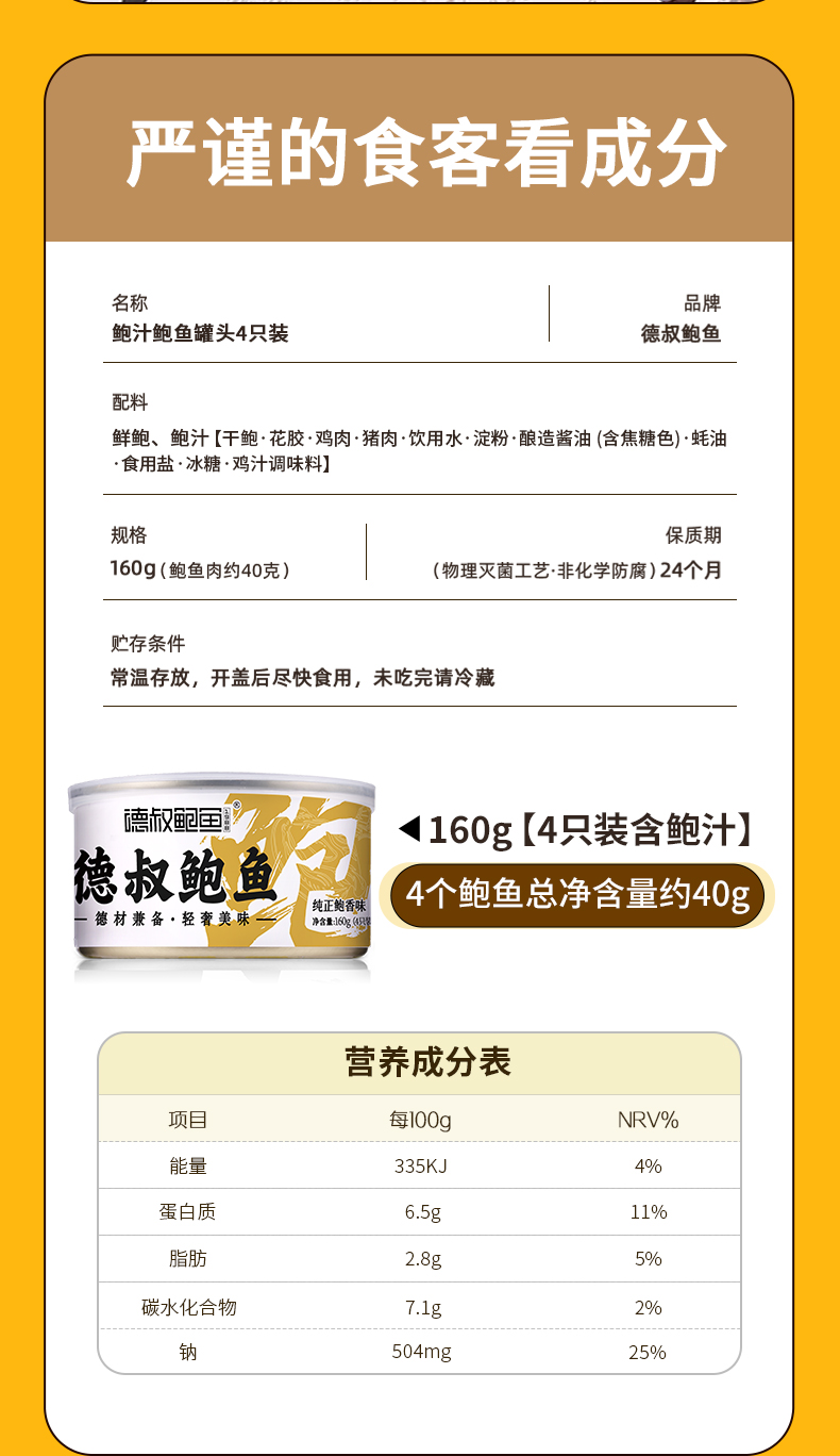 德叔鲍鱼鲍汁鲍鱼罐头160g/罐*2罐