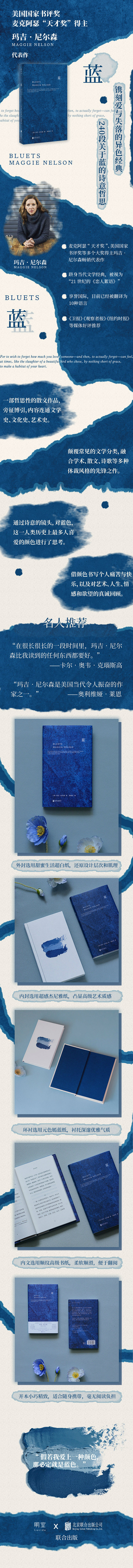 蓝》是一部哲思性的散文作品,由240段关于蓝色的随笔组成。玛吉·尼尔森通过诗一样的语言,以及对文学史、文化史、艺术史的旁征博引,对蓝色,这一人类历史上多人喜爱的颜色进行了思考。她不仅仅将蓝色与文学、艺术相连,更将其与自身的个人磨难、爱与渴求进行勾连,完成了一部奇妙又无法定义的蓝色之书。