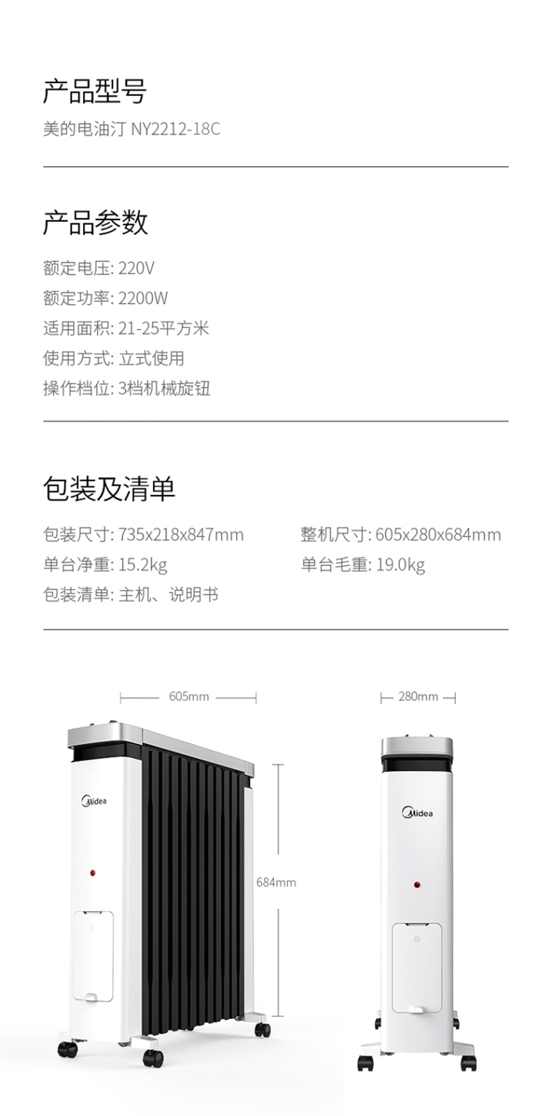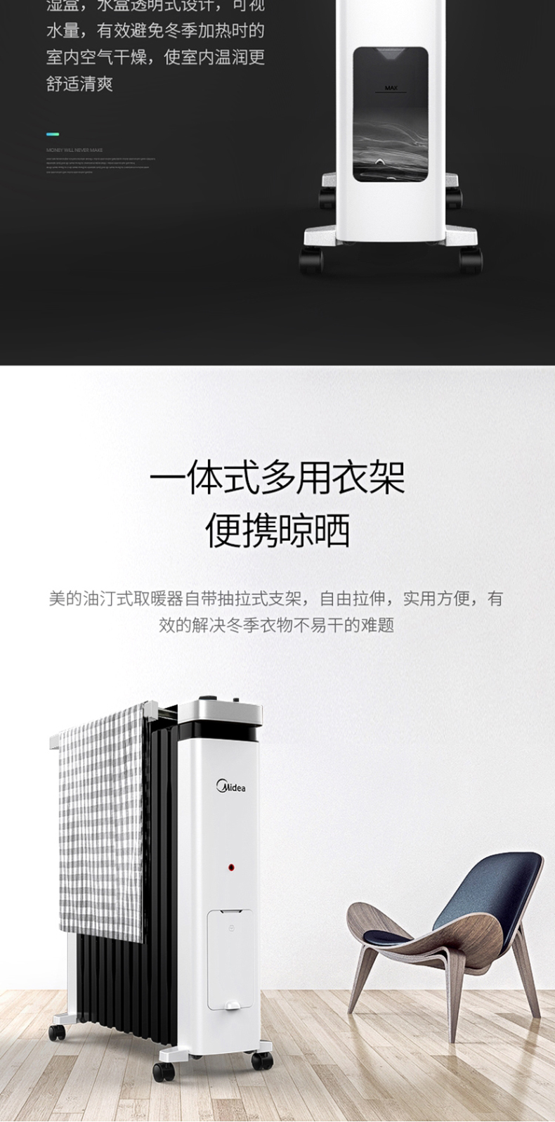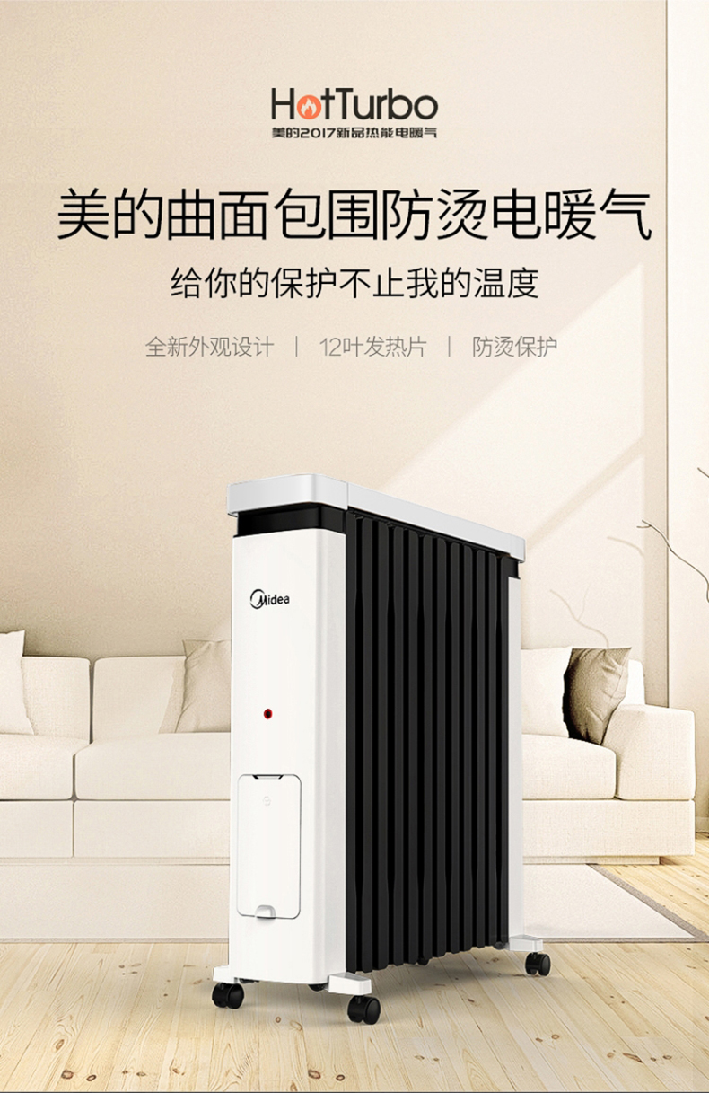 美的(Midea) NY2212-18C油汀电暖取暖器加湿盒烤火炉办公室卧室加宽暖气片电暖器儿童防烫2200W(线下同款)