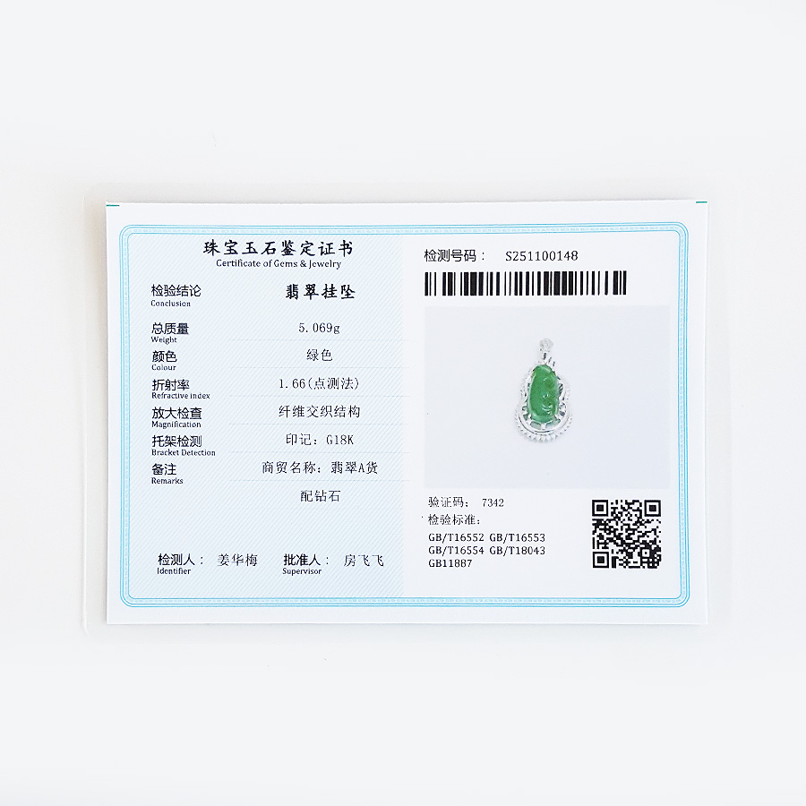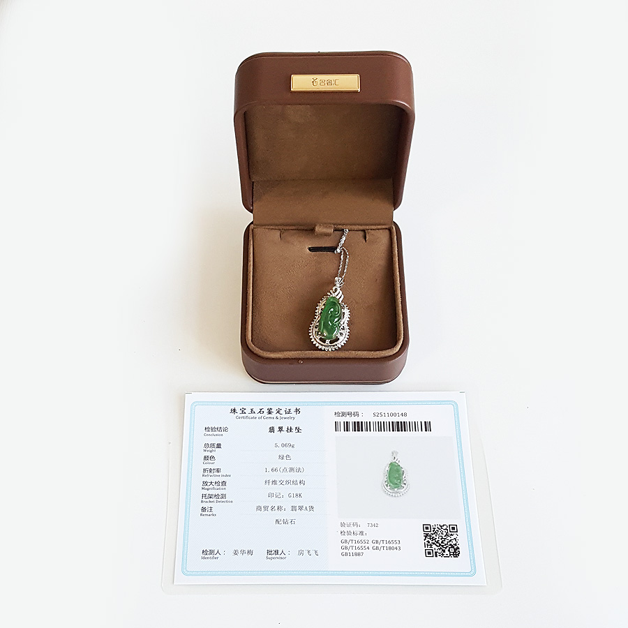 【天然正品】A货翡翠AU750白金豪镶钻镶天然细腻冰种满绿如意(万事如意)翡翠吊坠项链链长:45CM(长度可调节)女士281025AH24