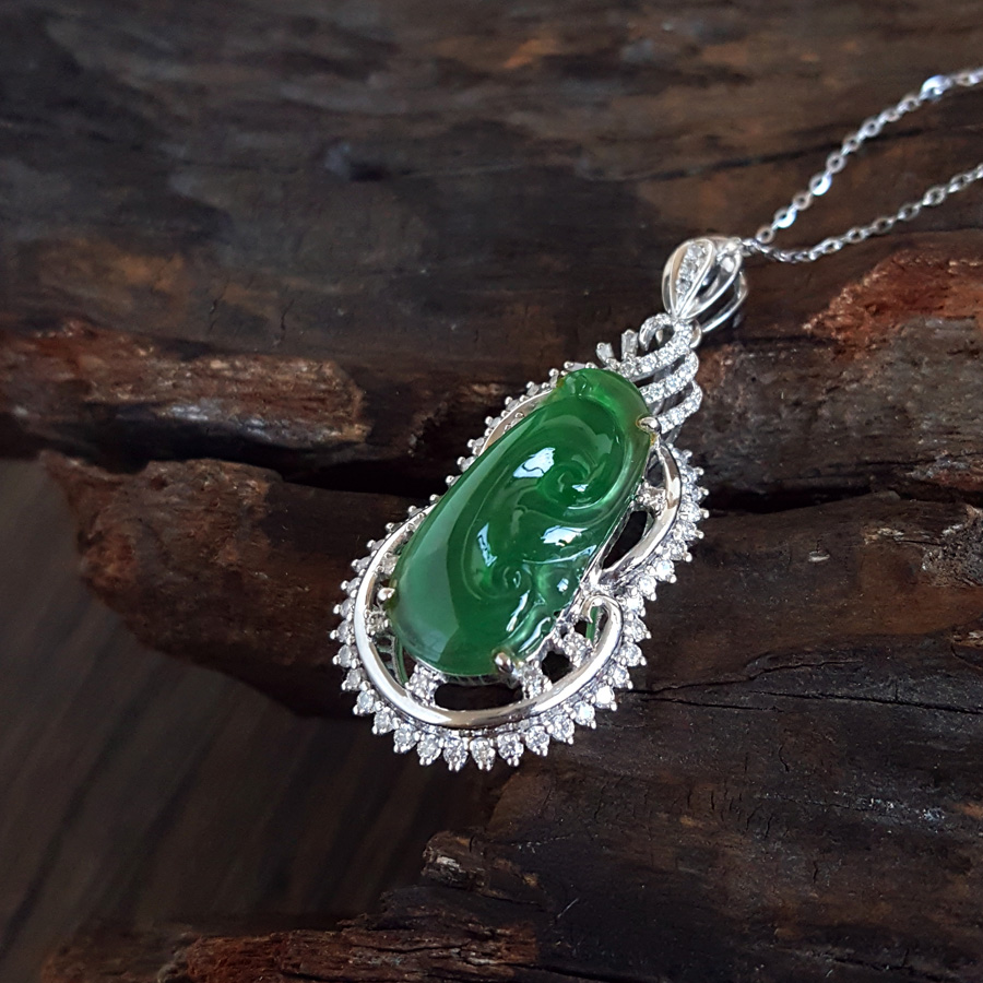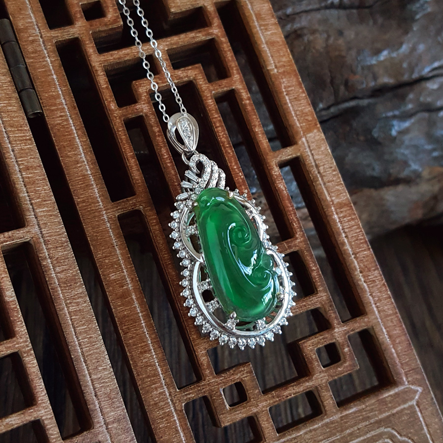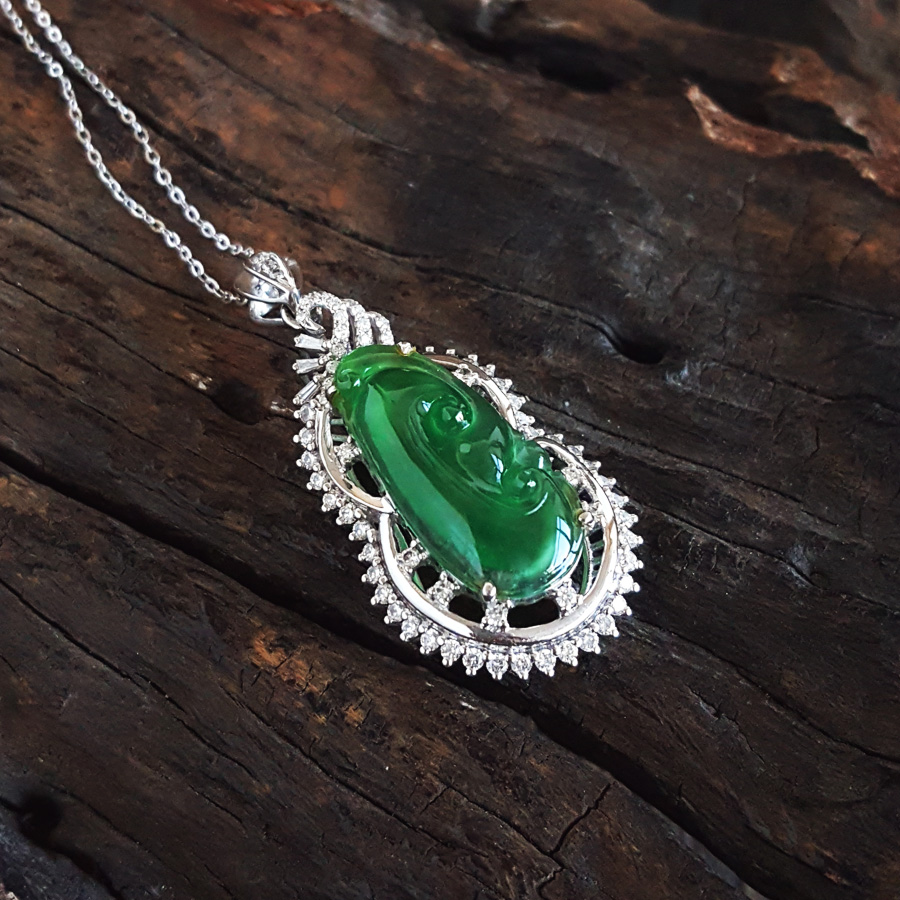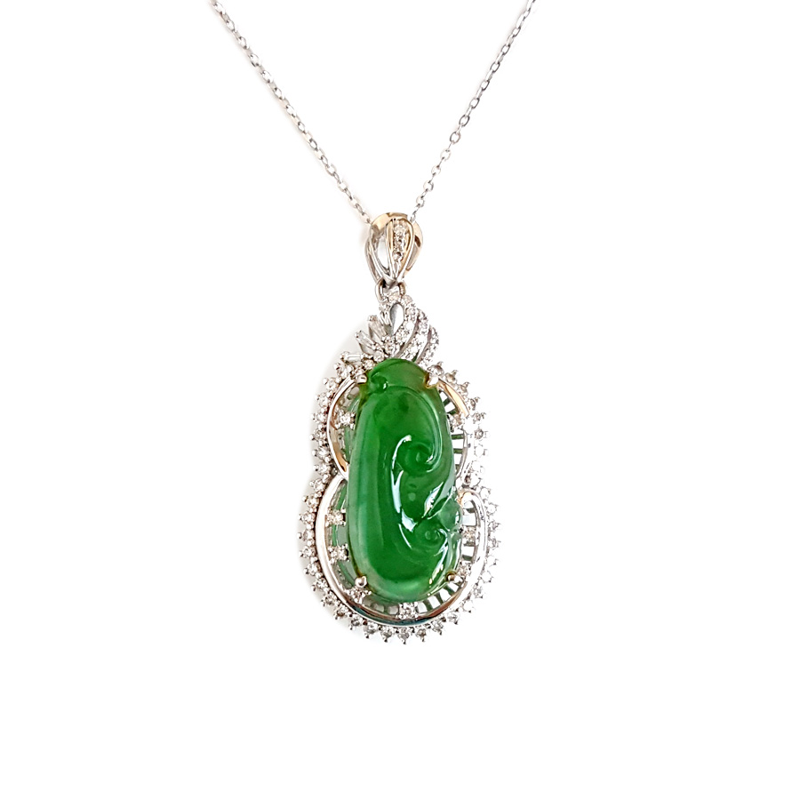 名称 | AU750白金豪镶钻镶天然细腻冰种满绿如意(万事如意)翡翠吊坠项链 |