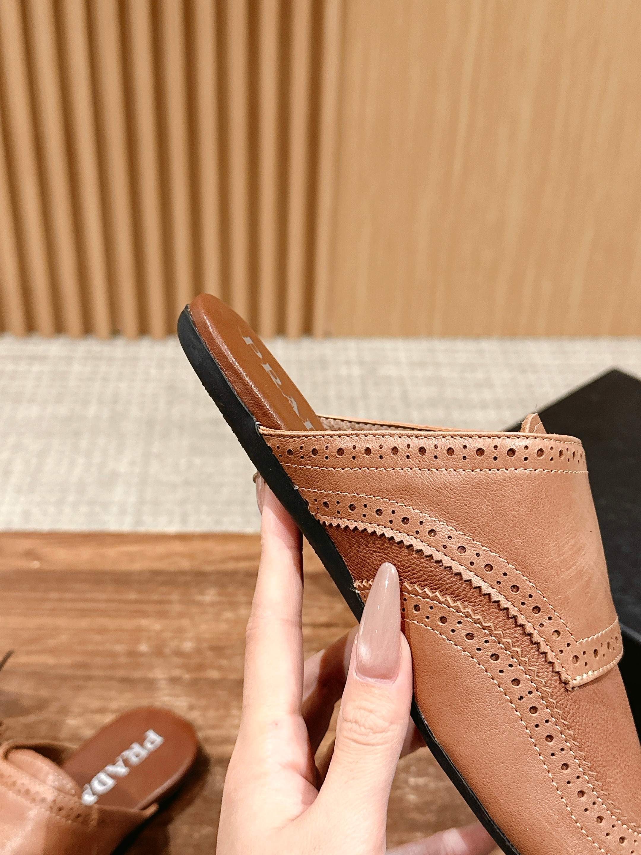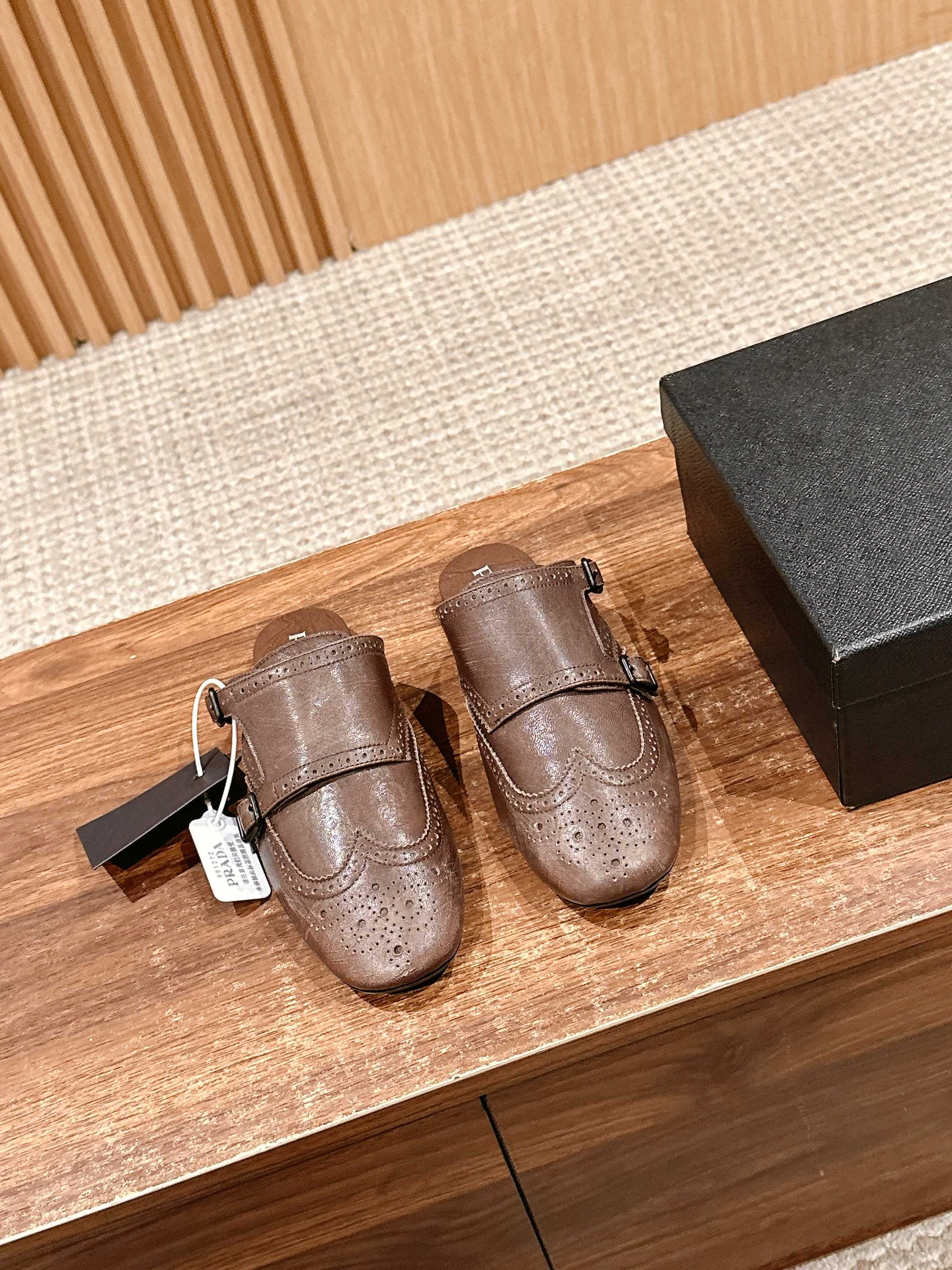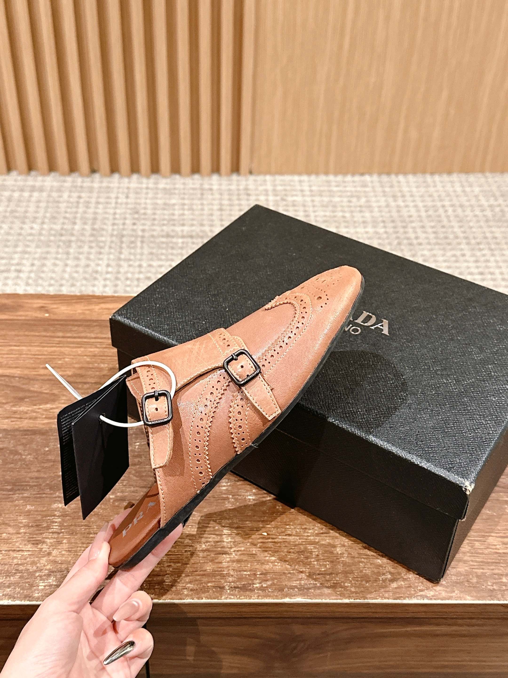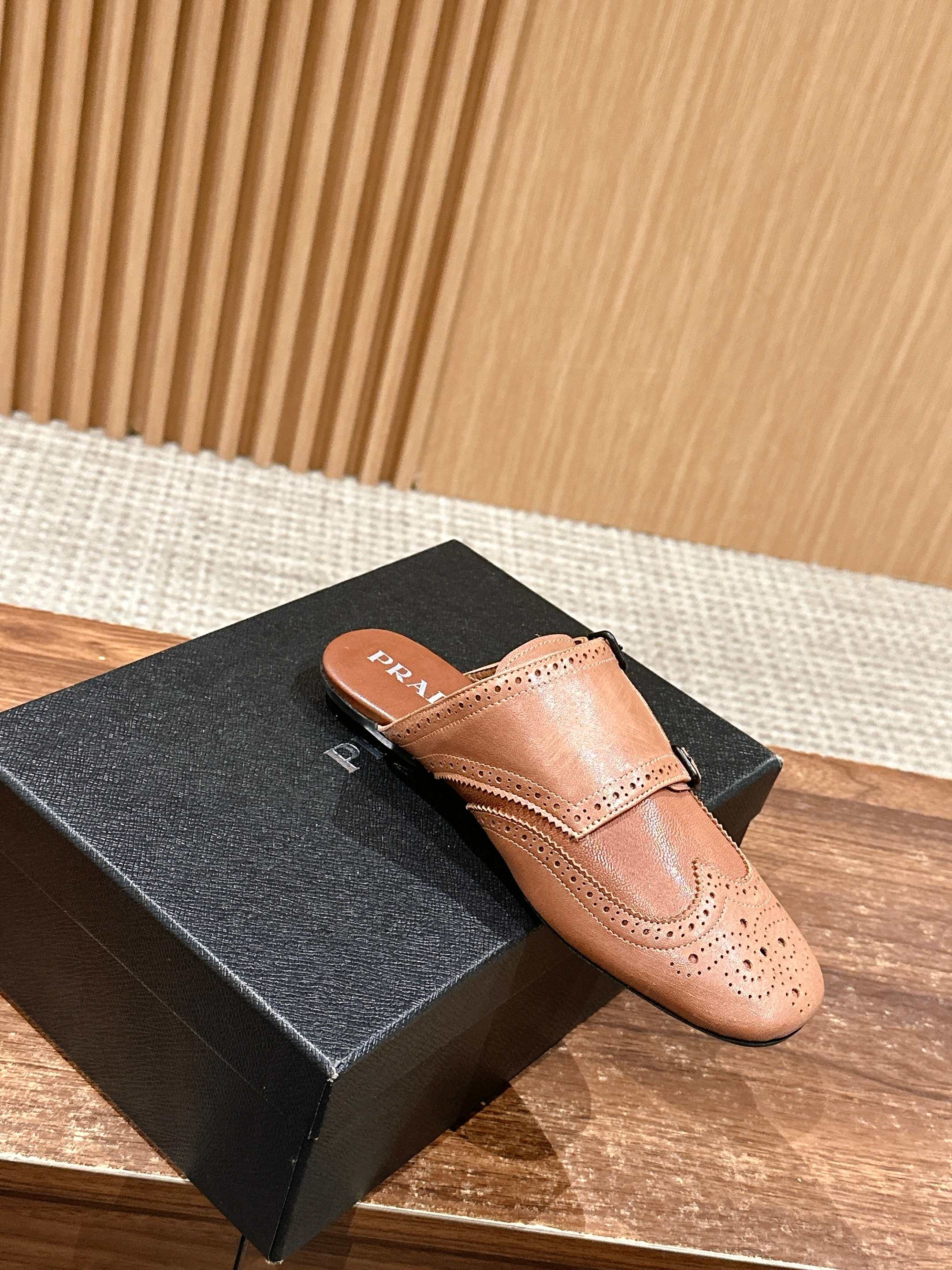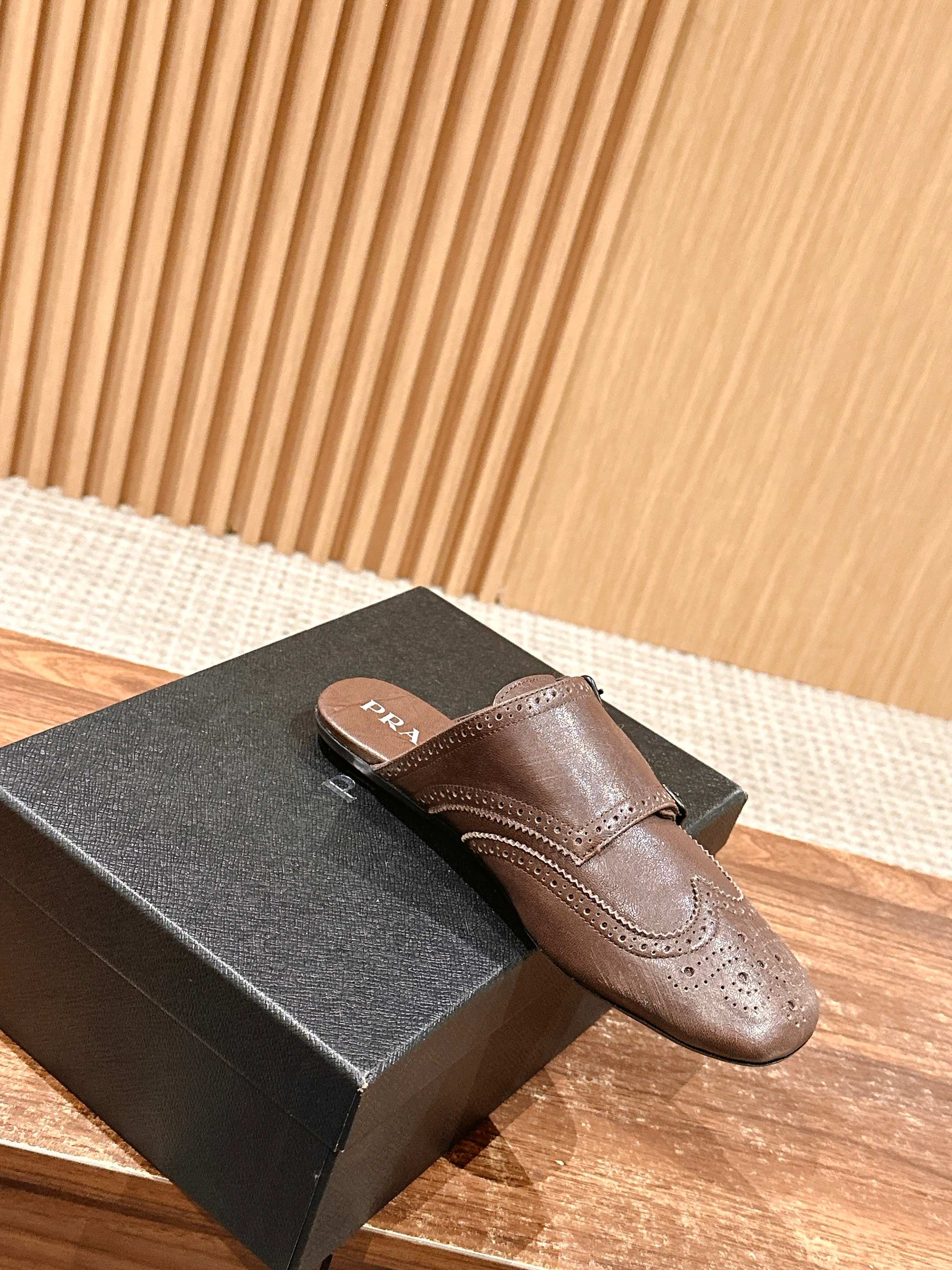 𝐏𝐑𝐀𝐃𝐀 𝟮𝟬𝟮𝟱/𝐬𝐬普拉达走秀款复古流苏鞋布洛克雕花一脚蹬半拖