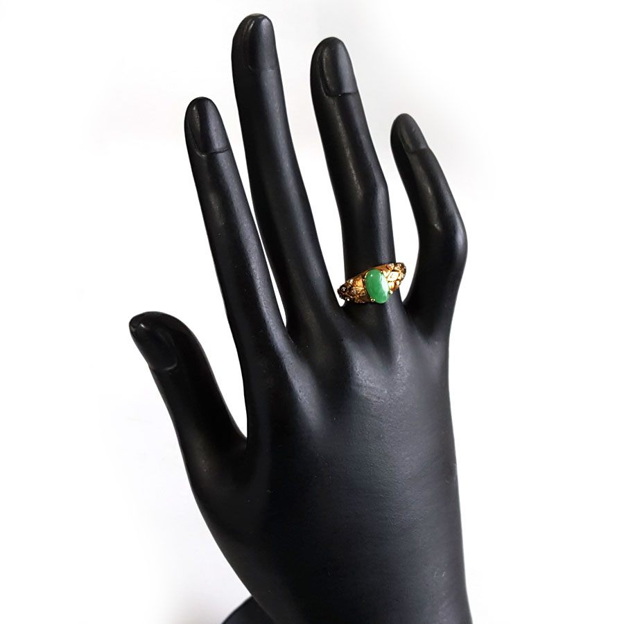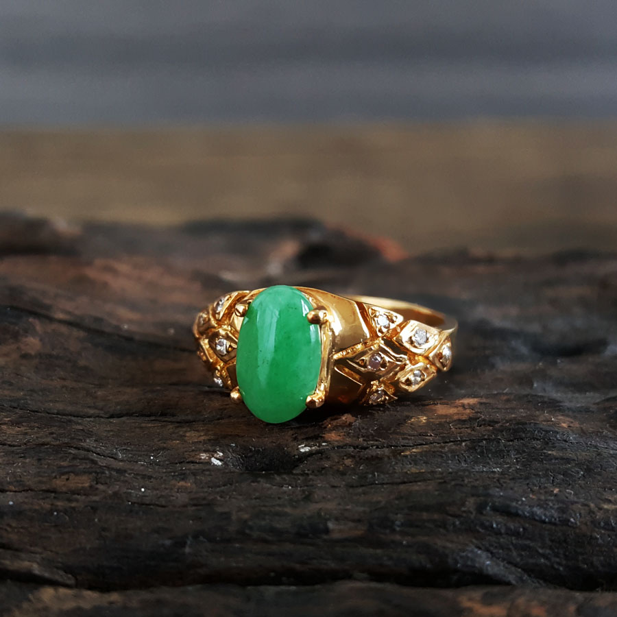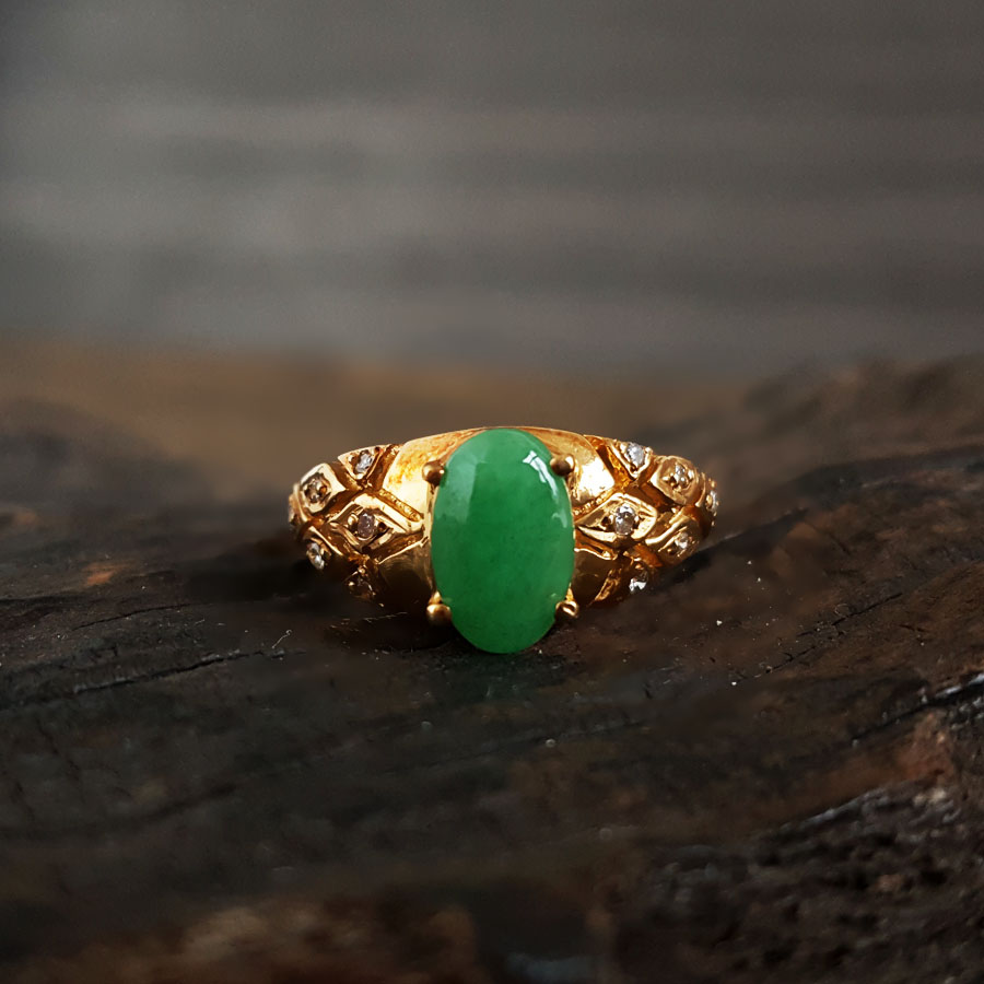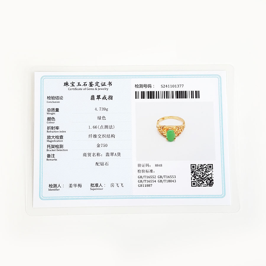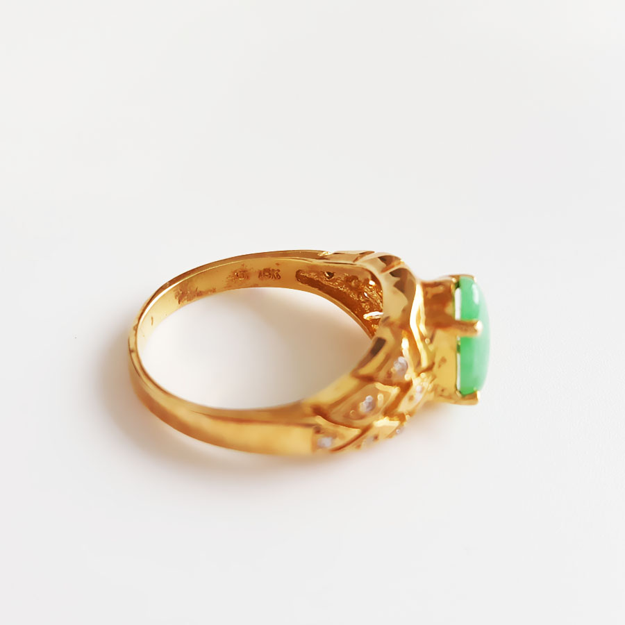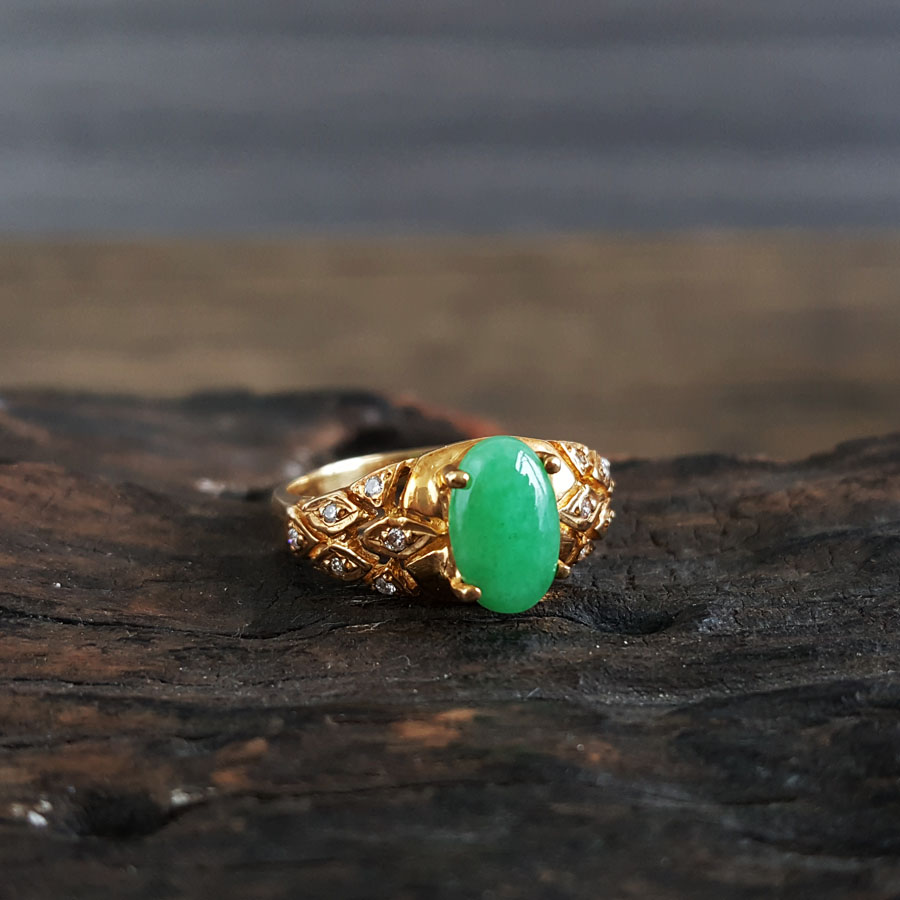 名称 | AU750黄金镶钻镶天然糯种满绿蛋面翡翠戒指 |