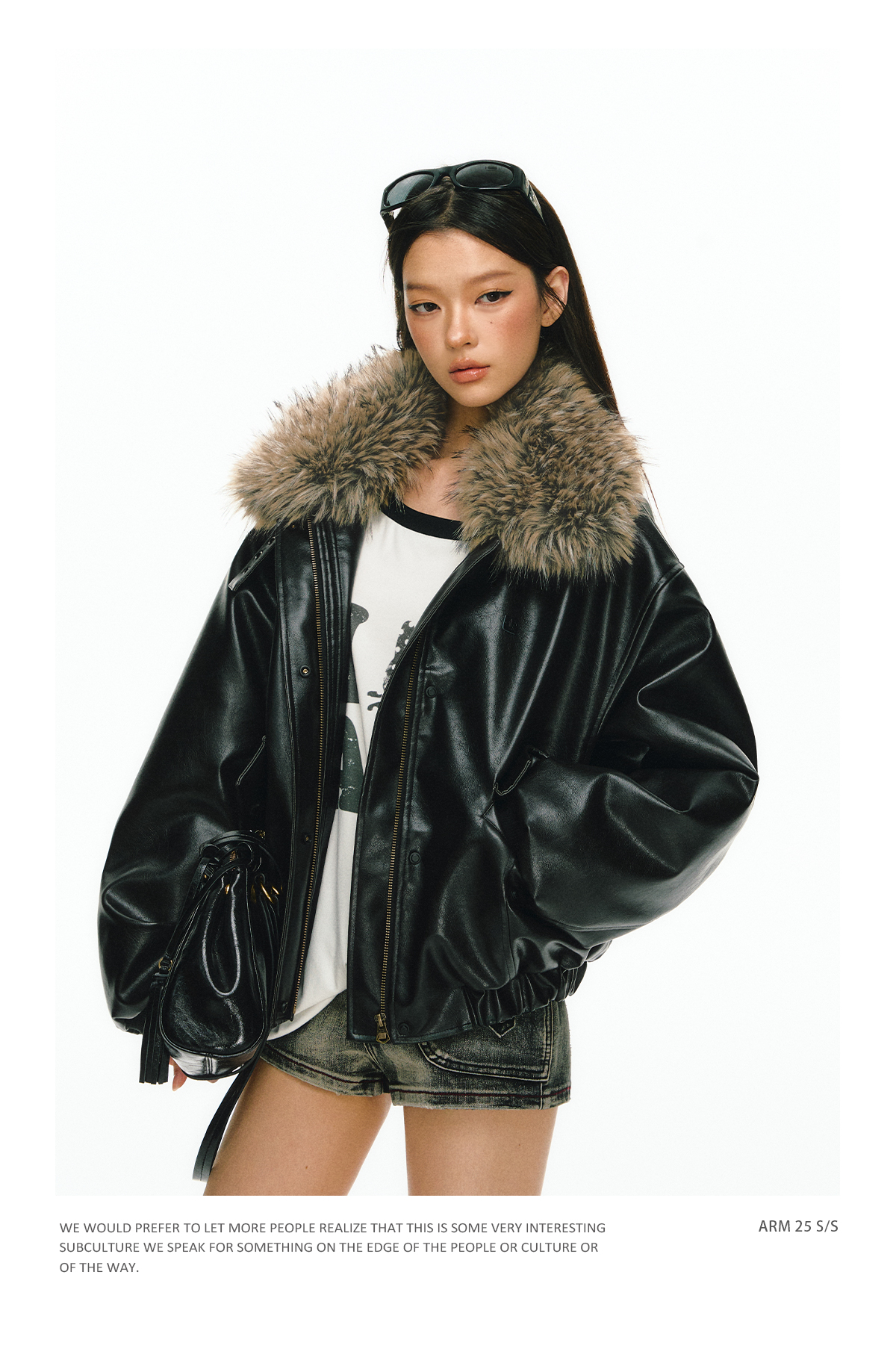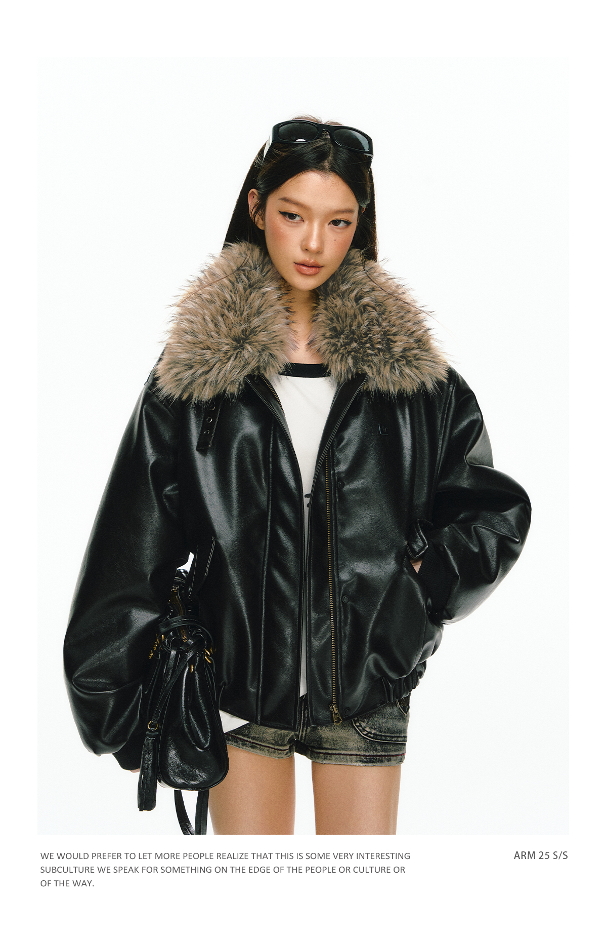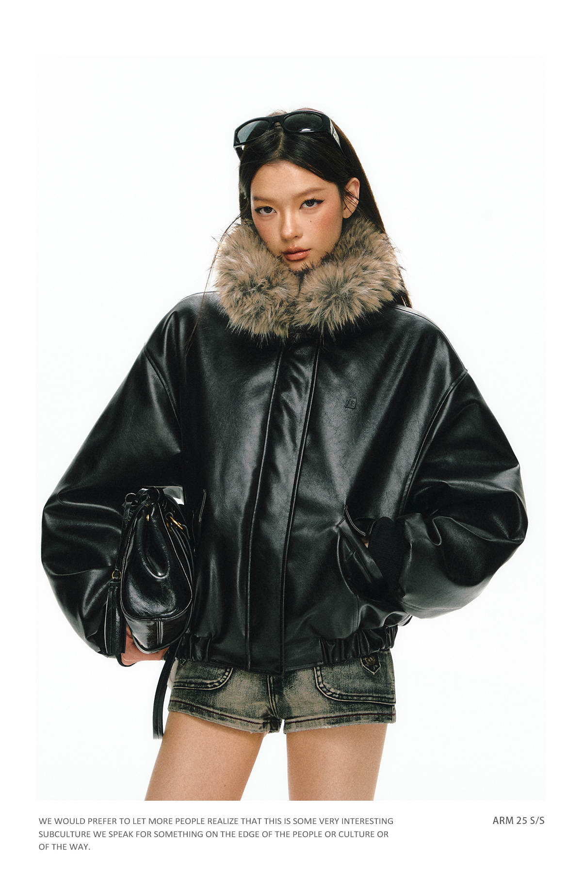 Ariseism 美式复古设计感可拆卸毛领棉服皮外套女冬新款修身上衣