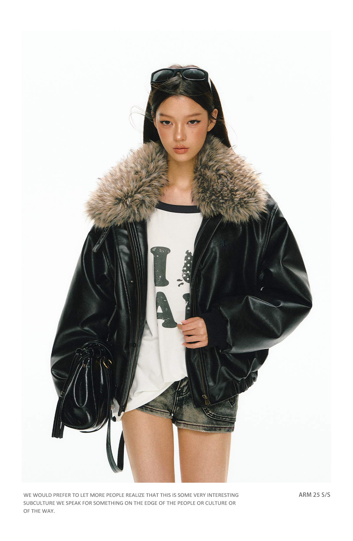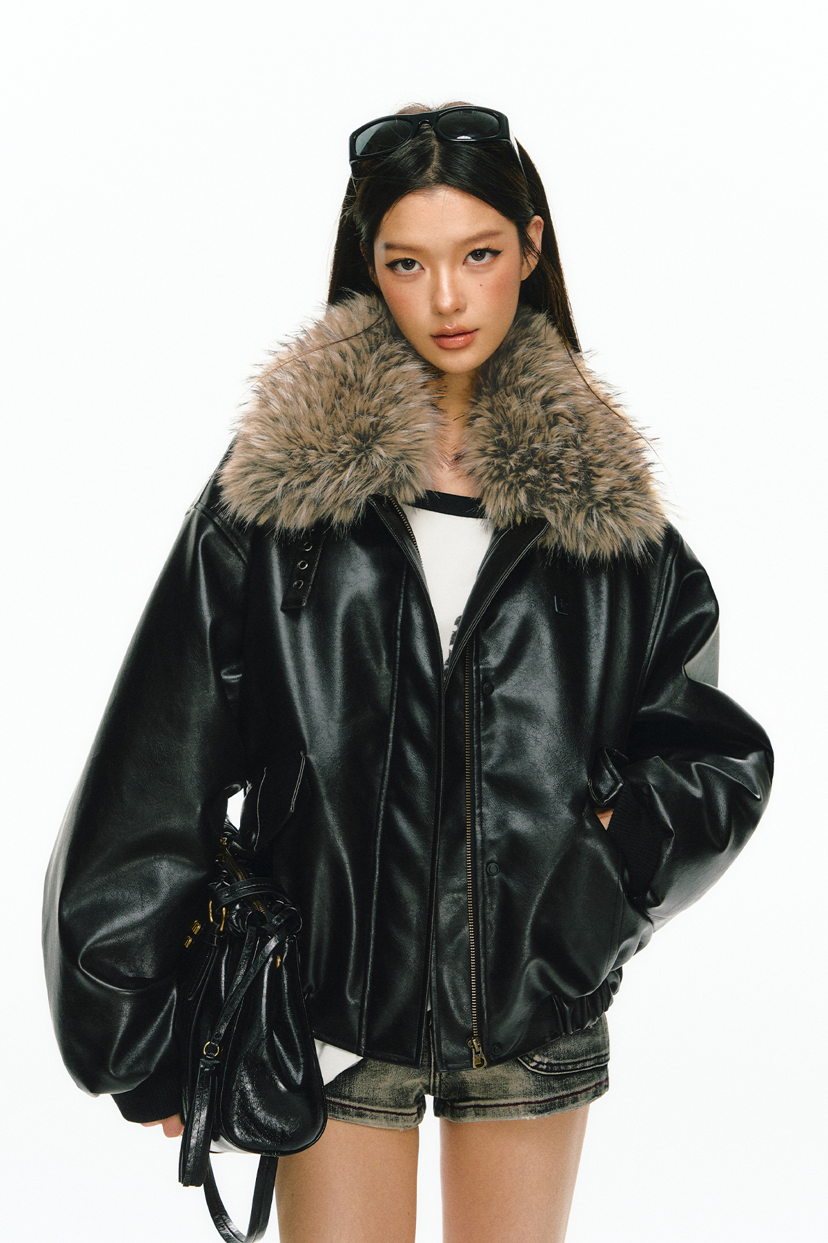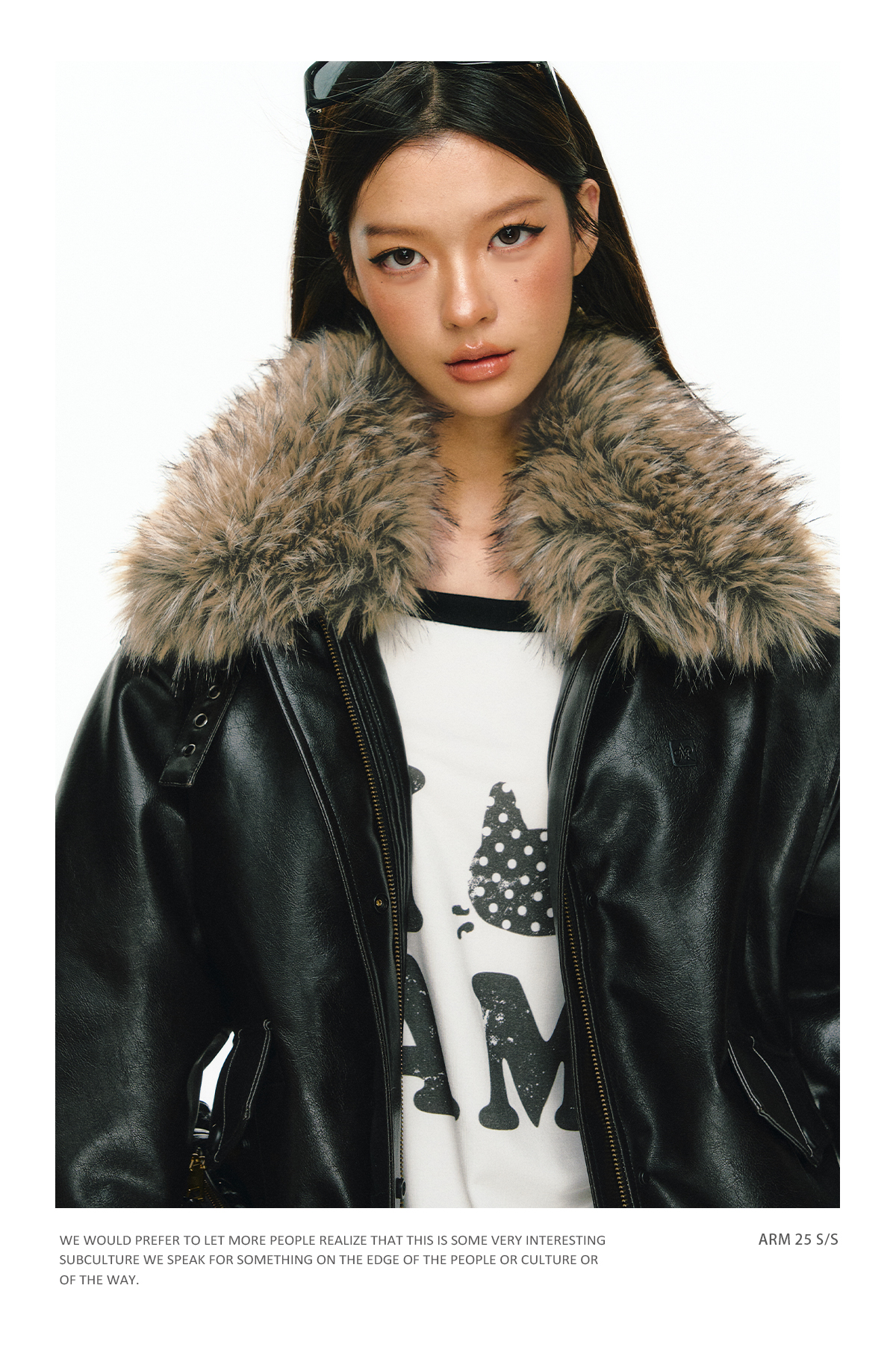 Ariseism 美式复古设计感可拆卸毛领棉服皮外套女冬新款修身上衣