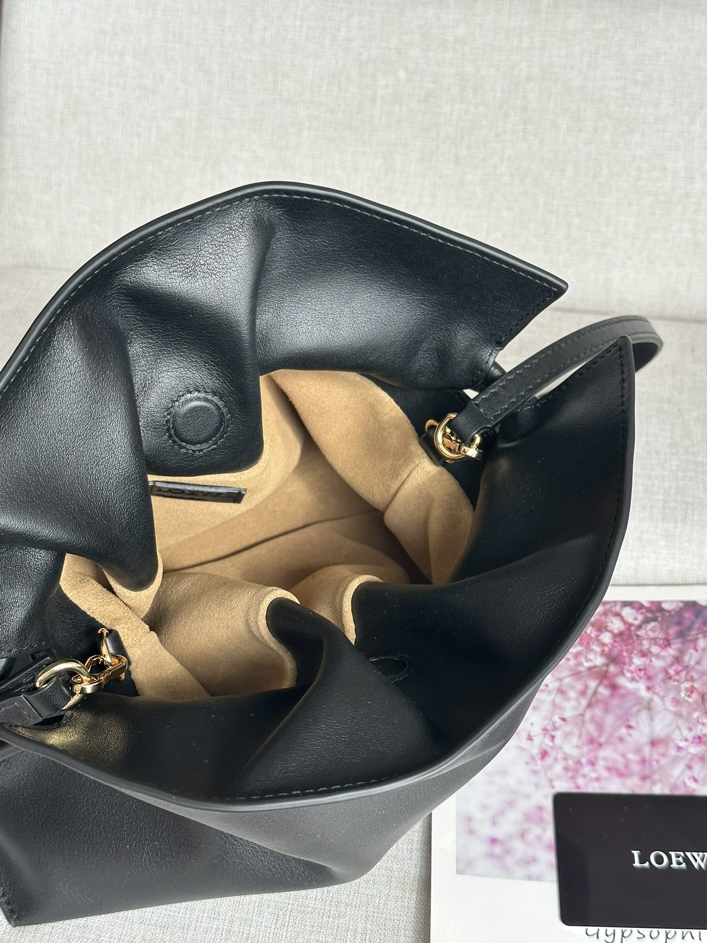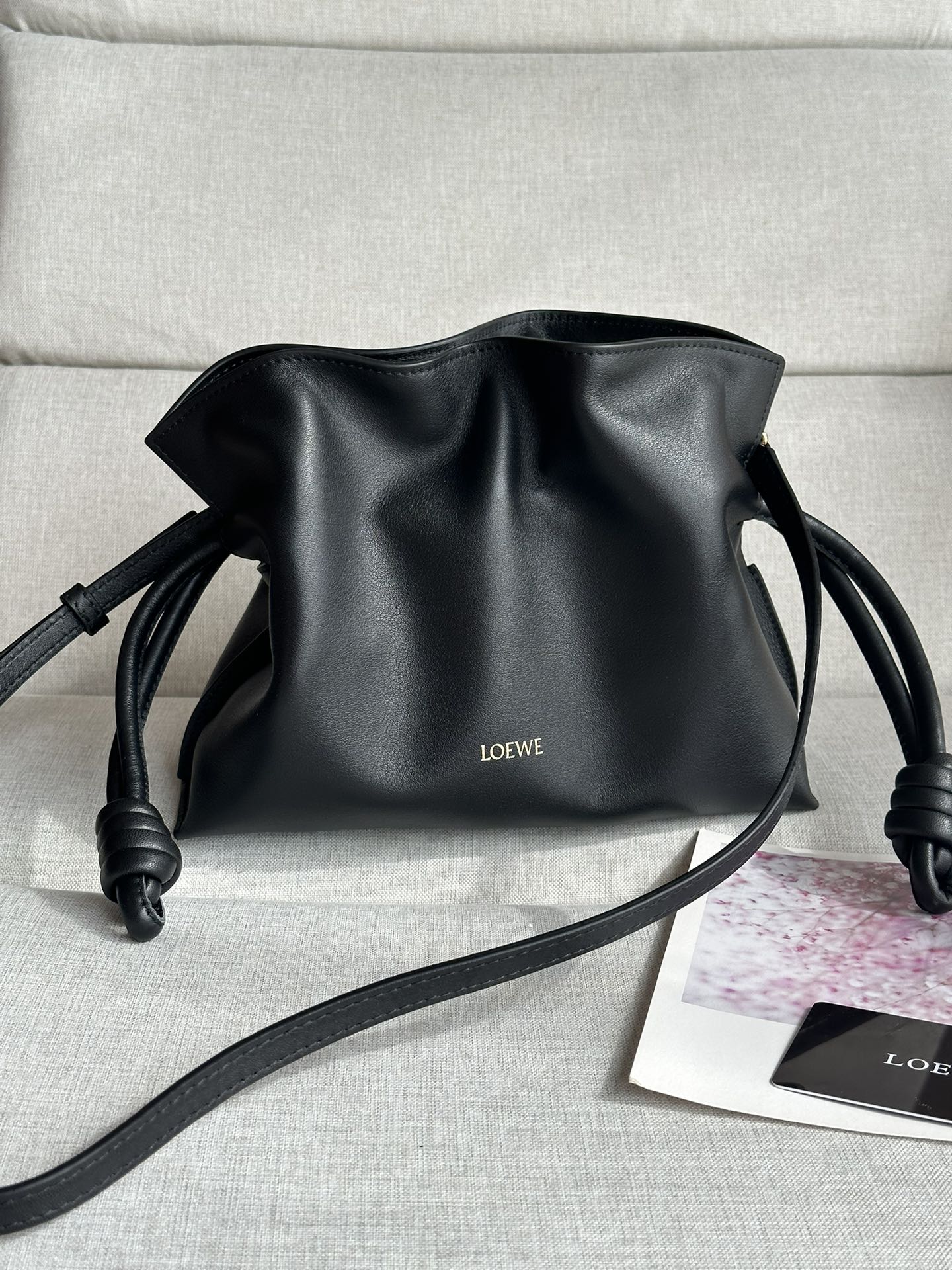 十九世纪七十年代发布的 Flamenco 手拿包,采用拉绳收紧,并打上标志性的盘绕结。此迷你版本采用纳帕牛皮革制成。
