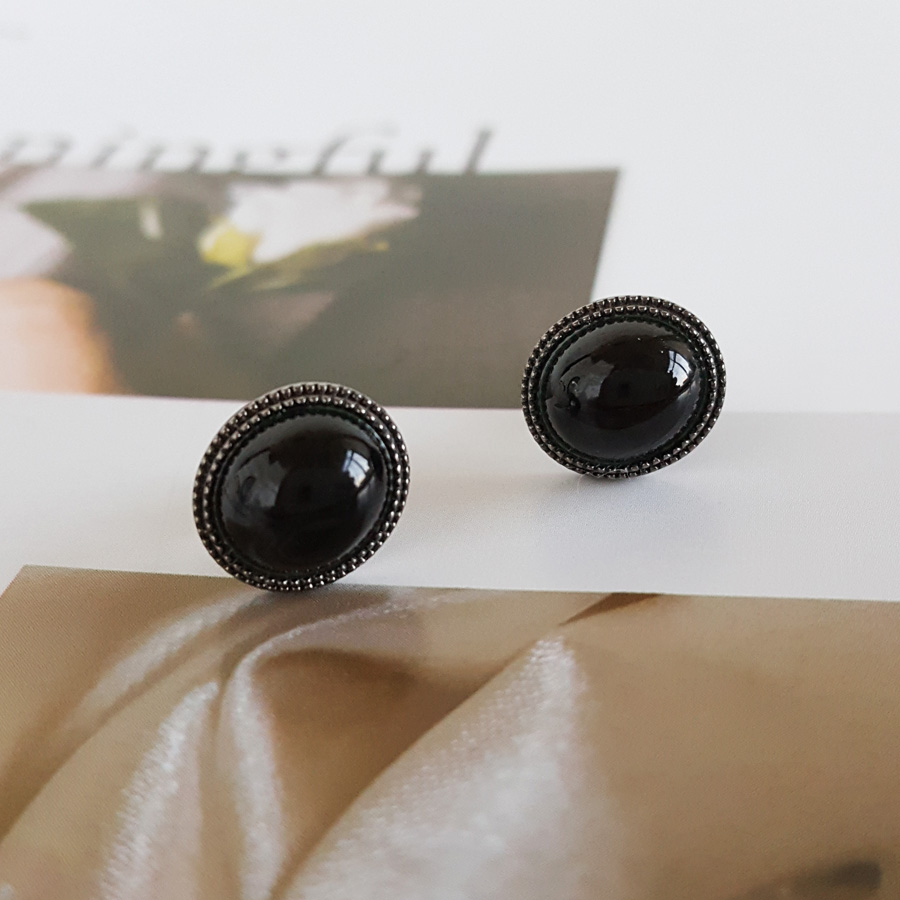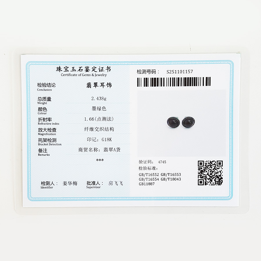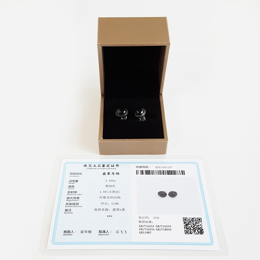 名称 | AU750白金镶天然细腻墨绿色糯冰种蛋面墨翠耳钉 |