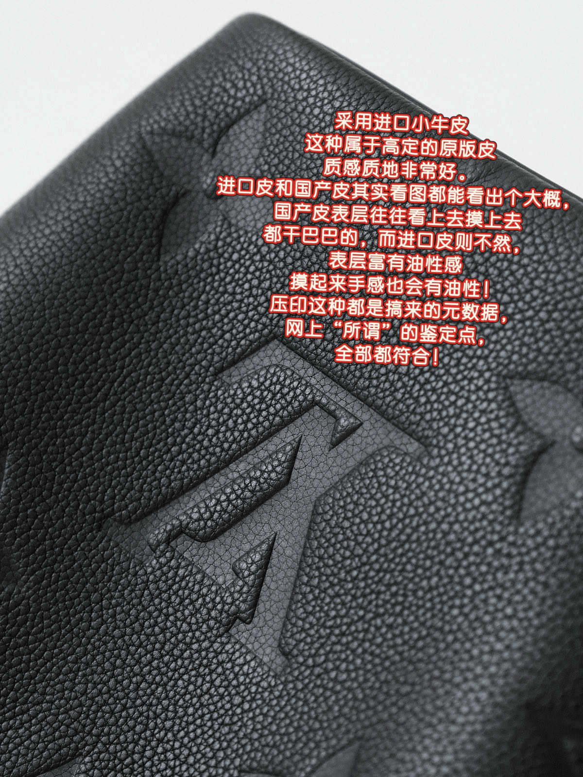 原版进口牛皮🔍 采用Empreinte Monogram压纹小牛皮,这种皮革质感细腻,在保持轻盈度的同时有一定挺括度,纹路清晰,耐造且不容易显旧,浮雕老花立体深邃,触感柔软却耐磨抗刮。