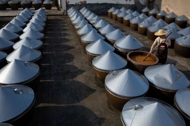 经过500天以上的日晒夜路、搅拌捣缸,酱醪才会发酵成熟。精致细腻的地方文化也使得母子酱油成为了萧绍地区饮食中的必备调料。