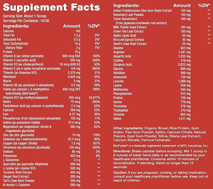 该配方以低致敏的大米蛋白为基础,通过抗氧化剂营养素,硒,锌,钙,叶酸和维生素B12得以增强;独特添加生物吸收姜黄素,增强降低焱症,缓解肠道teng痛;