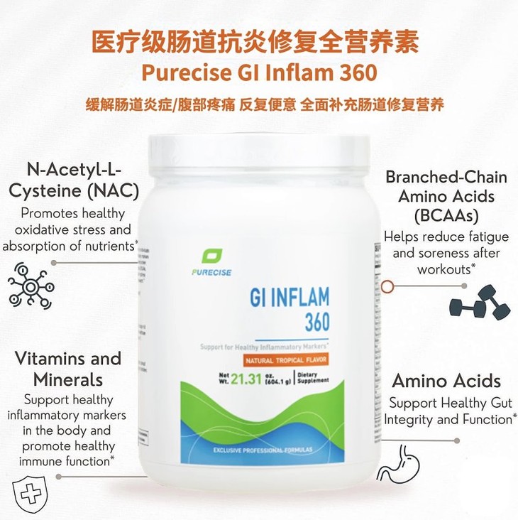 这款GI Inflam 360肠道炎症修复营养粉剂医疗级食品补充剂,是专为肠道功能受损的人群首推的一款zui全面的医疗级肠内营养素。