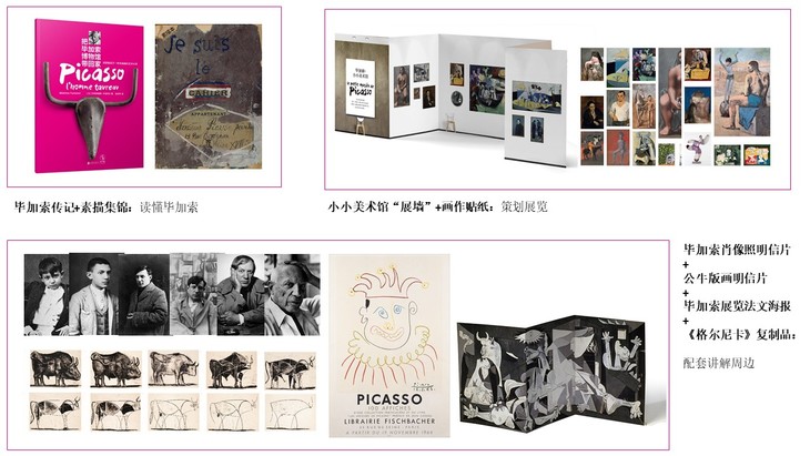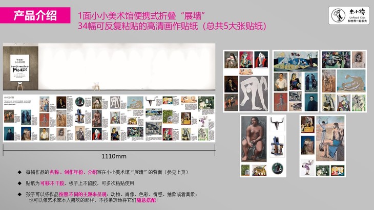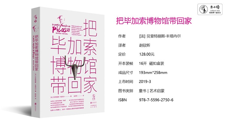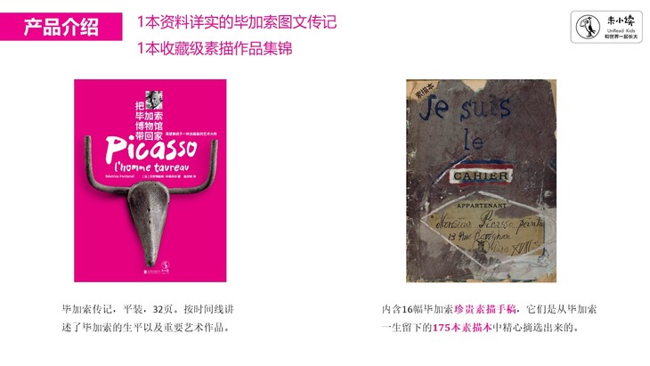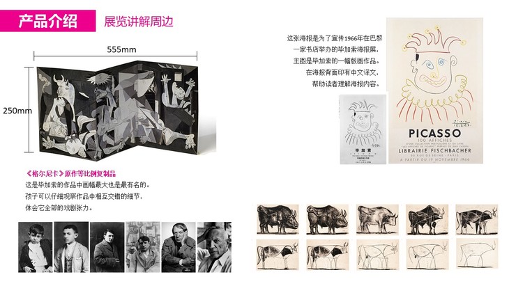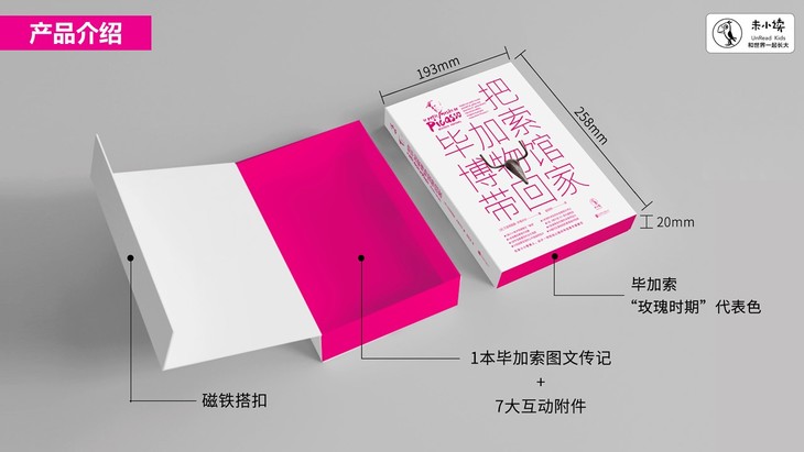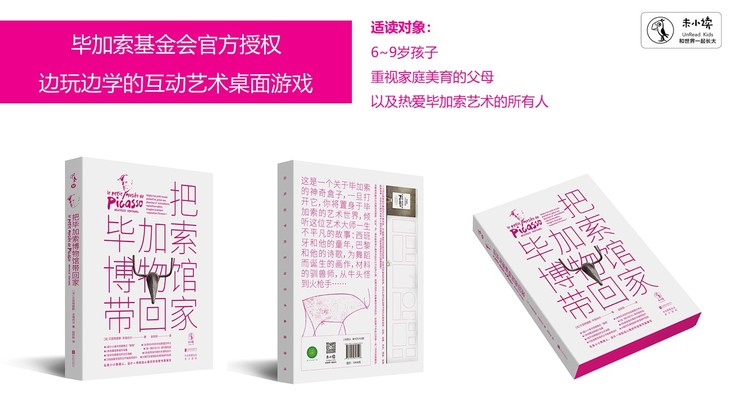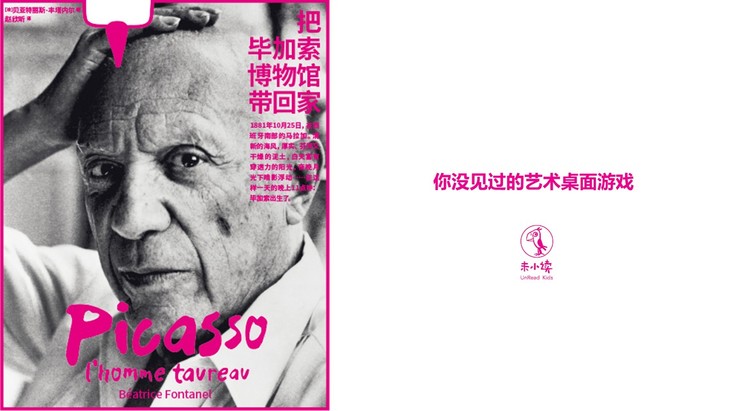 边玩边学的互动艺术桌面游戏。全书以磁铁套盒的形式呈现,主体是一本资料详实的毕加索图文传记,另有7大互动附件,包括毕加索小小美术馆便携式折叠“展墙”,可以将34幅毕加索画作的高清贴纸按自己的意愿设计贴在展墙纸板上,而展墙背面是34幅画作的背景和内容介绍,以此模拟成小型画展。还有名画《格尔尼卡》的复制海报、毕加索的素描本、毕加索生平肖像明信片、毕加索公牛版画明信片等。