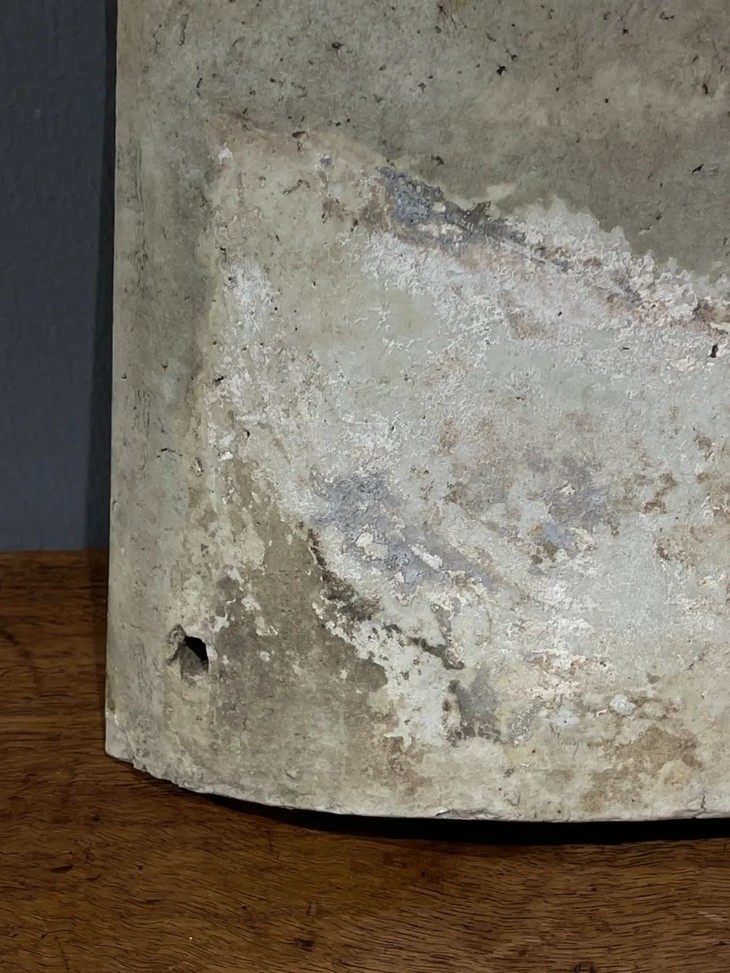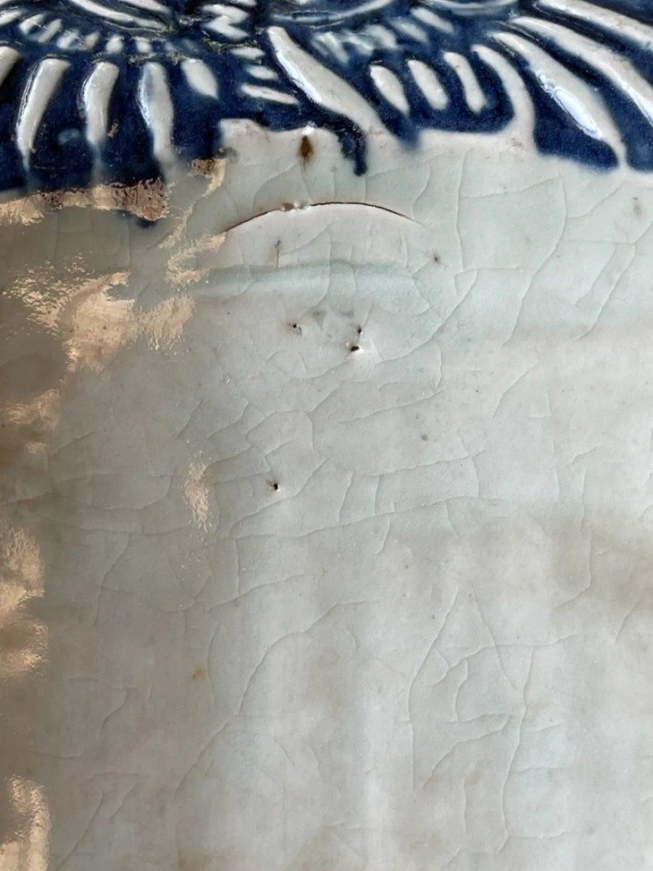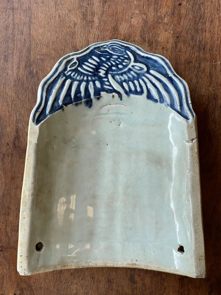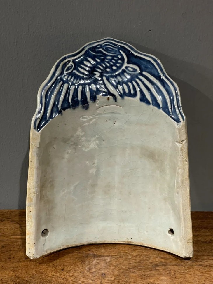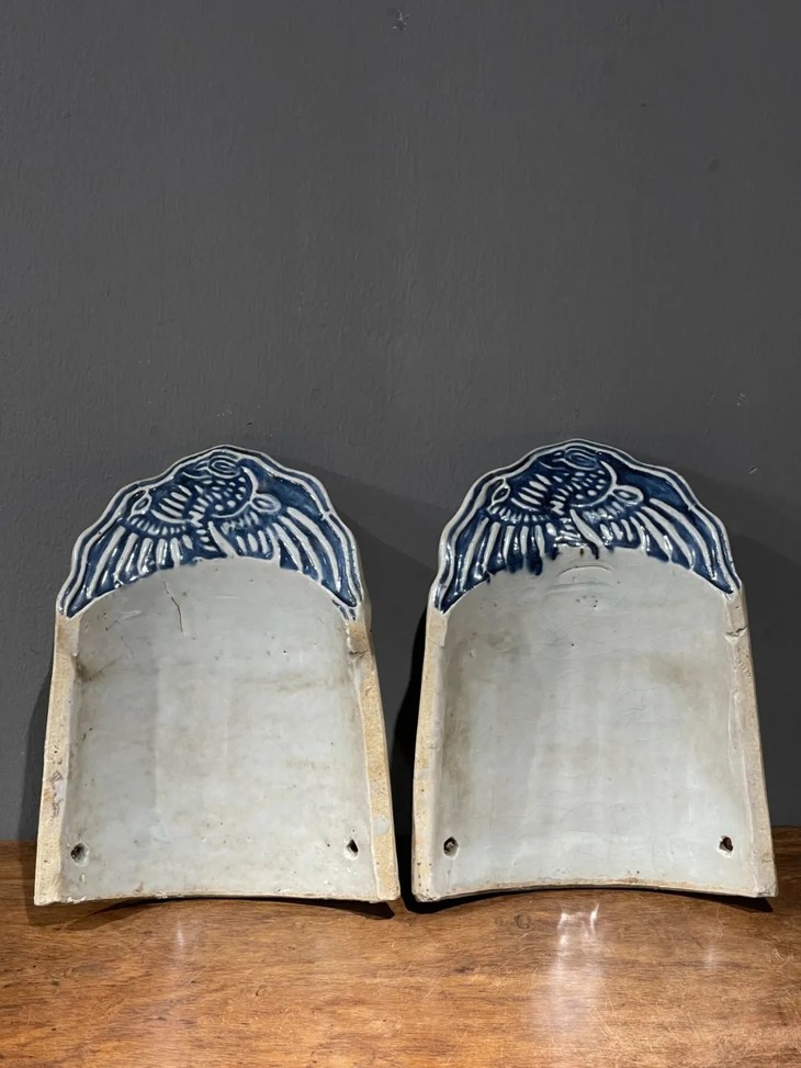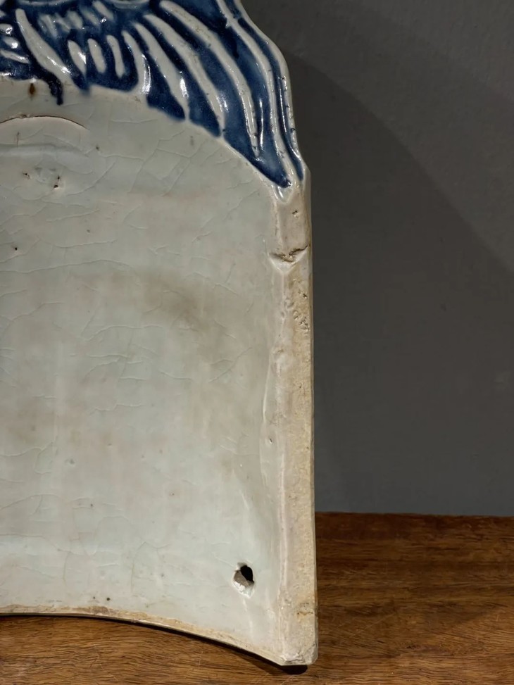 这是景德镇烧造的高端屋瓦边沿装饰瓦当,尺寸硕大,造型优雅的白瓷青花模造凤纹瓦当,是过去富贵大宅院内建筑的屋沿装饰瓦当,青花模造凤纹构图典雅、制作严谨,屋顶边沿一排青花白瓷凤凰,其华丽贵气可想而知。此对青花模造凤纹瓷瓦当两件同时保存下来,如今独立守藏可以当空间优雅摆设,也可以当有创意的餐具,或可为花器、烛台等为现代居家生活添色增彩的神器。此对青花模造凤纹瓷瓦当,如图所示,除边沿处有细微磕碰伤,有短裂痕、釉面有小刮痕与磨损外,基本保存完好。尺寸一:长:26.5厘米,宽:20.4厘米,高:5.7厘米,厚:1.3厘米,重量:1.3千克。尺寸二:长:26.5厘米,宽:20.6厘米,高:5.7厘米,厚:1.3厘米,重量:1.2千克。
