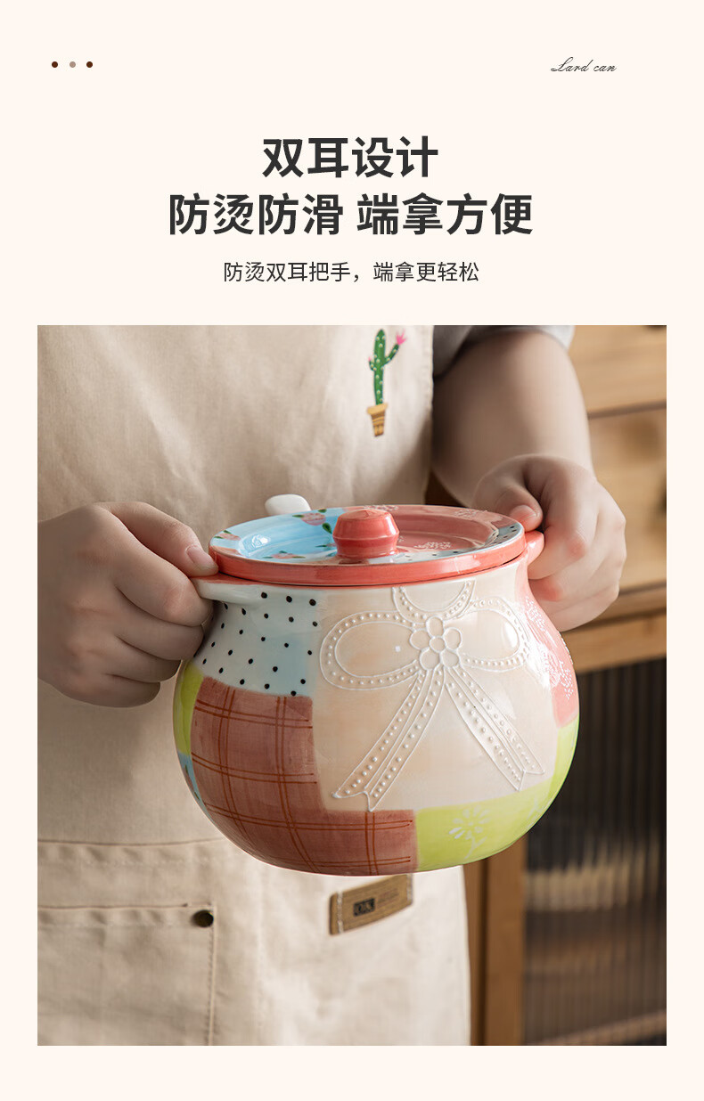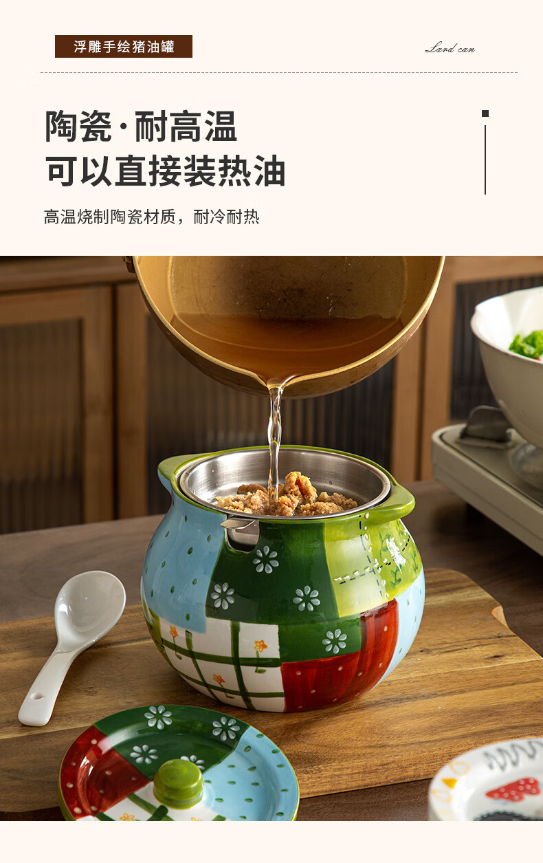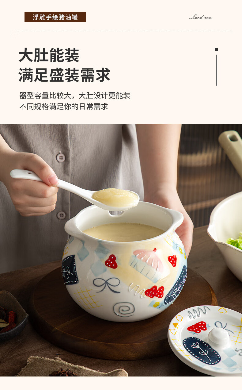 【浮雕手绘猪油罐】陶瓷耐高温双耳防烫食品级厨房调料罐辣椒油大容量带勺家用