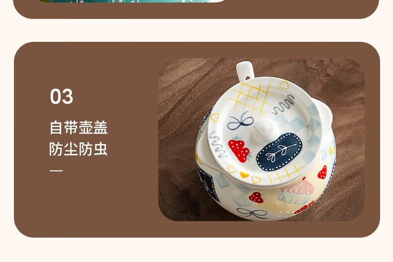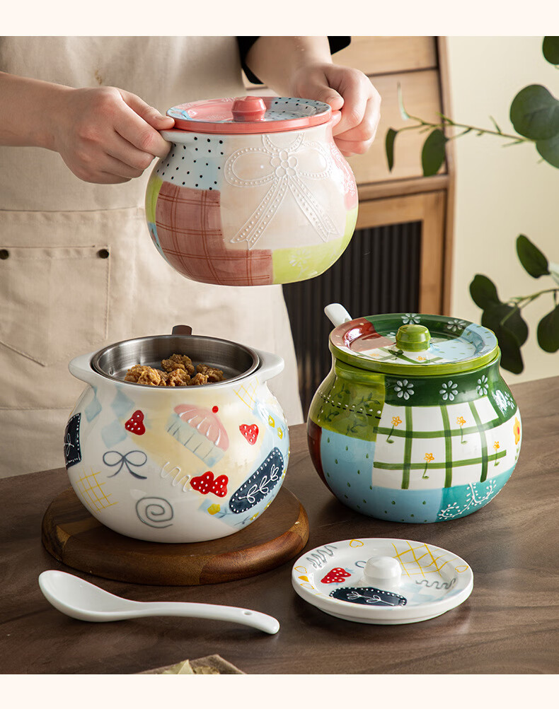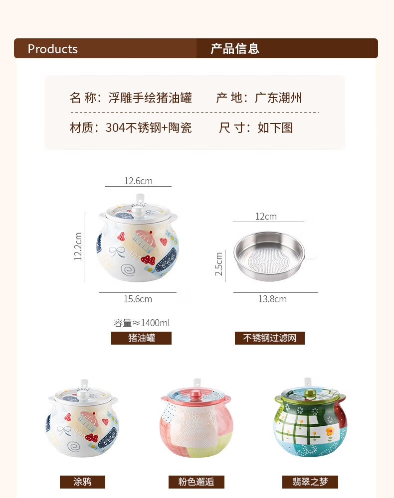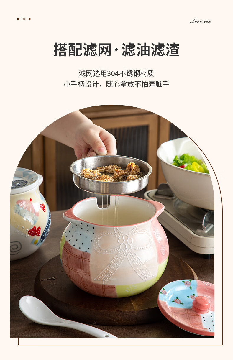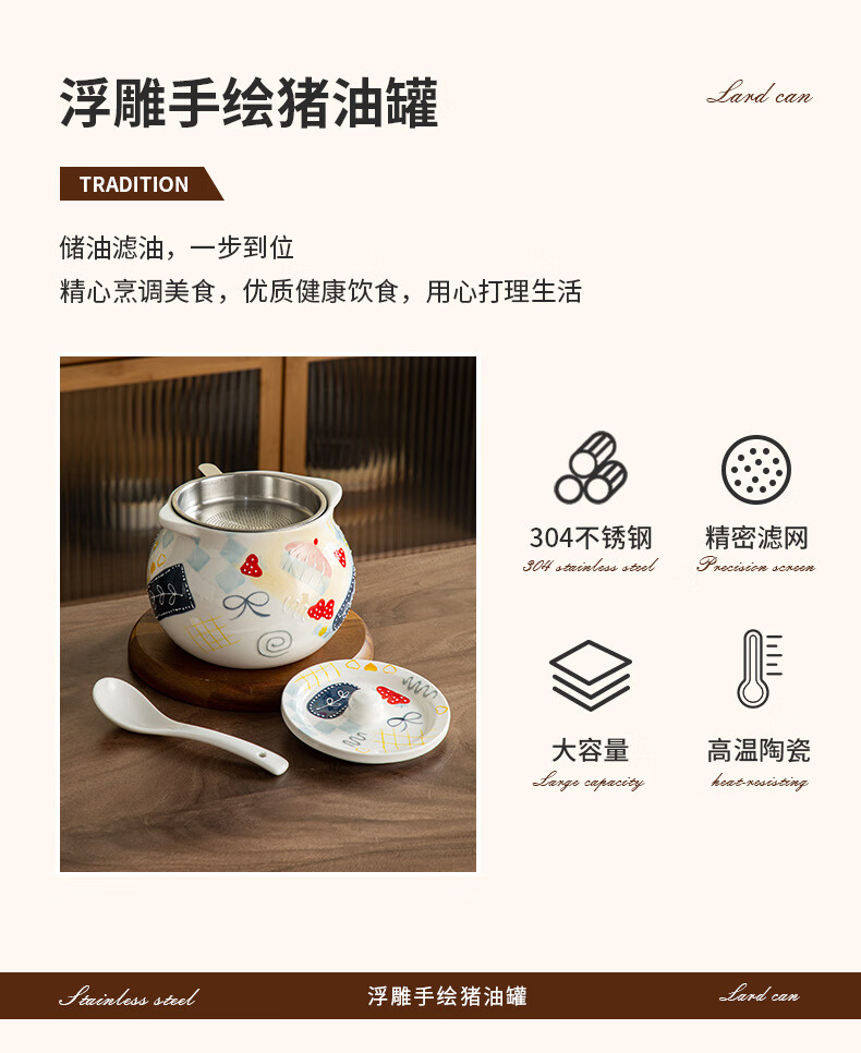 【浮雕手绘猪油罐】陶瓷耐高温双耳防烫食品级厨房调料罐辣椒油大容量带勺家用