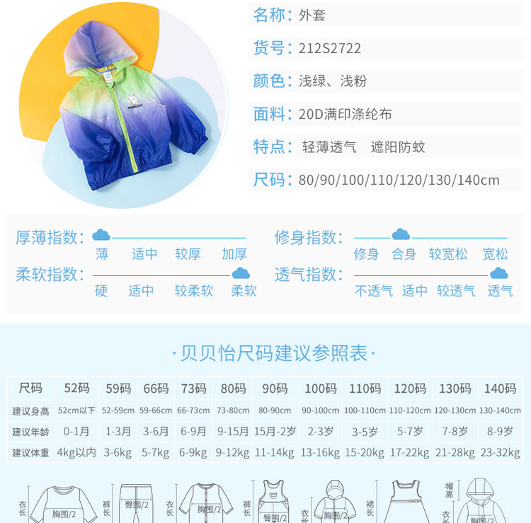 贝贝怡男女宝宝春夏新品皮肤衣休闲遮阳空调服薄外套212S2722