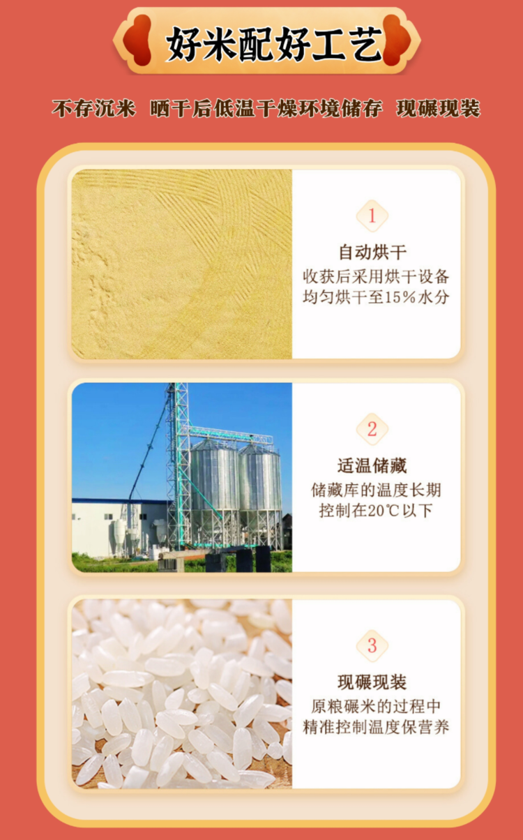 经过自然晾晒以后不马上脱壳,为了保护米的水分不会流失,将稻谷在恒温库储存起来,还原口感。