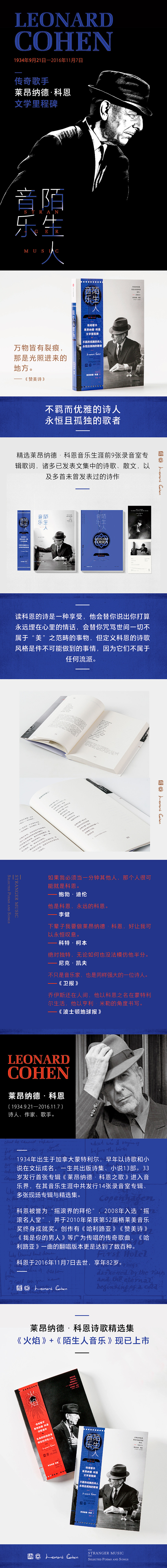 《陌生人音乐》是科恩的一座文学里程碑——精选科恩音乐生涯的前九张专辑,收录《苏珊》《哈利路亚》《赞美诗》等传奇歌曲,九部已出版文集,以及多首从未发表的诗歌。