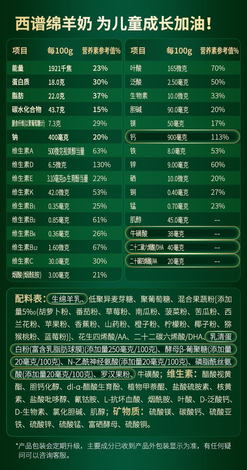 新国标百跃西谱儿童学生青少年成长绵羊乳粉700克适合(3-15岁)