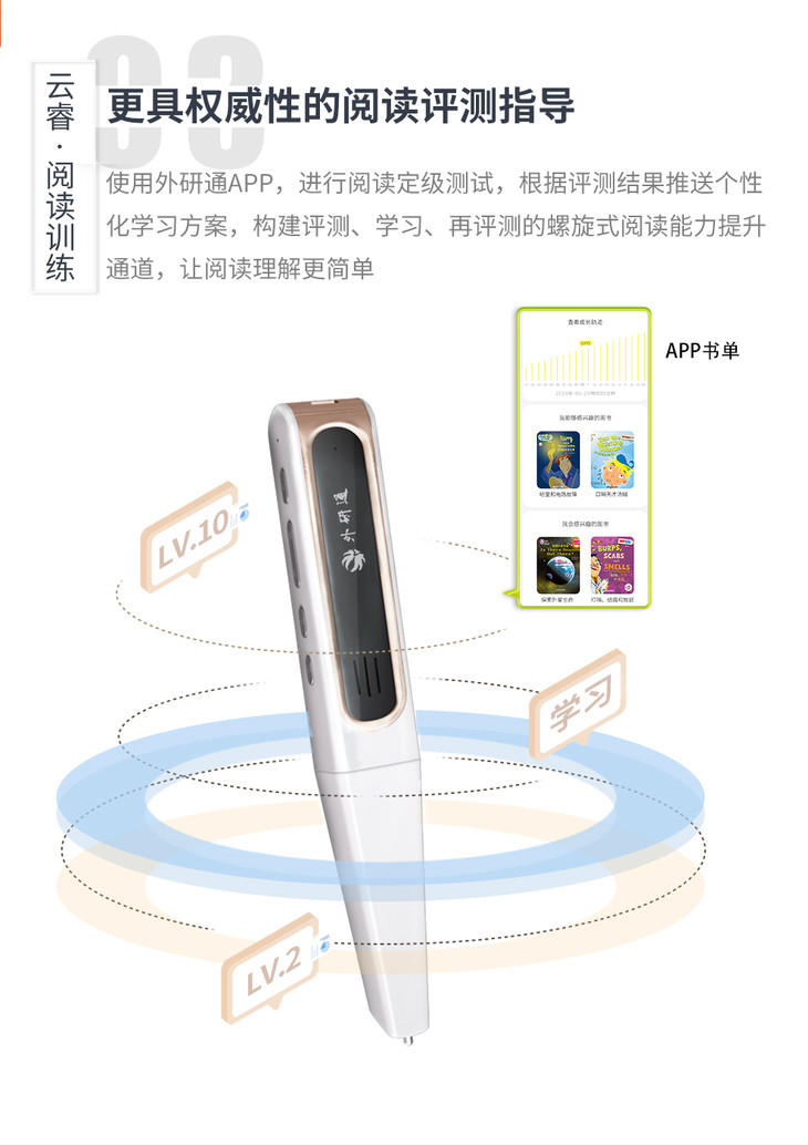 作为专业的外语学习工具,外研社出品的外研通点读笔不仅配套图书丰富权威、发音纯正,还拥有携带方便、操作简单、健康无辐射等众多优点,可以点读外研社出版的从幼儿到成人的4000多册图书,是一个外语学习的终身工具,外研通产品推出10年以来,深的各位家长和学生的青睐,全国已经有120万的学生通过外研通点读笔提高自己的英语学习能力。