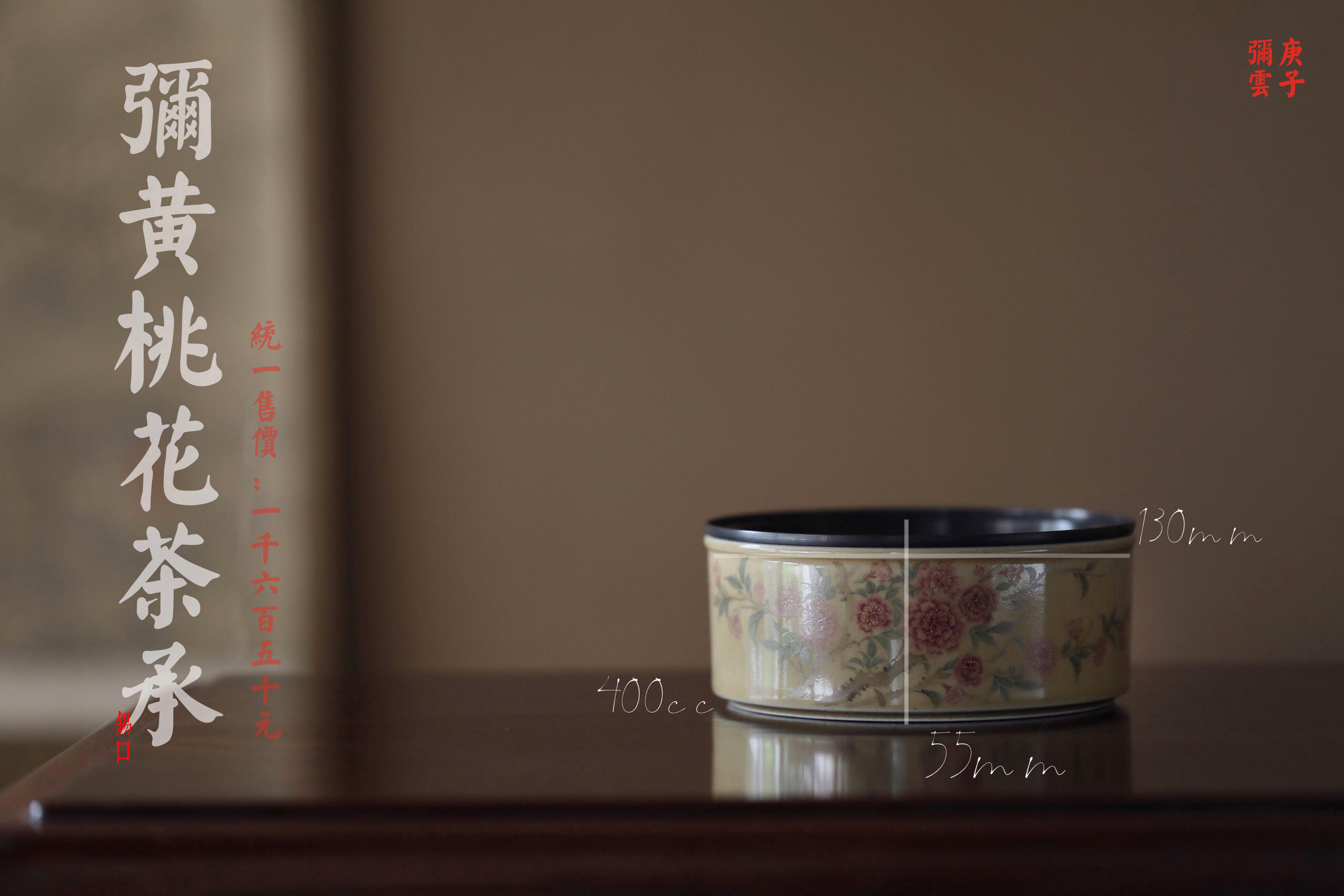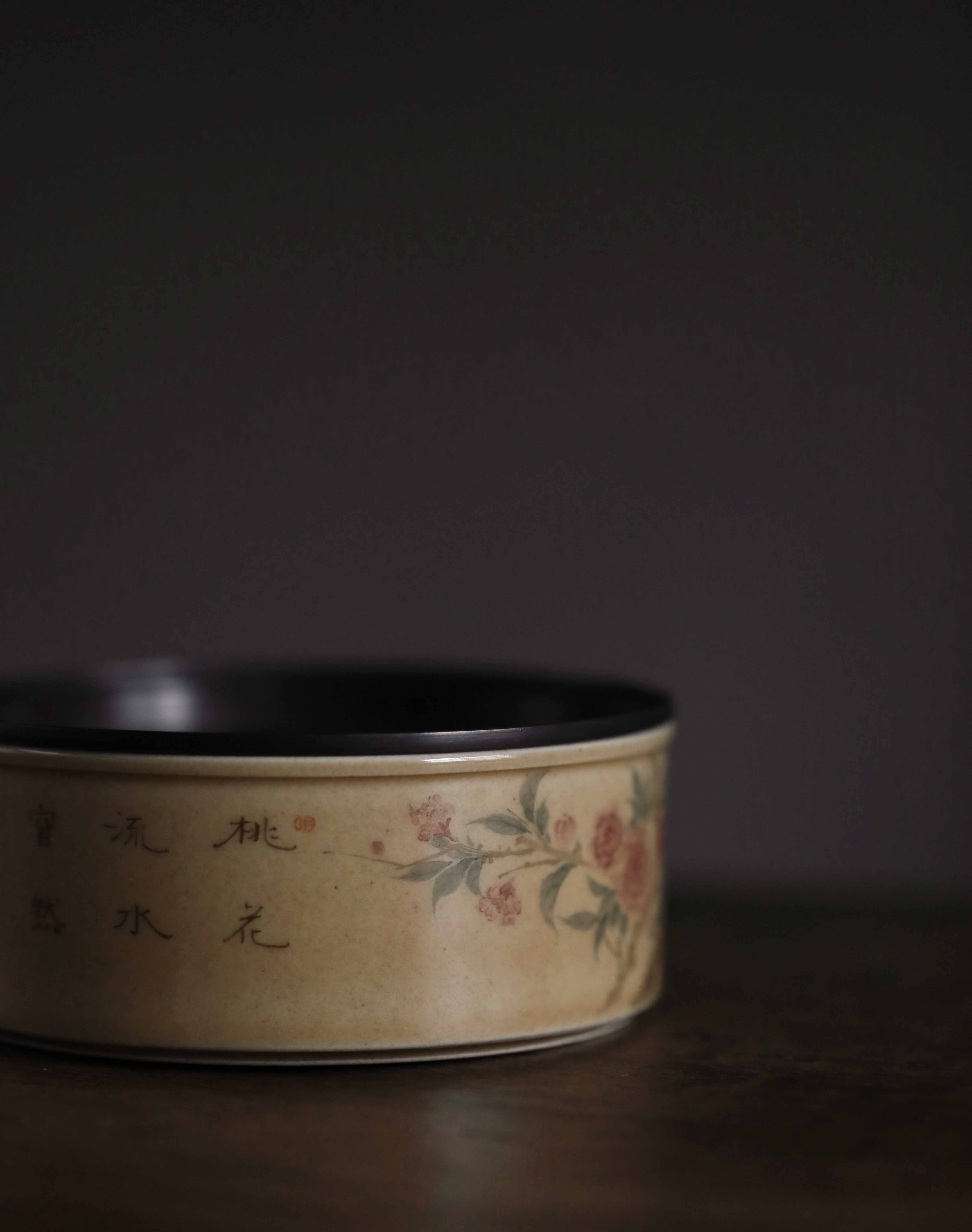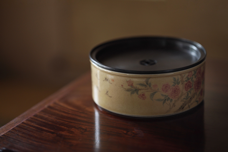工艺:手绘桃花诗文、弥黄釉、锡盖