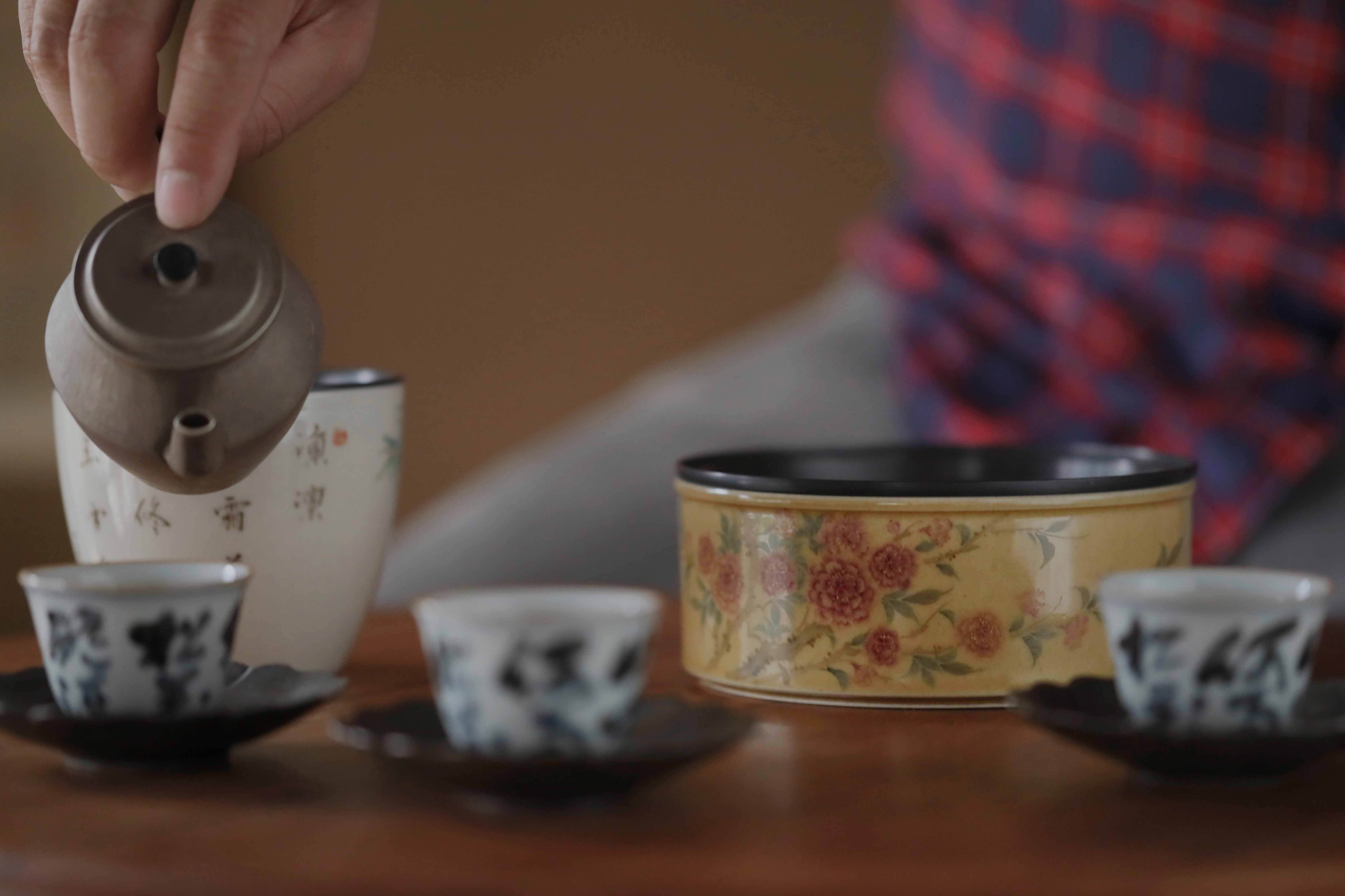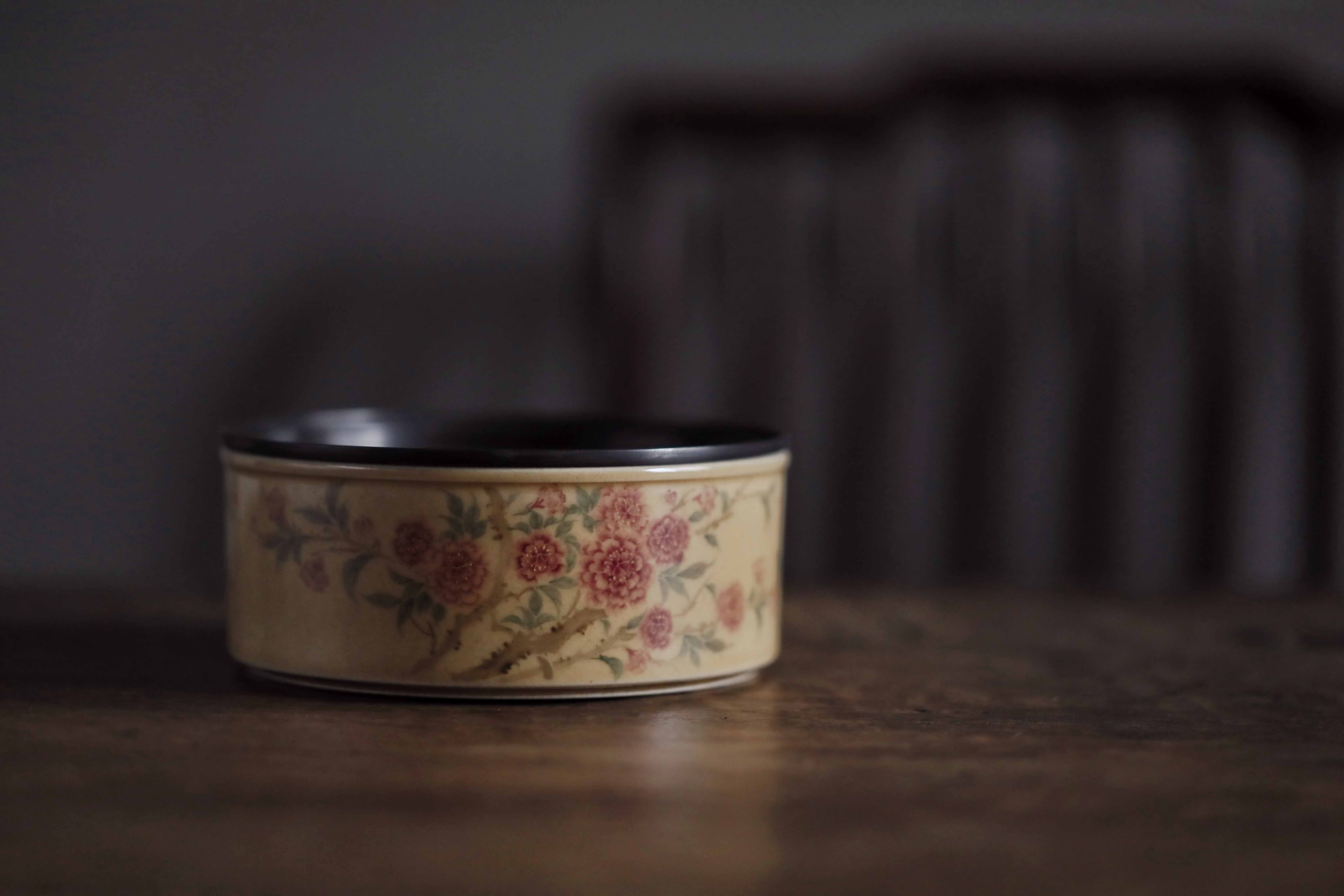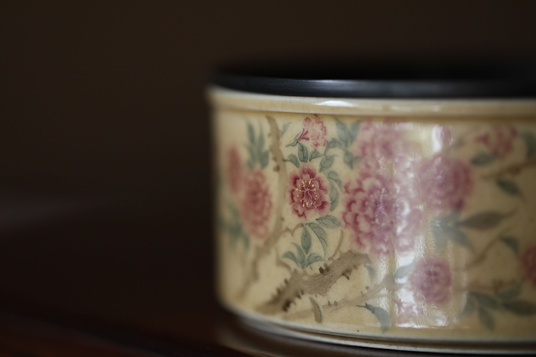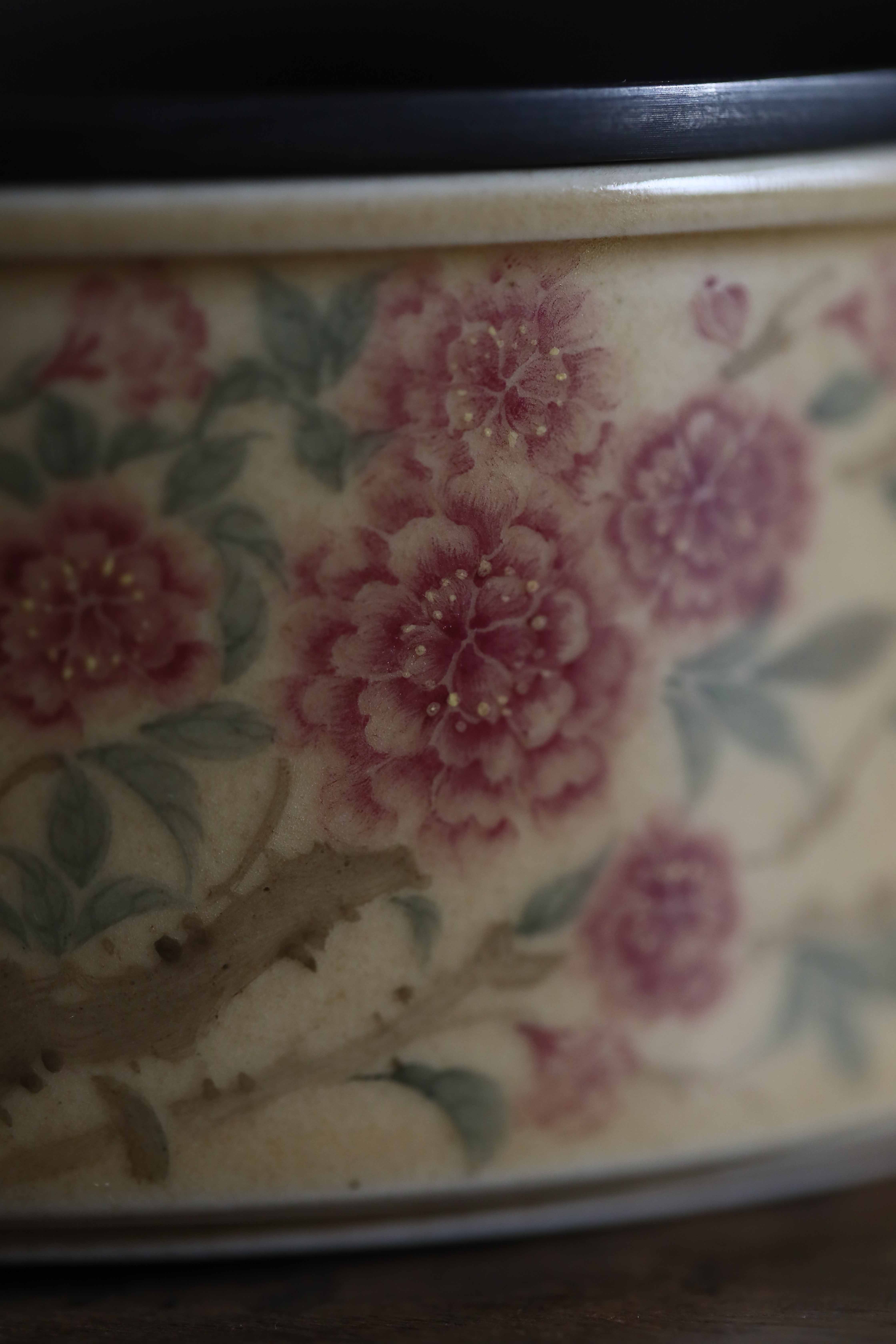工艺:手绘桃花诗文、弥黄釉、锡盖