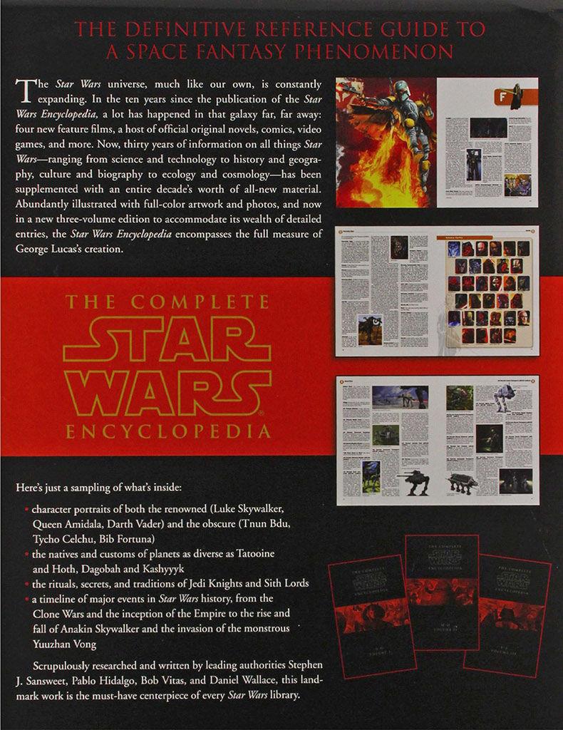 The definitive, lavishly illustrated reference guide to the universe of the first six films! This comprehensive boxed set of three hefty volumes covers every aspect of Star Wars, from the original six movies to The Clone Wars, radio dramas, comics, novels, cartoons, short stories, and video games. With a treasure trove of information on more than thirty years of Star Wars—and a millennia in the galaxy far, far away—this is the must-have centerpiece for every Star Wars library. Abundantly illustrated with full-color artwork and photos, and now in a new three-volume edition to accommodate its wealth of detailed entries, the Star Wars Encyclopedia encompasses the full measure of George Lucas’s creation. Here’s just a sampling of what’s inside: • character portraits of both the renowned (Luke Skywalker, Queen Amidala, Darth Vader) and the obscure (Tnun Bdu, Tycho Celchu, Bib Fortuna) • the natives and customs of planets as diverse as Tatooine and Hoth, Dagobah and Kashyyyk • the rituals, secrets, and traditions of Jedi Knights and Sith Lords • a timeline of major events in Star Wars history, from the Clone Wars and the inception of the Empire to the rise and fall of Anakin Skywalker and the invasion of the monstrous Yuuzhan Vong Scrupulously researched and written by leading authorities Stephen J. Sansweet, Pablo Hidalgo, Bob Vitas, and Daniel Wallace, this landmark work is the must-have centerpiece of every Star Wars library.