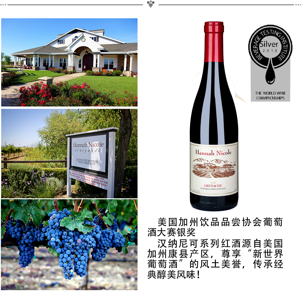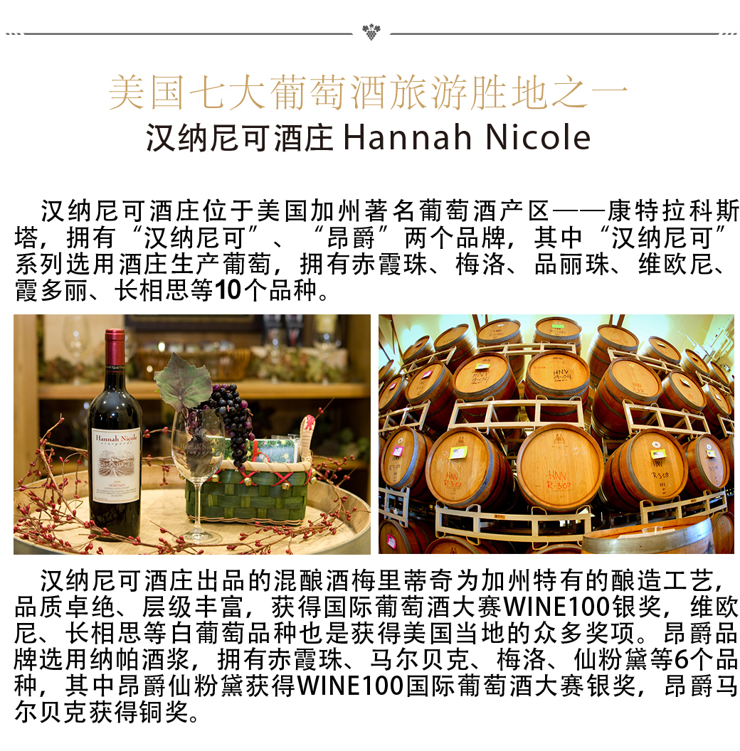 汉纳尼可酒庄占地面积80英亩,引进品丽珠、小味多、歌海娜和长相思等波尔多与罗纳河葡萄品种,酒庄拥有“汉纳尼可”、“昂爵”两个品牌,其中“汉纳尼可”系列选用酒庄种植的葡萄酿制而成,其中混酿酒梅里蒂奇为加州特有的酿造工艺,品质卓绝、层级丰富,获得国际葡萄酒大赛WINE100银奖,汉纳尼可长相思荣获银奖,赤霞珠、仙粉黛荣获WINE100铜奖,梅洛、维欧尼等葡萄品种也获得美国当地的众多奖项。昂爵品牌选用纳帕酒浆,品质广受世界专业评审台认可,其中昂爵赤霞珠获得WINE100国际葡萄酒大赛金奖,昂爵仙粉黛、昂爵西拉、昂爵黑皮诺获得WINE100国际葡萄酒大赛银奖,昂爵马尔贝克获得铜奖。