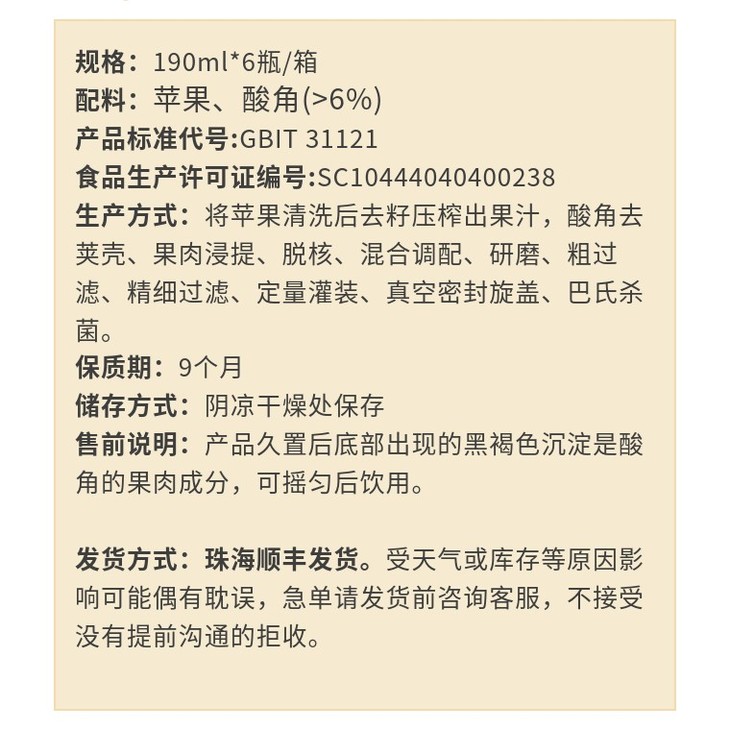 果汁含量100%:苹果汁+酸角汁(>6%)