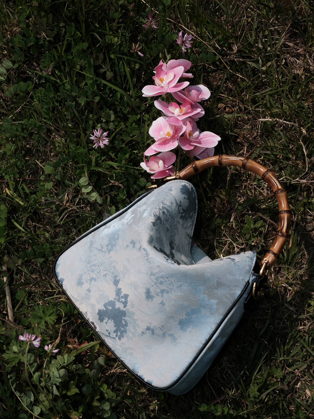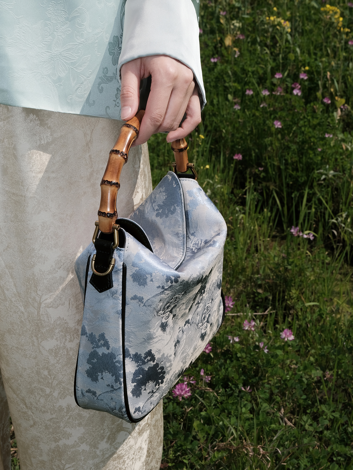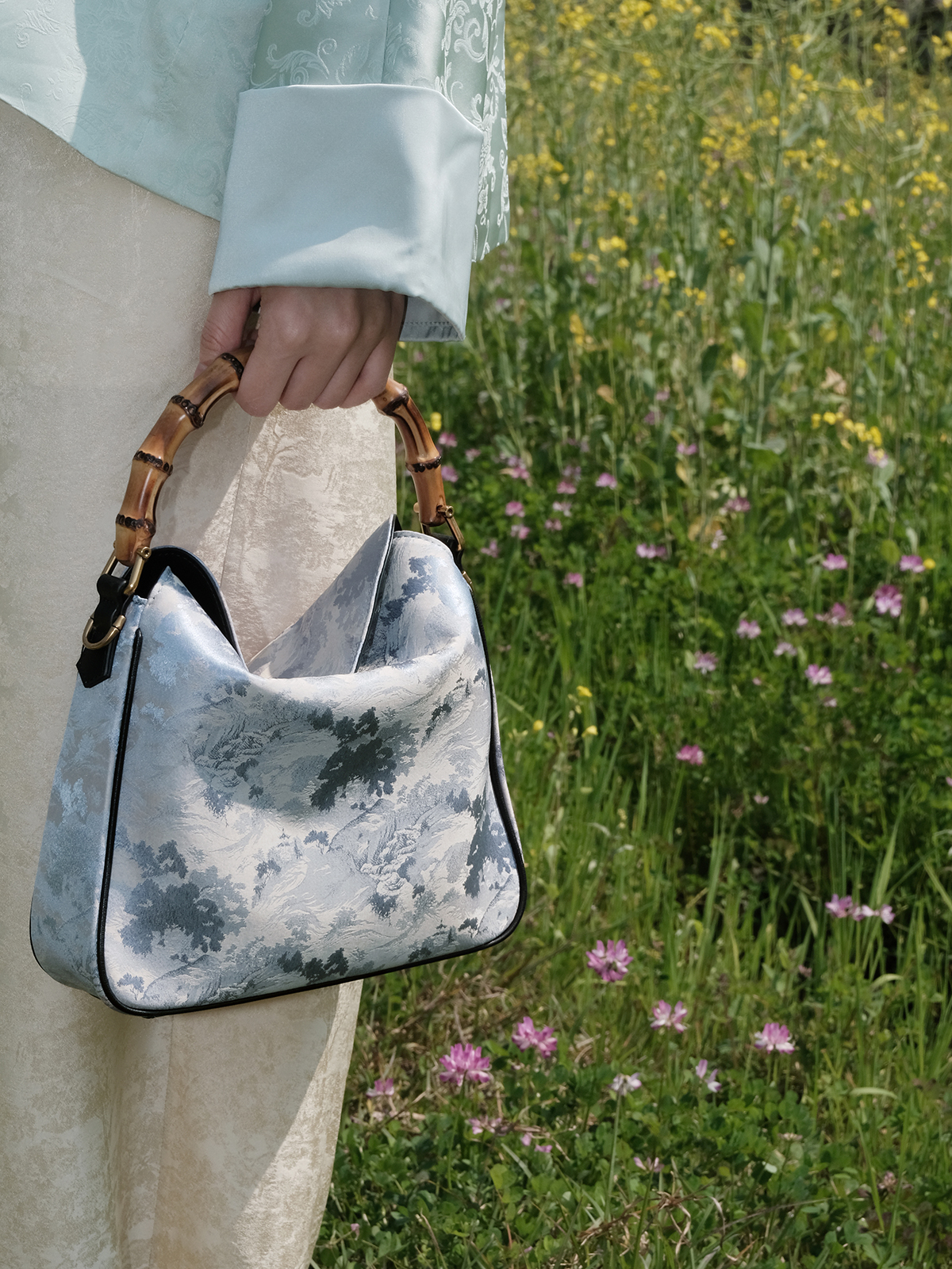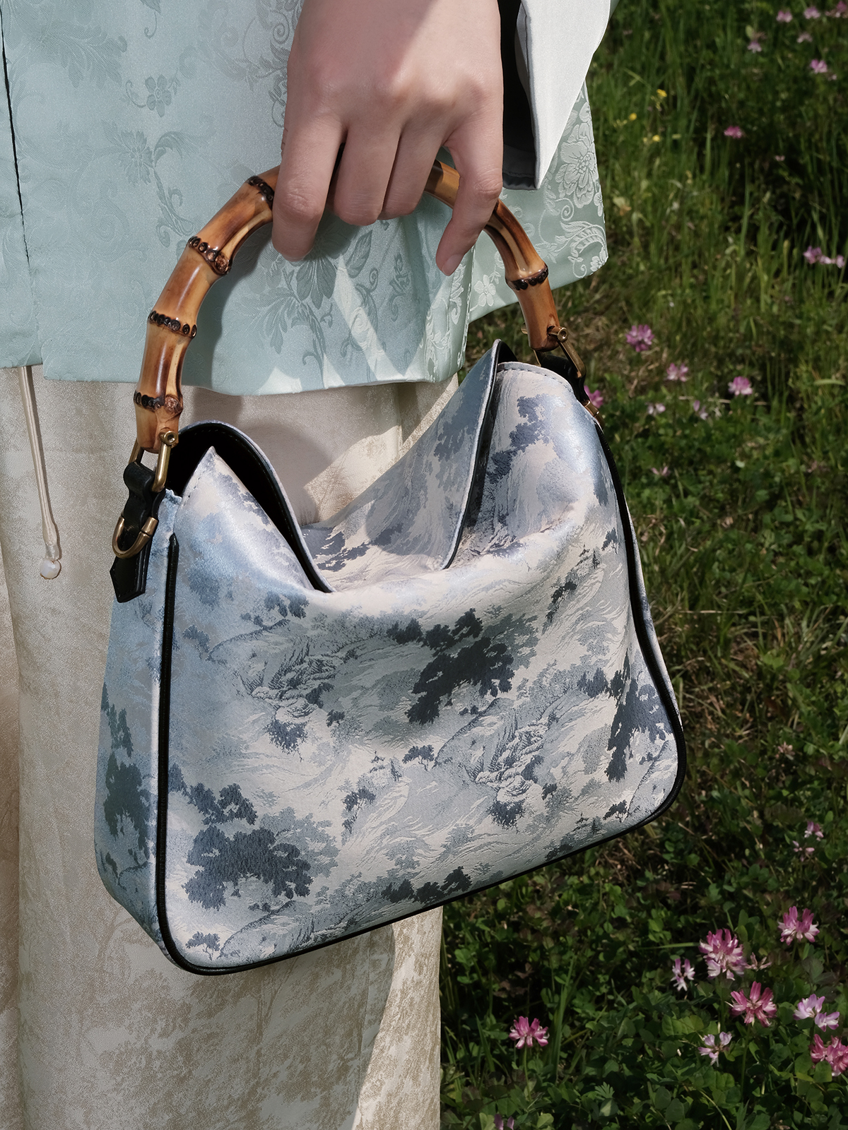 盛唐婧 |真丝山水纹竹节手提包(实物为白镶边)(特价品)(特殊商品不退不换)