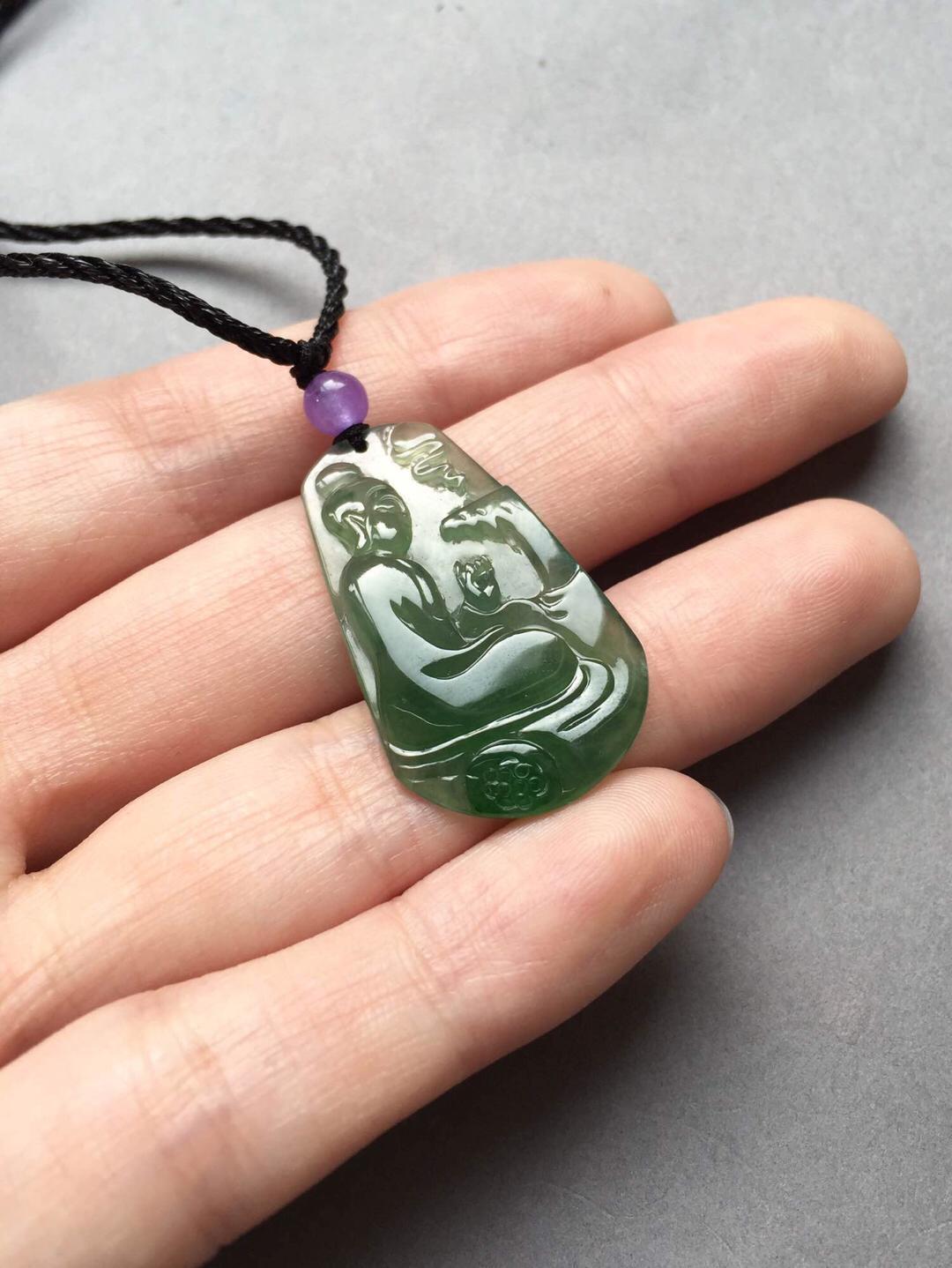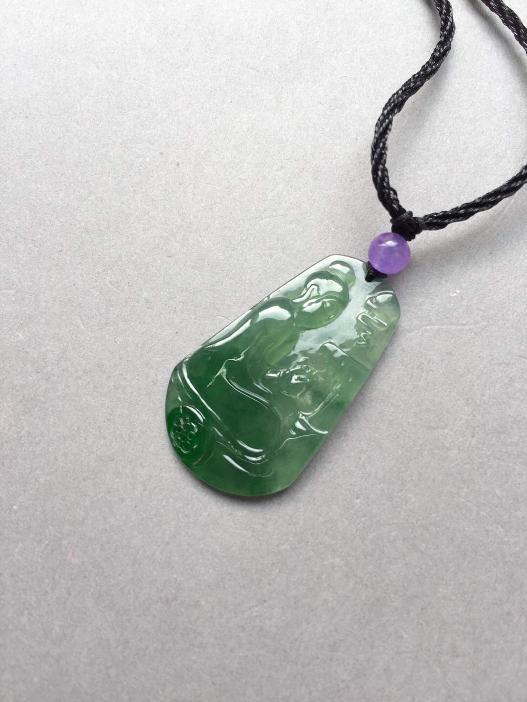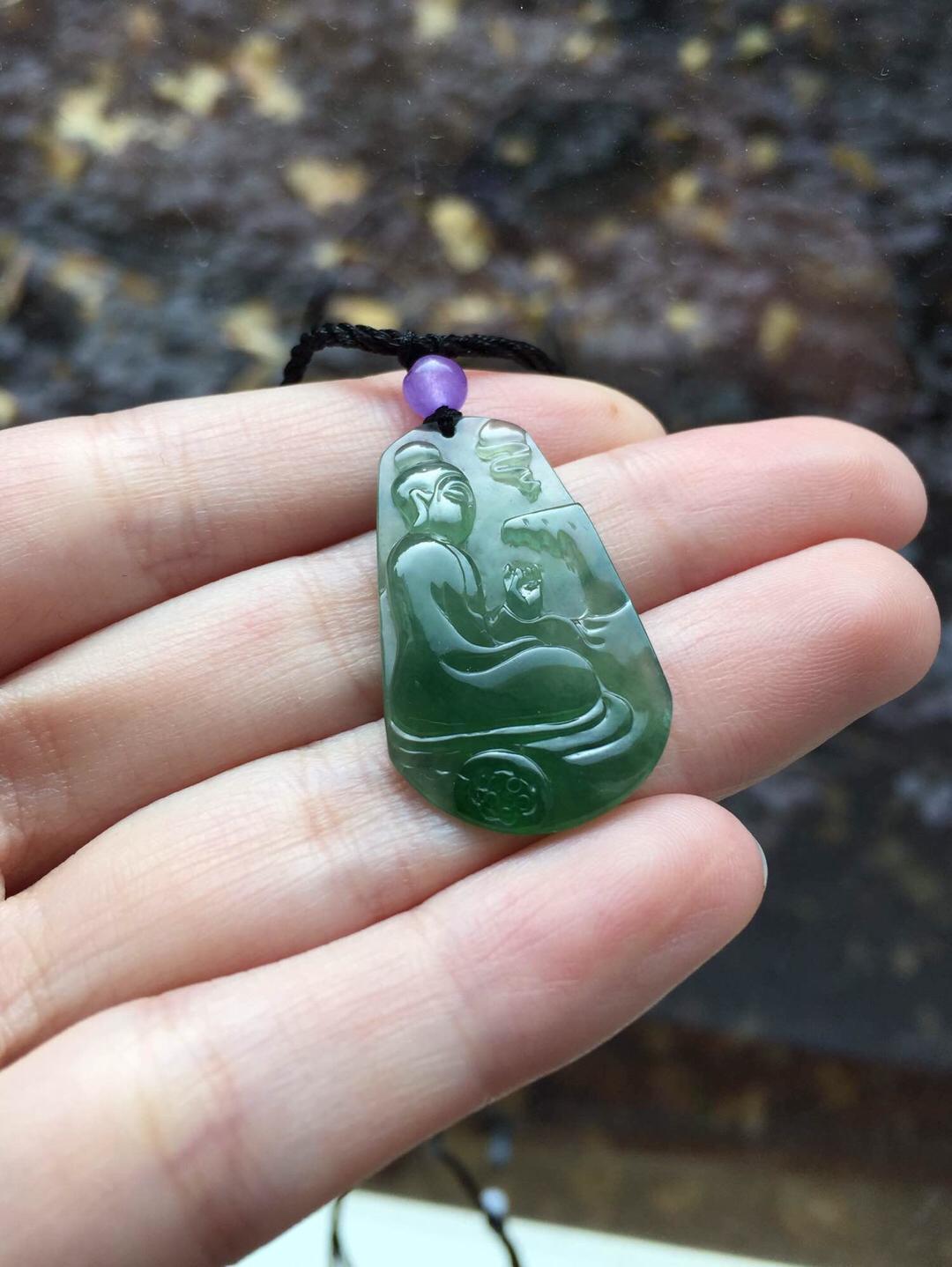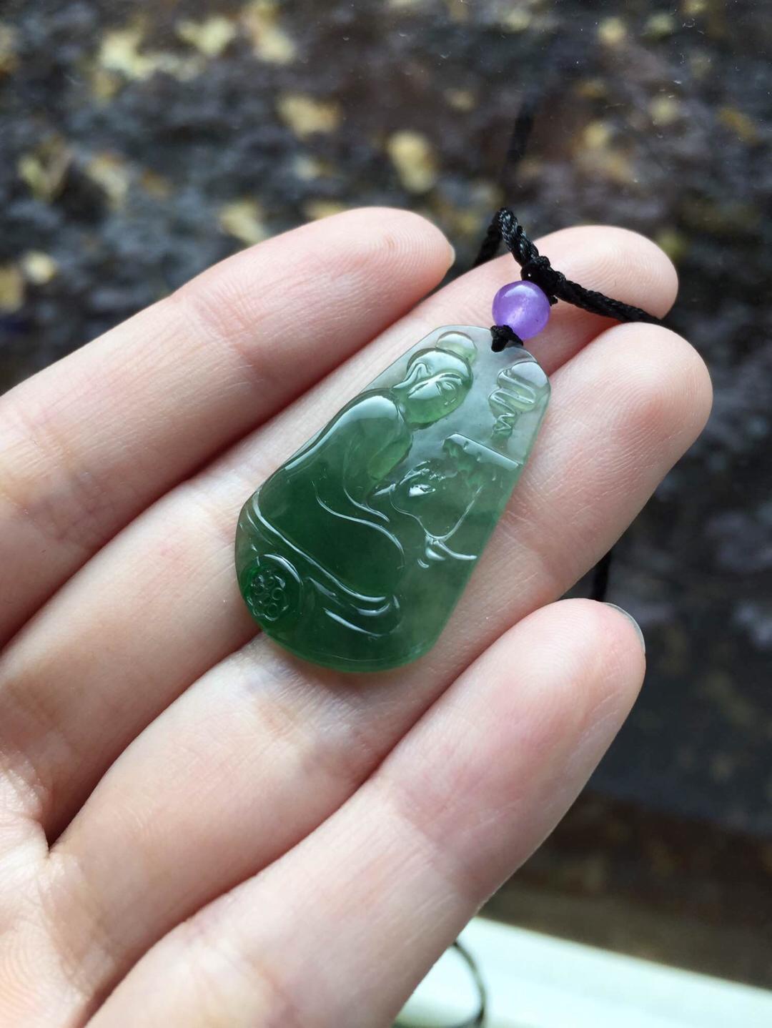 高冰种晴水翡翠一念菩提。实在太特别了,种水色工俱佳,31.7*18.6*4mm。种水贼好,高冰原生矿,晴水绿漂亮,种气极寒,荧光四射,雕工棒,线条间完美呈现那只可意会不可言传的神韵,一念菩提,不可多得的特色精品,推荐