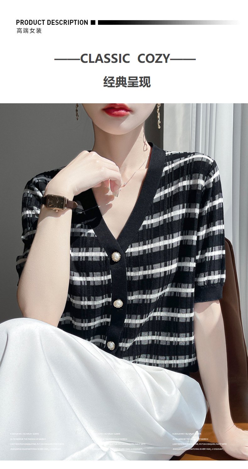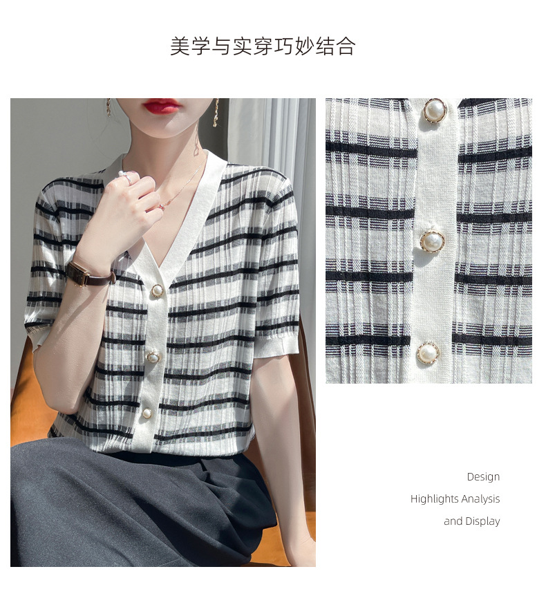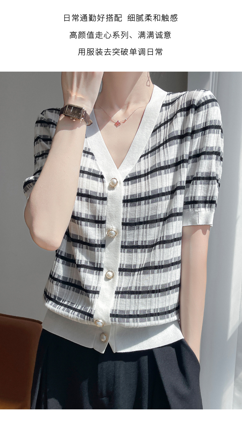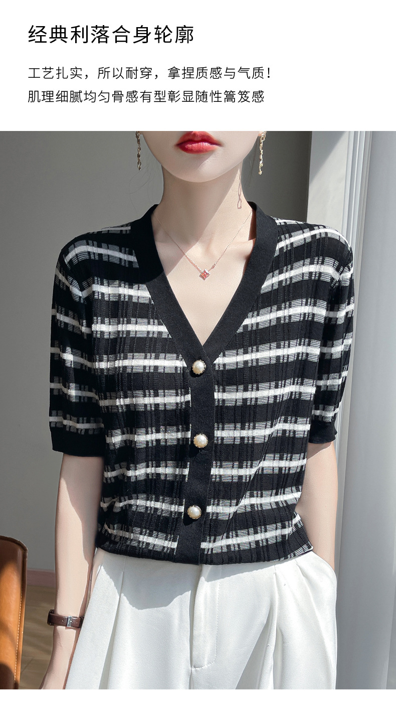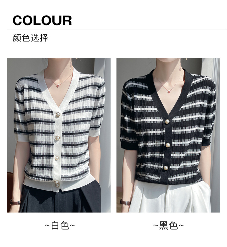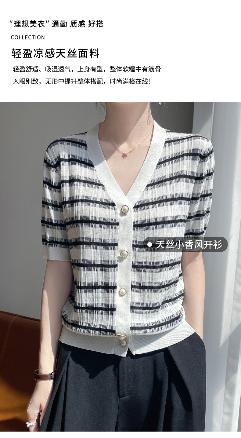 【天丝小香风珍珠扣开衫V领】夏清爽天丝开衫短袖女V领坎肩外搭条纹拼色曲珠针织半袖T恤空调衫