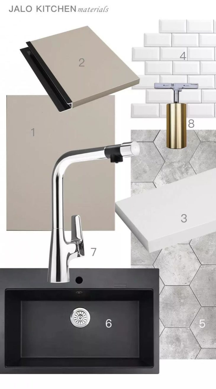 我们做了一张图,把根据这款门板组成的橱柜和厨房,做了一个材料展示。从1到7种材料的分别是:门板(咖色)、隐藏式拉手、20mm的戈兰迪石英石台面。上下柜之间建议选面包砖,地上用水泥六角砖、花岗岩水槽、极简风格的厨房龙头(我们的B款龙头)、金色轨道射灯。所有这些材料,目前我们已经都能提供