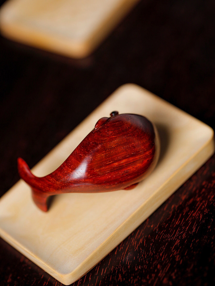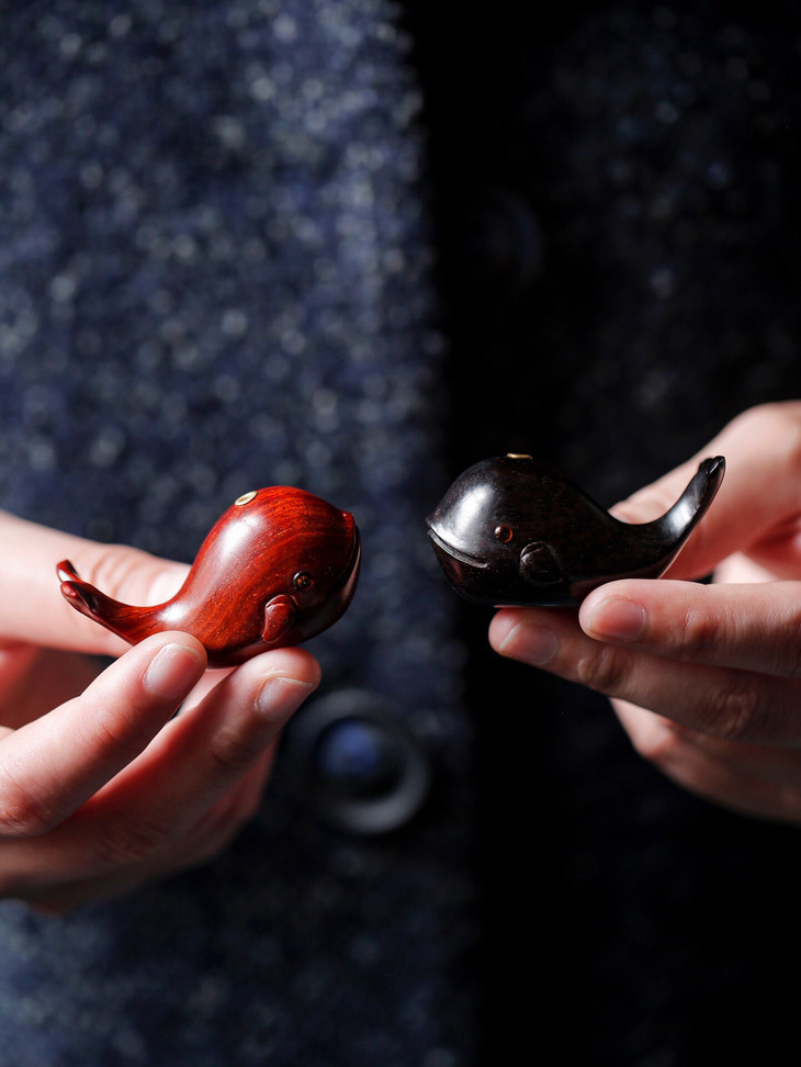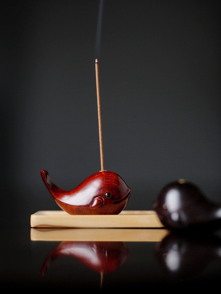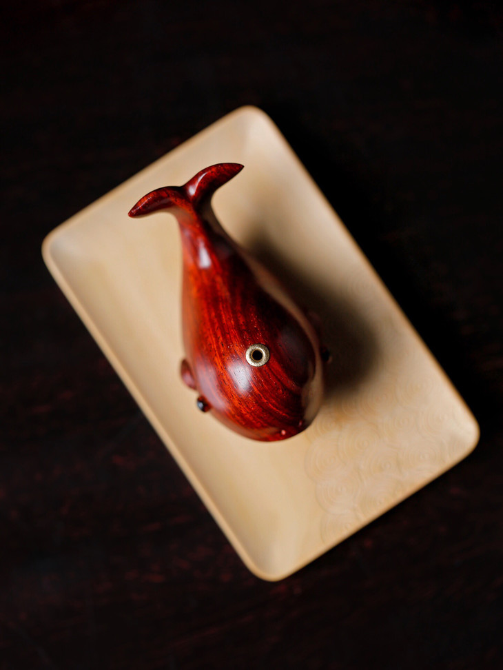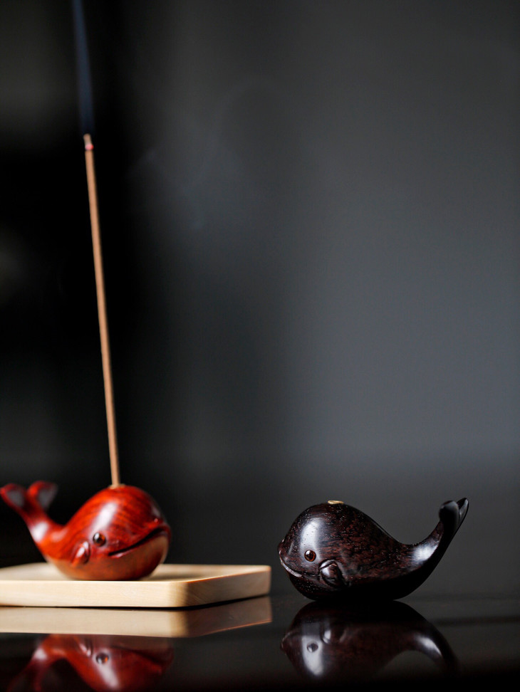 这一款鲸鱼的香插,可以说是非常的呆萌了,萌萌的鲸鱼,让你看着就心生欢喜。宝贝以紫檀、紫光檀两种材质制作而成,都比较贵气,韵味十足。点一柱清香,香雾缭绕,禅意十足,很适合大家日常的欣赏把玩。