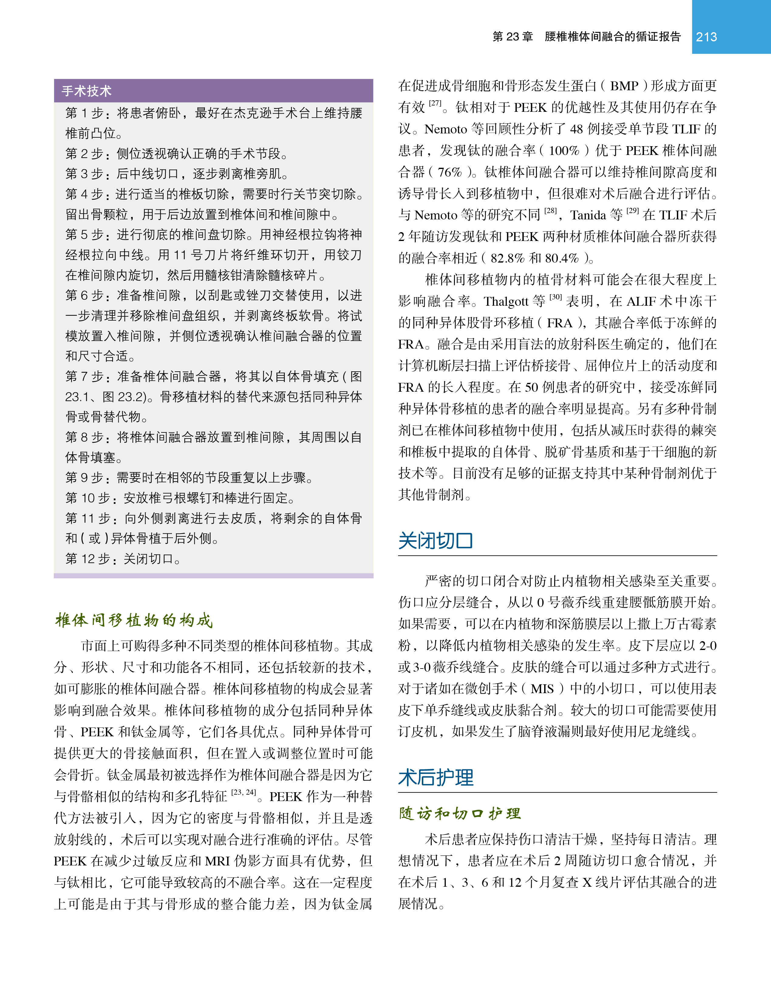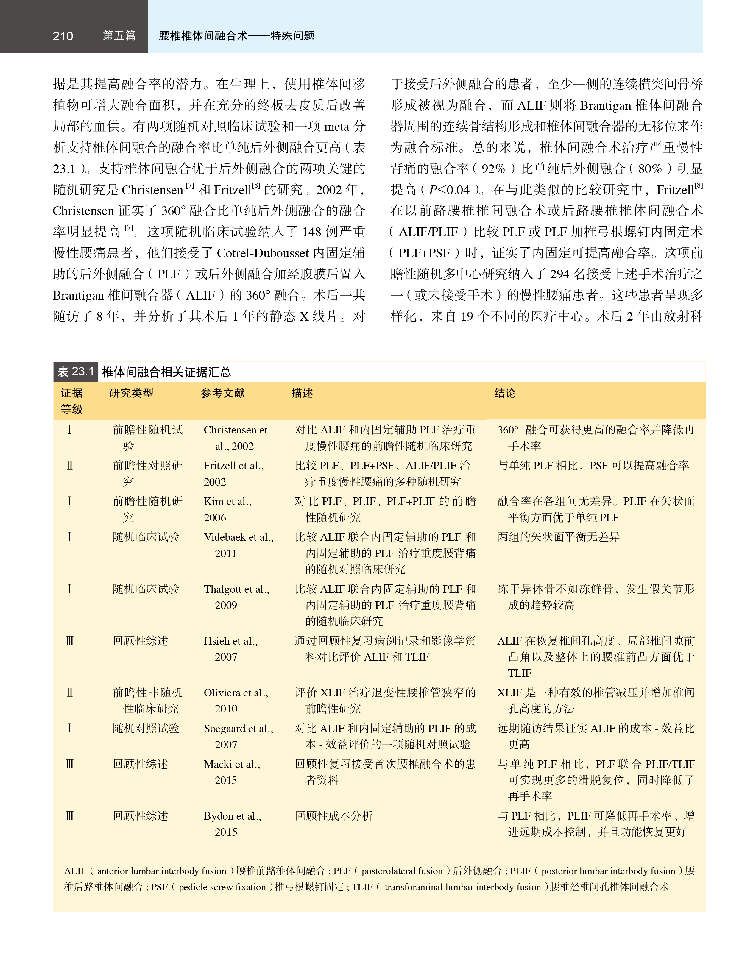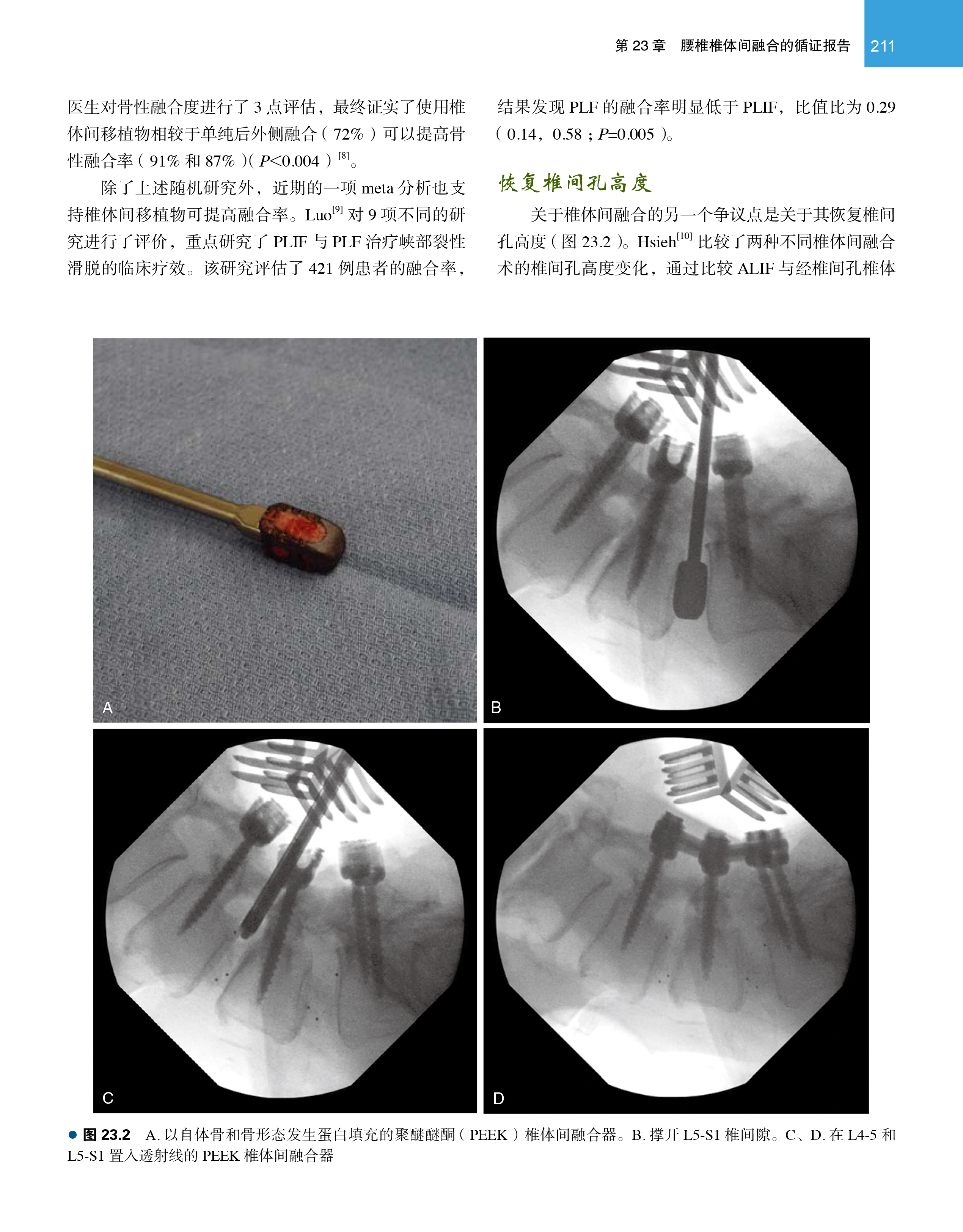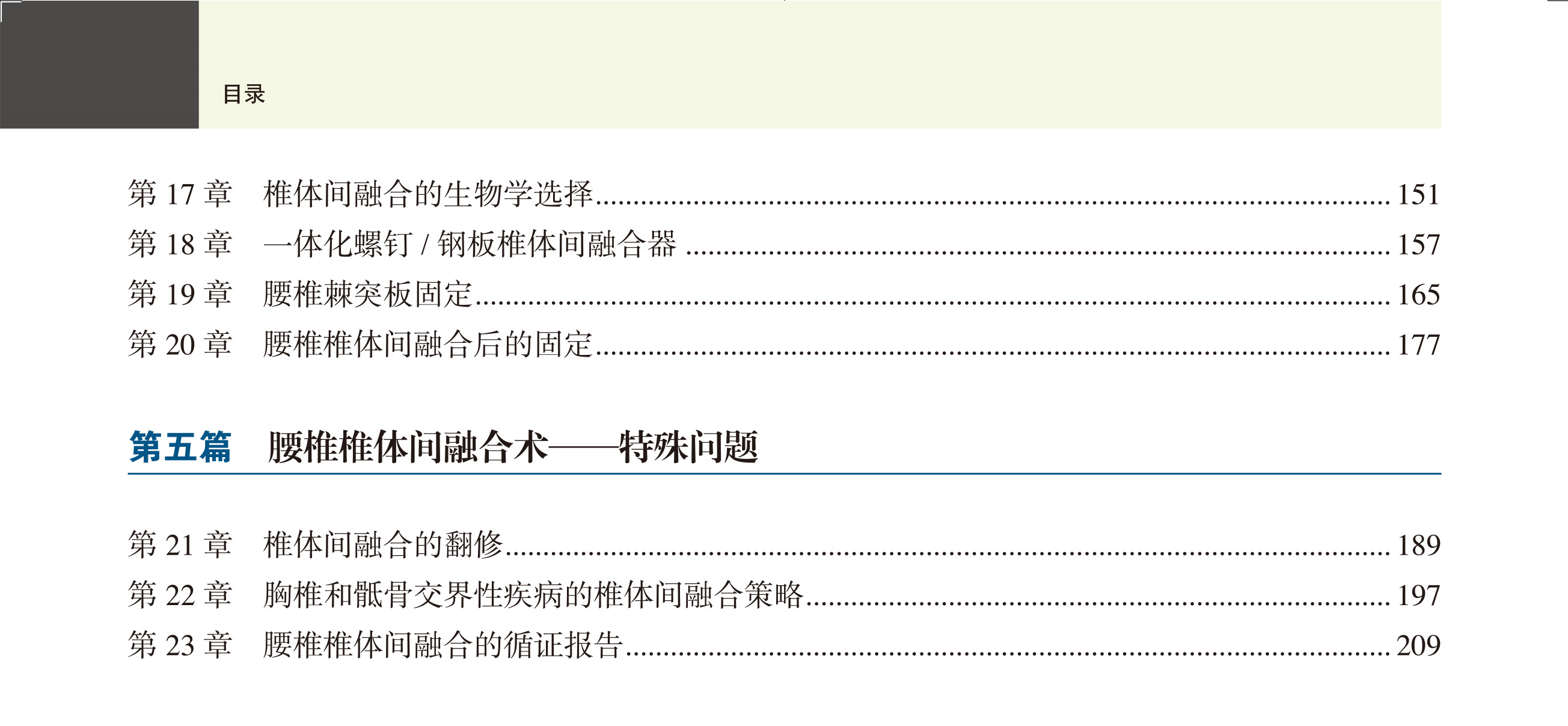 脊柱外科的迅速发展是从神经减压逐步开始的,从腰椎的椎间盘切除、椎板减压,到颈、胸脊髓的减压手术,临床医生在减压技术以及手术入路方面进行了深入的探索。但随着神经减压手术的普及,椎板减压术后出现的医源性不稳定带来许多临床问题。脊柱外科医生逐步认识到脊柱稳定性的重要意义,脊柱固定融合手术逐步成为临床重要的治疗手段。从后外侧植骨融合、椎间PLIF 和TLIF 植骨融合,到前路椎间植骨融合、侧前方入路椎间植骨融合等,腰椎融合术式不断丰富。近年来随着微创技术的发展,导航技术辅助和微创镜下融合技术也得到了越来越多的关注和应用。与此同时,不同植骨材料的涌现也为脊柱融合手术提供了更多的选择。本书为一本关于腰椎椎体间融合技术的译著,全面介绍了腰椎椎体间融合技术的发展、器械、技术、方法、疗效等。后外侧植骨融合、后路腰椎椎体间融合和经椎间孔腰椎椎体间融合和前路腰椎椎体间融合、侧前方入路腰椎椎体融合术等。
