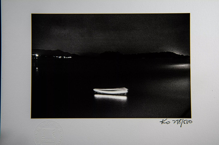 此作品是60名家作品中的其中之一,作者早在80年代作为最早一批进入中国大陆拍摄的香港摄影师,他为那个刚刚开启改革智慧的社会留下了非常多珍贵的纪实影像,他的镜头语言飘忽而神秘带有说不清道不明的超现实主义色彩。而本幅作品——舟,却是难得的更突出写意的作品之一。在夜色中,一艘发着光的小船静静的漂在湖面,说是漂更像是被放在了水面上,湖面没有一丝波动,光线勾勒出小船的形状并倒映在湖面,让画面更显宁静致远,让人更感沉淀抚慰。