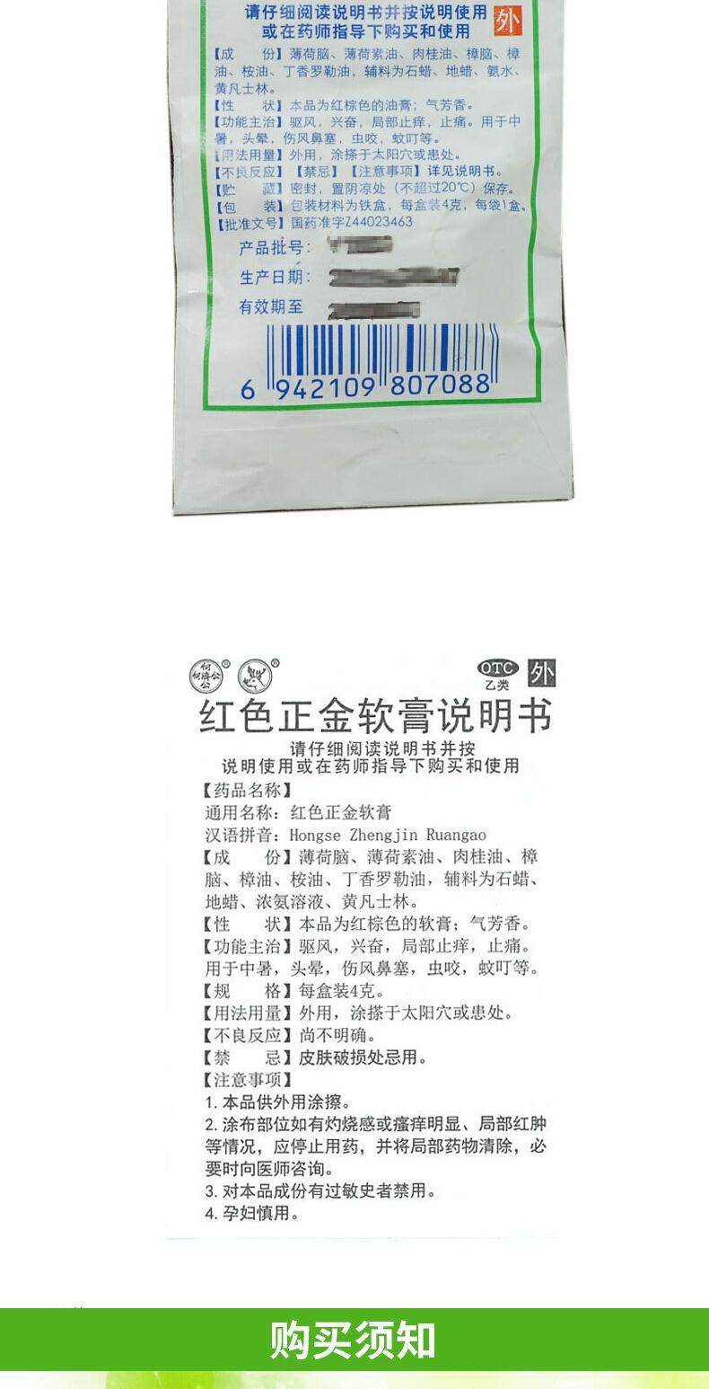 白云山 红色正金软膏4g 驱风止痒止痛 蚊虫叮咬中暑头晕伤风鼻塞