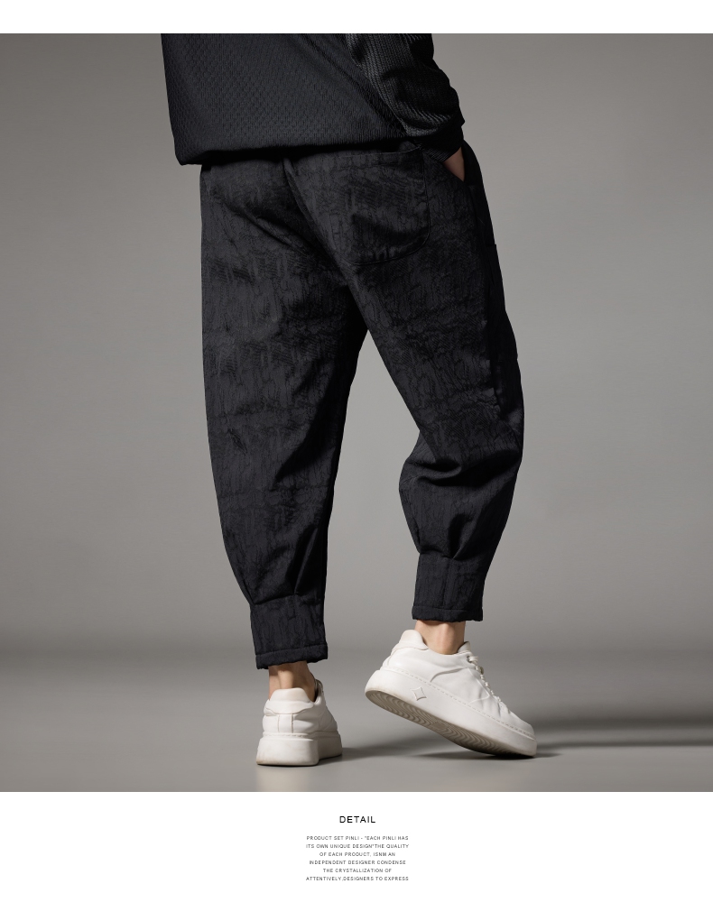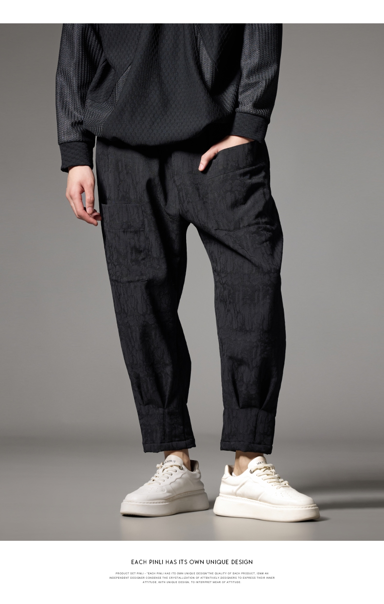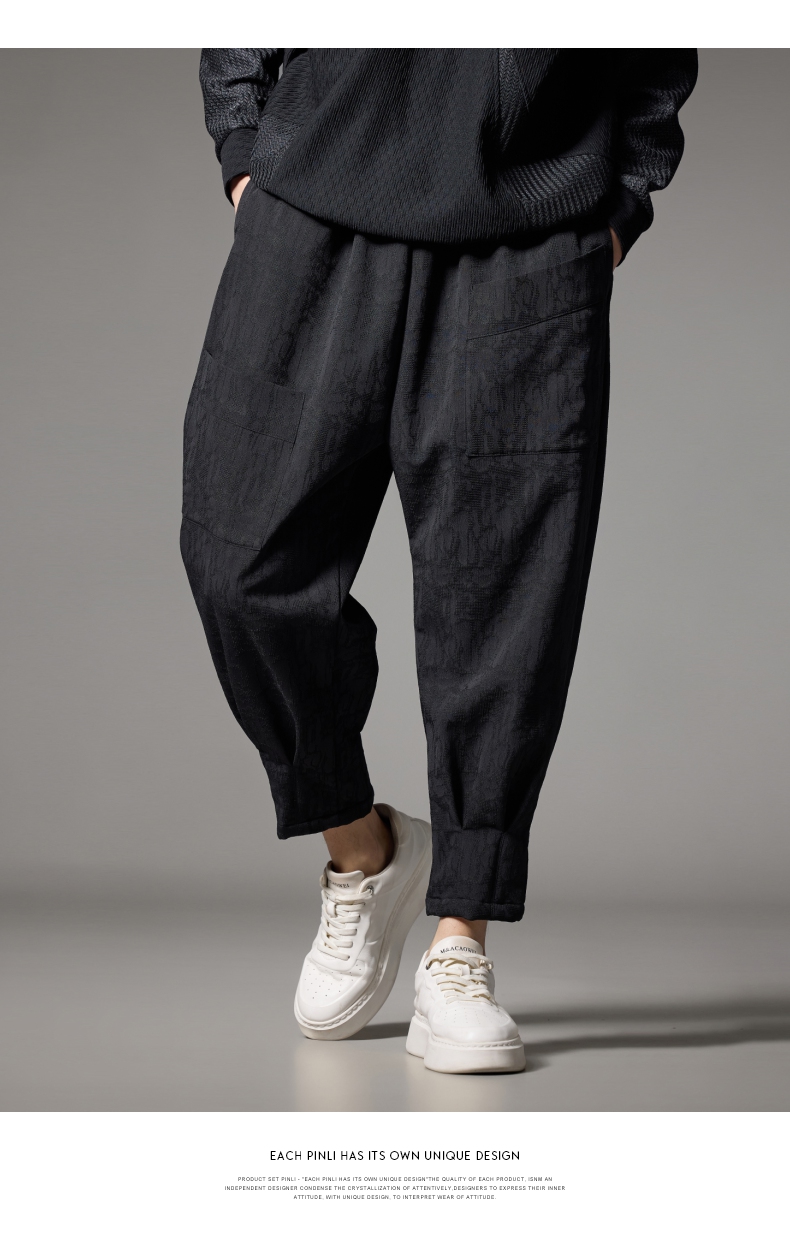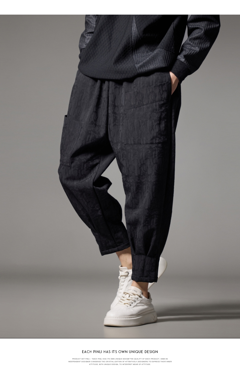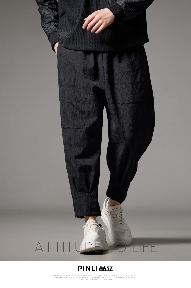 PINLI品立秋冬新款加绒加厚束脚九分裤男暗纹潮牌宽松休闲裤B243117050