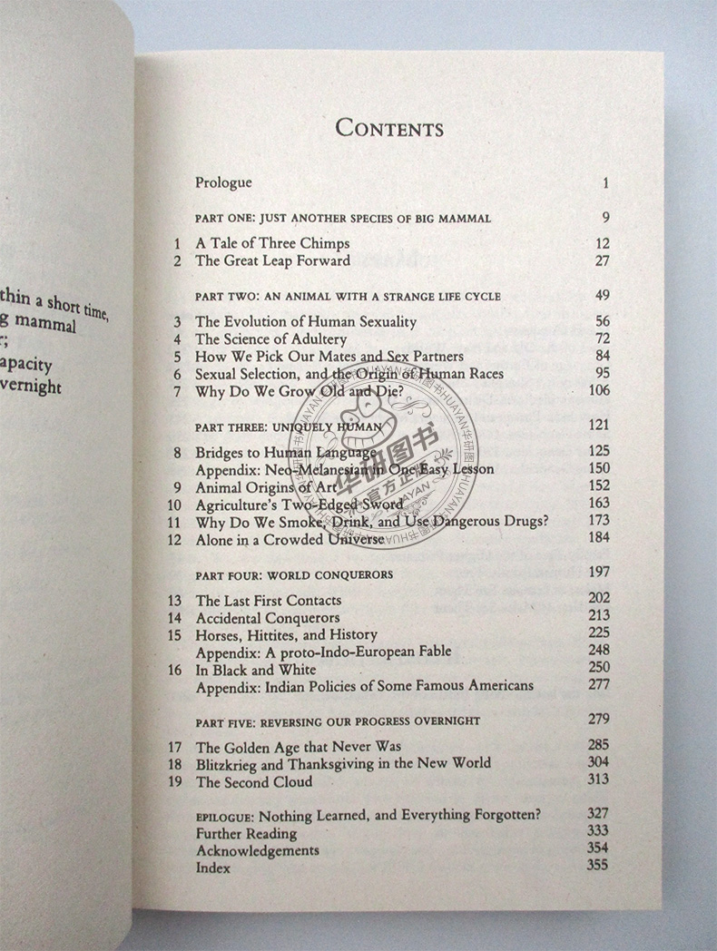 全书分成五个部分讨论,回顾了人类的兴亡史。人类从动物界兴起,同时,我们自毁的能力也加速成长。我们面临的问题,的确发轫于动物根源。那些问题跟随着我们,与逐渐增长的力量和人口一起成长,现在更是以惊人的速度膨胀得厉害。