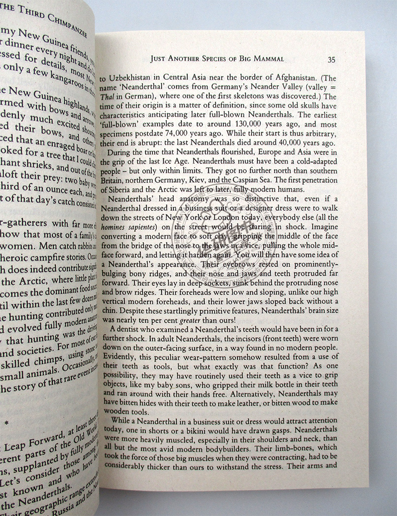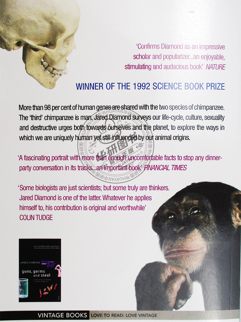 The Rise And Fall Of The Third Chimpanzee《第三种黑猩猩:人类的身世与未来》是戴蒙德教授第1本为知识大众写的书,也是他首次获得英国科普图书奖的作品。书中的一些重要论点,在其后的《枪炮、病菌与钢铁》以及《崩溃:社会如何选择成败兴亡》中做了更完整的铺陈,被合称为“人类大历史三部曲”。