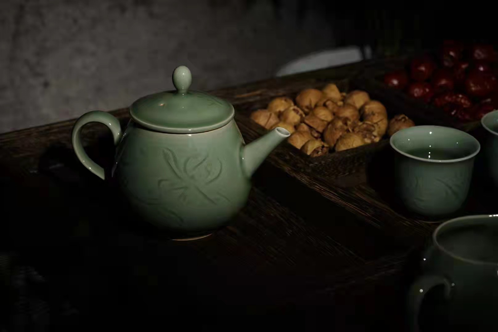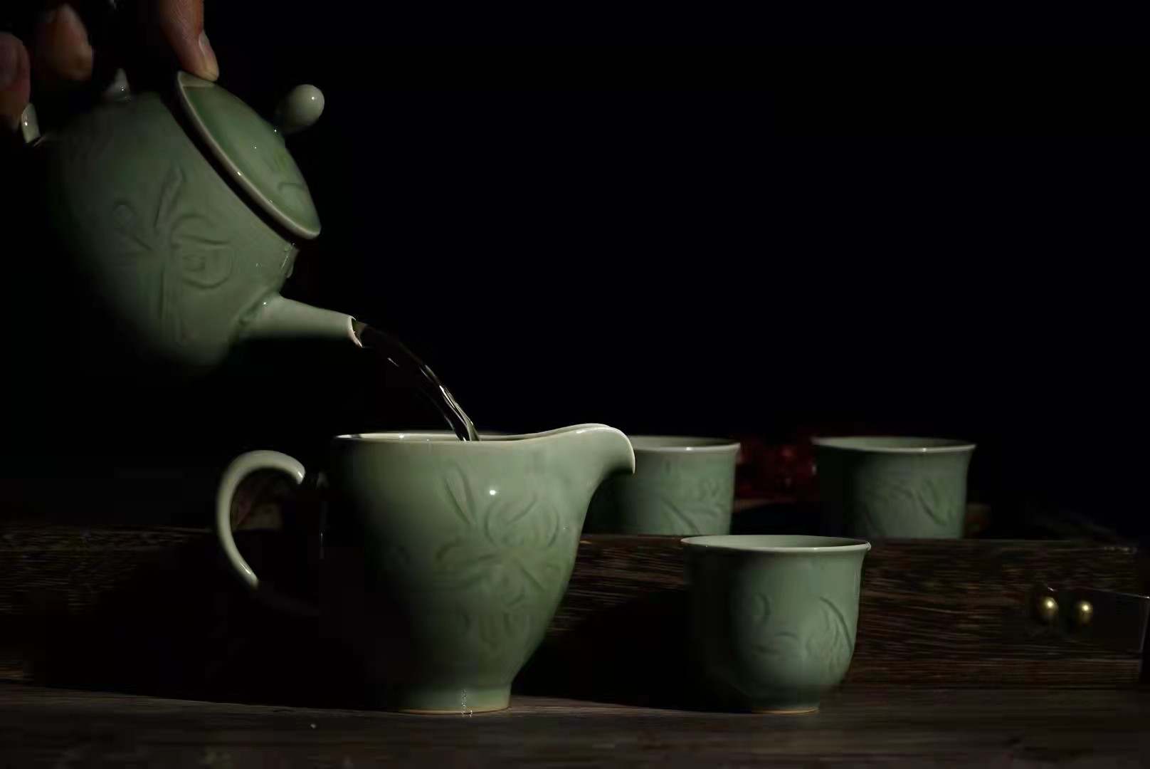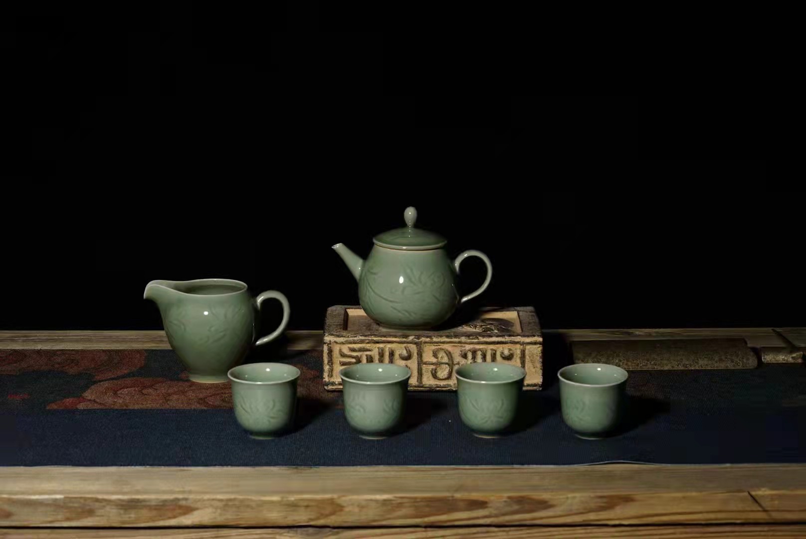 《荷韵茶具》由壶、公道壶、茶杯组成,茶具表面手工半刀泥刻划荷花纹,施梅子青釉,青碧如玉清雅高洁,诠释了禅茶一味的内涵。