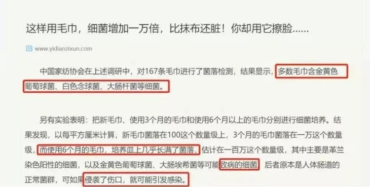中国家纺协会在调研中对167条毛巾进行了菌落检测,结果显示:多数毛巾含金黄色葡萄球菌、白色念球菌、大肠杆菌等细菌。