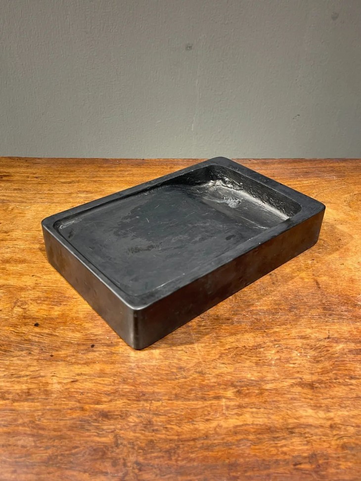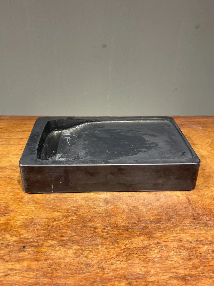 此歙砚取材纯净无瑕的天然歙石,雕琢成长方形砚台,比例和谐、造型简约典雅,整体风格文人气质明显,琢工艺精湛,多年使用移留墨渍更显文气,是一方年代近百年的老歙石砚,原装老木盒中保留一圆管型小瓶,后上方一悬挂孔眼,可以挂于墙钉上,是可插小花的壁瓶,或是放置毛笔的笔筒。