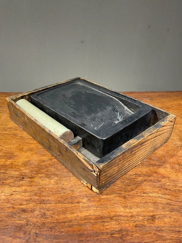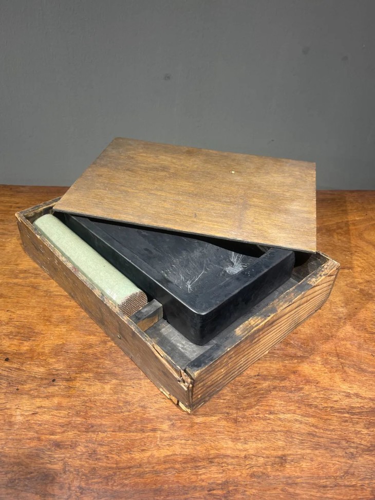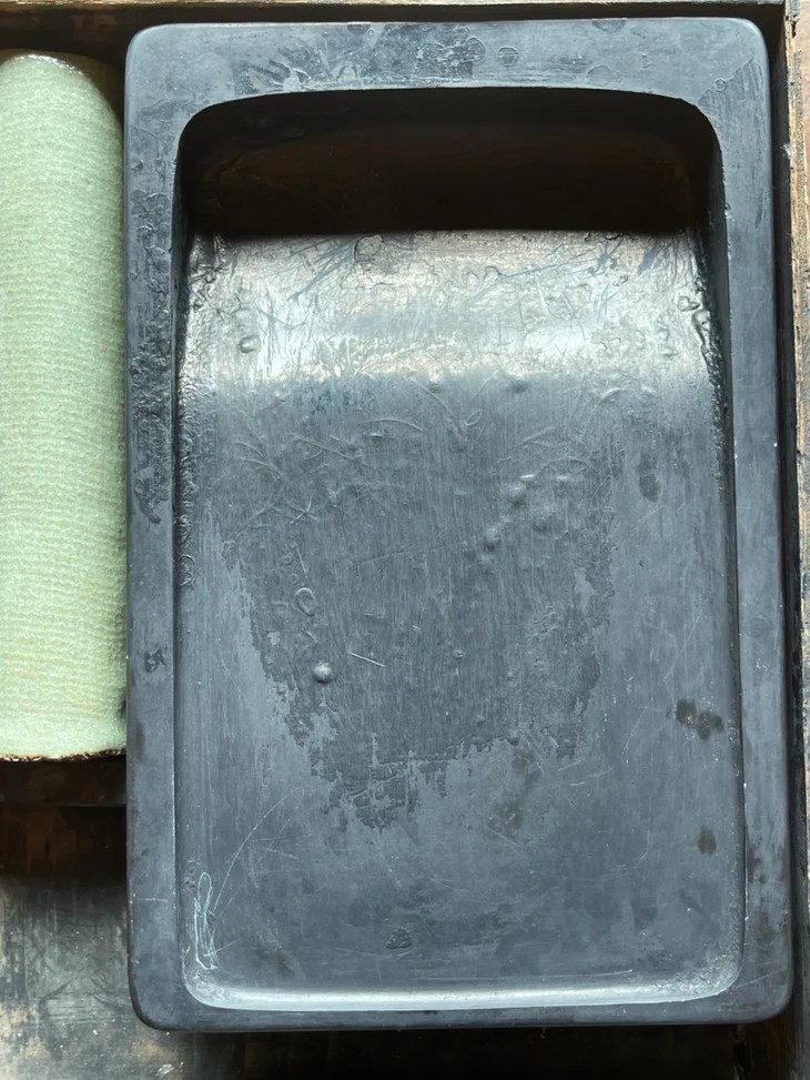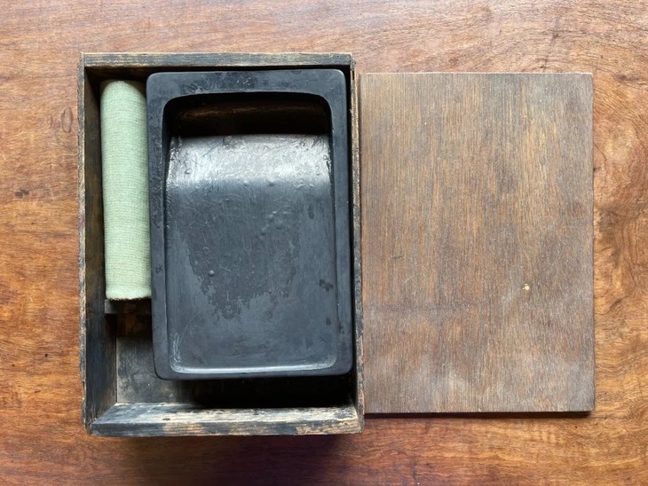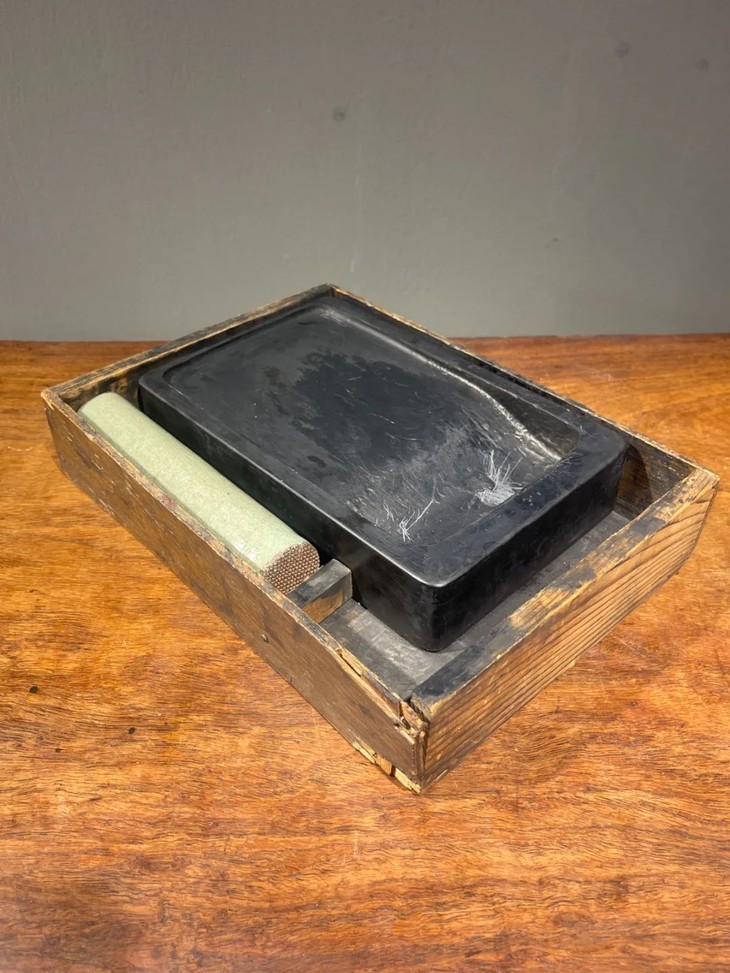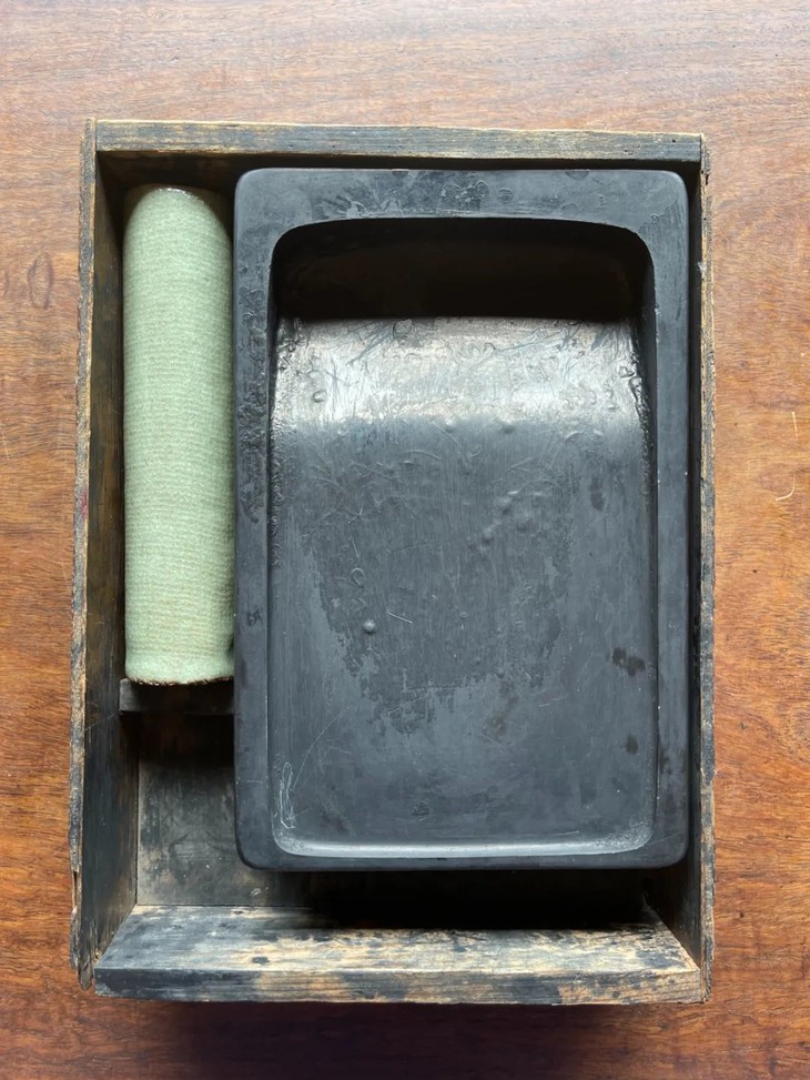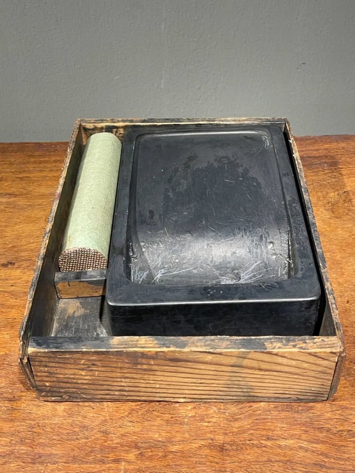 此歙石硯台与青瓷挂瓶硯盒,如图所示,除边沿小磕碰伤与表面正常使用磨损痕迹,以及墨渍外,整体保存完好。保留于原装量身订制的老木盒中。