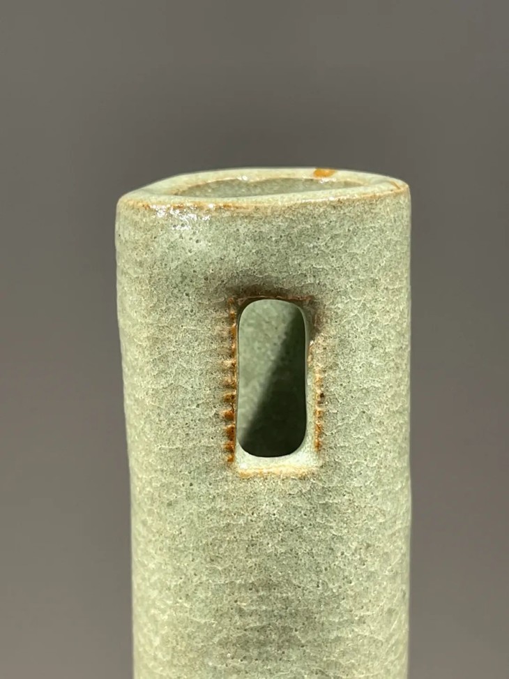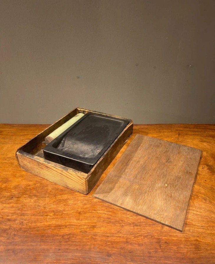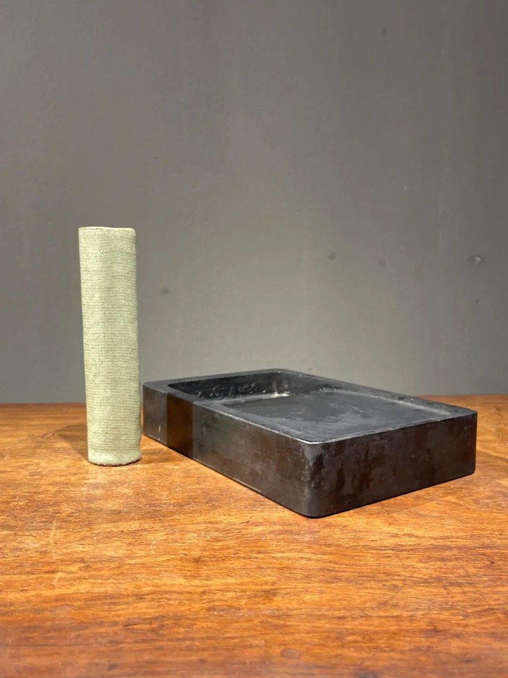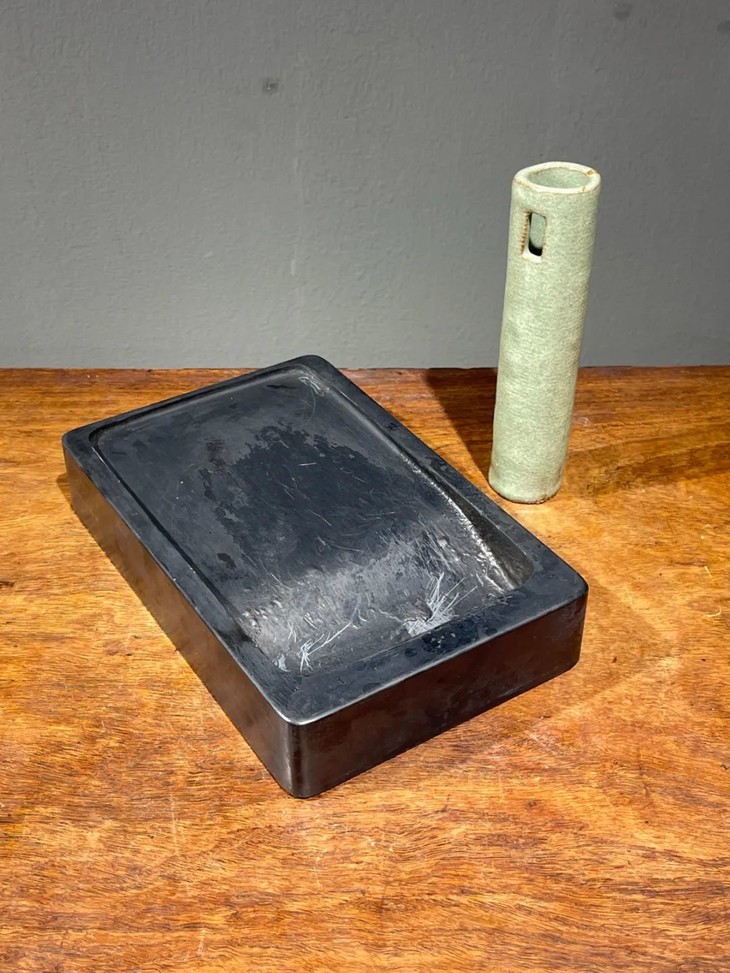 这是一套歙石硯台与青瓷挂瓶硯盒,一件以天然歙石雕琢而成的老砚台,歙石产于产于安徽黄山山脉与天目山、白际山之间的歙州,歙砚的全称歙州砚,与甘肃洮砚、广东端砚、以及黄河澄泥砚齐名为中国四大名砚之一。歙砚为历代文人所称道。南唐后主李煜说“歙砚甲天下”;苏东坡评其“涩不留笔,滑不拒墨,瓜肤而縠理,金声而玉德”;米芾说:“金星宋砚,其质坚丽,呵气生云,贮水不涸”, 保存于木盒中的另一件文房用具是青瓷圆管型挂瓶或是笔筒。