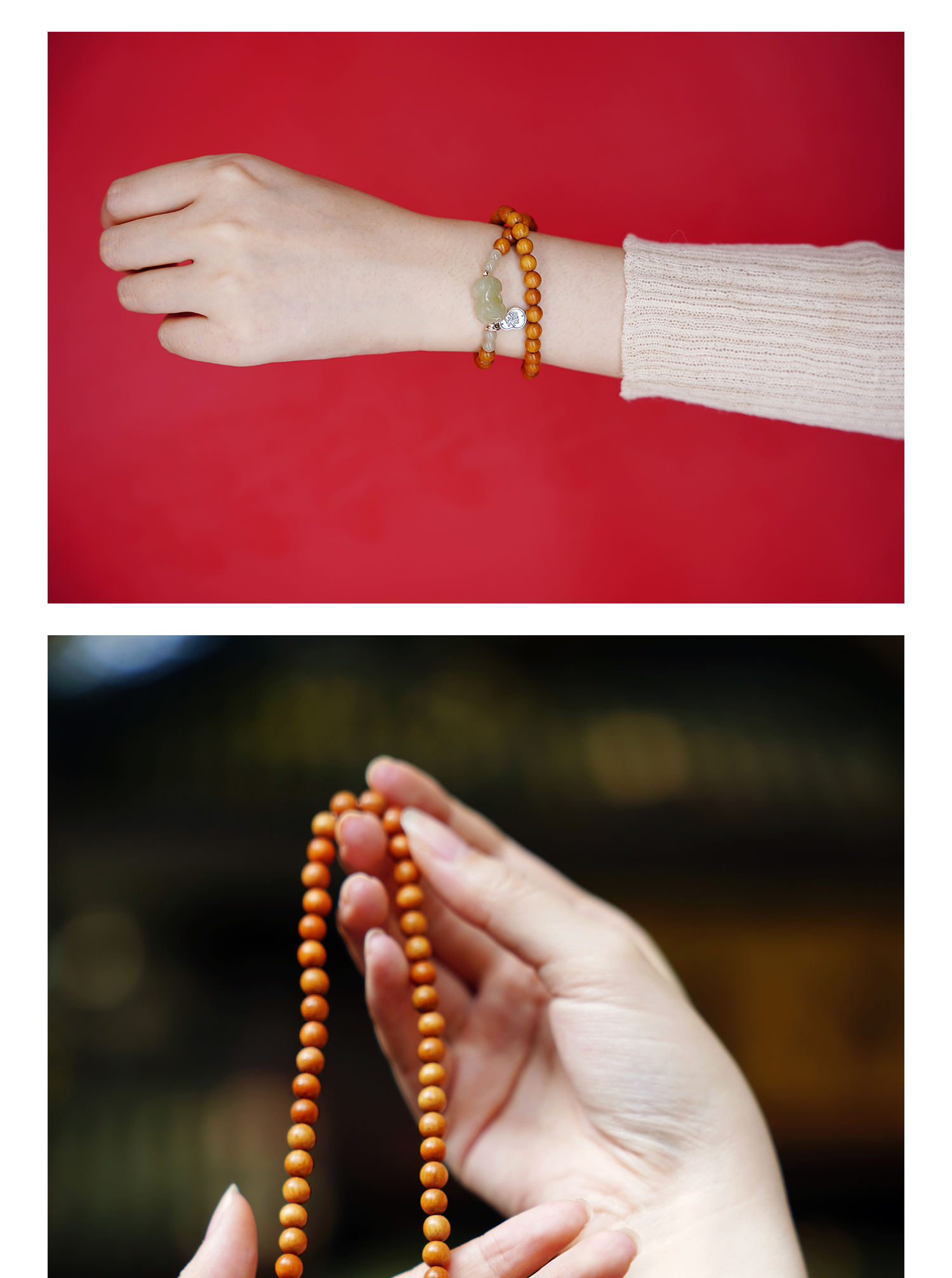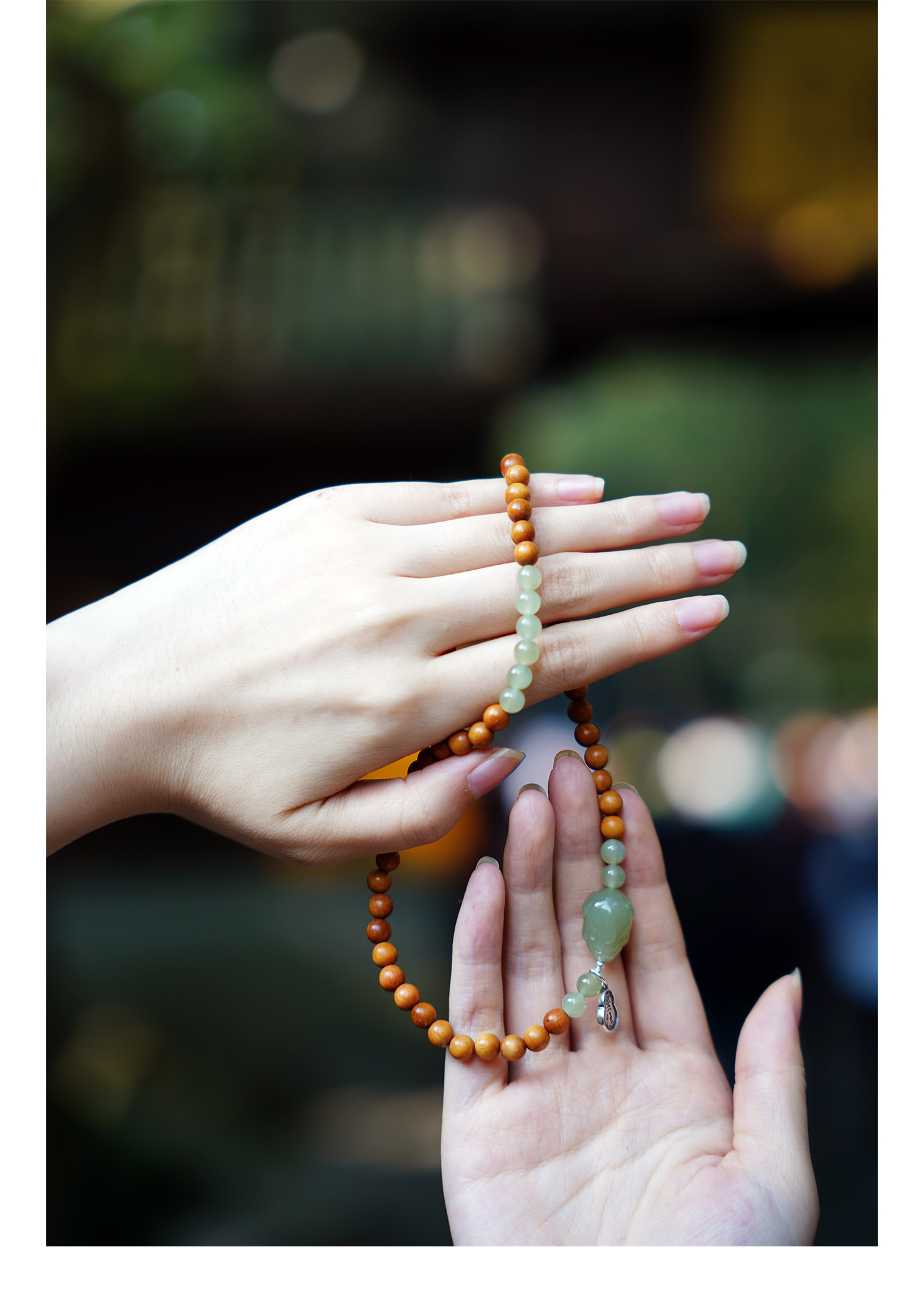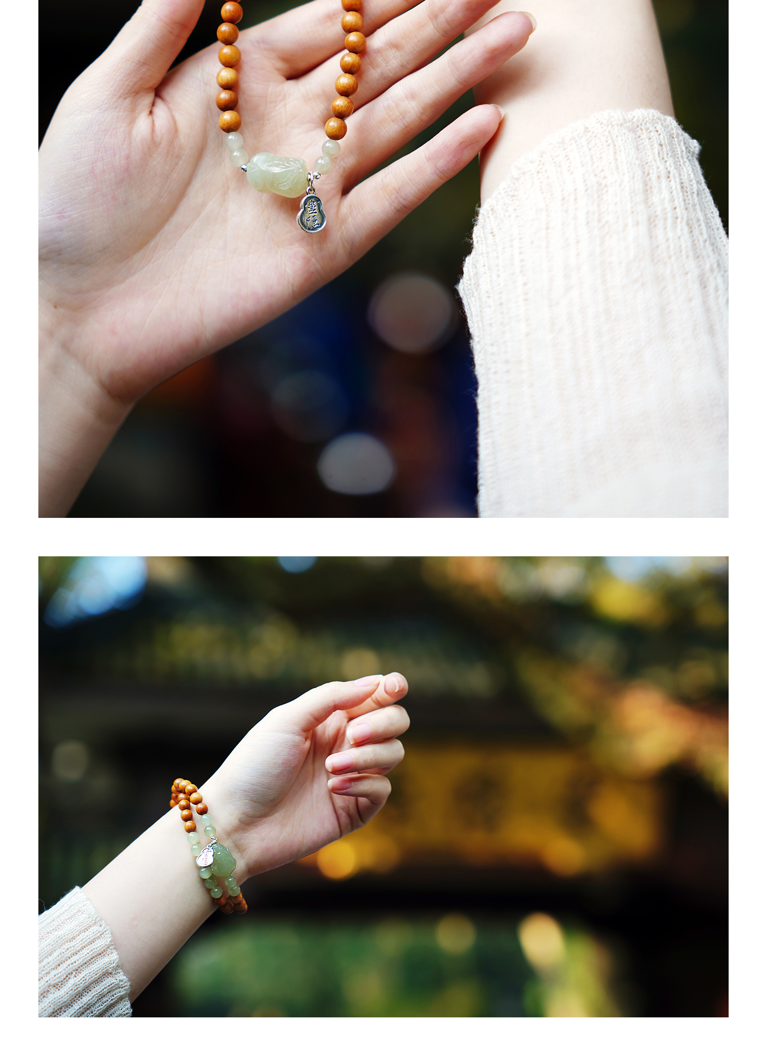 【灵隐景区直发】芭比檀木和田玉双圈手串青山黛中式佛珠女款饰品貔貅坠子串珠